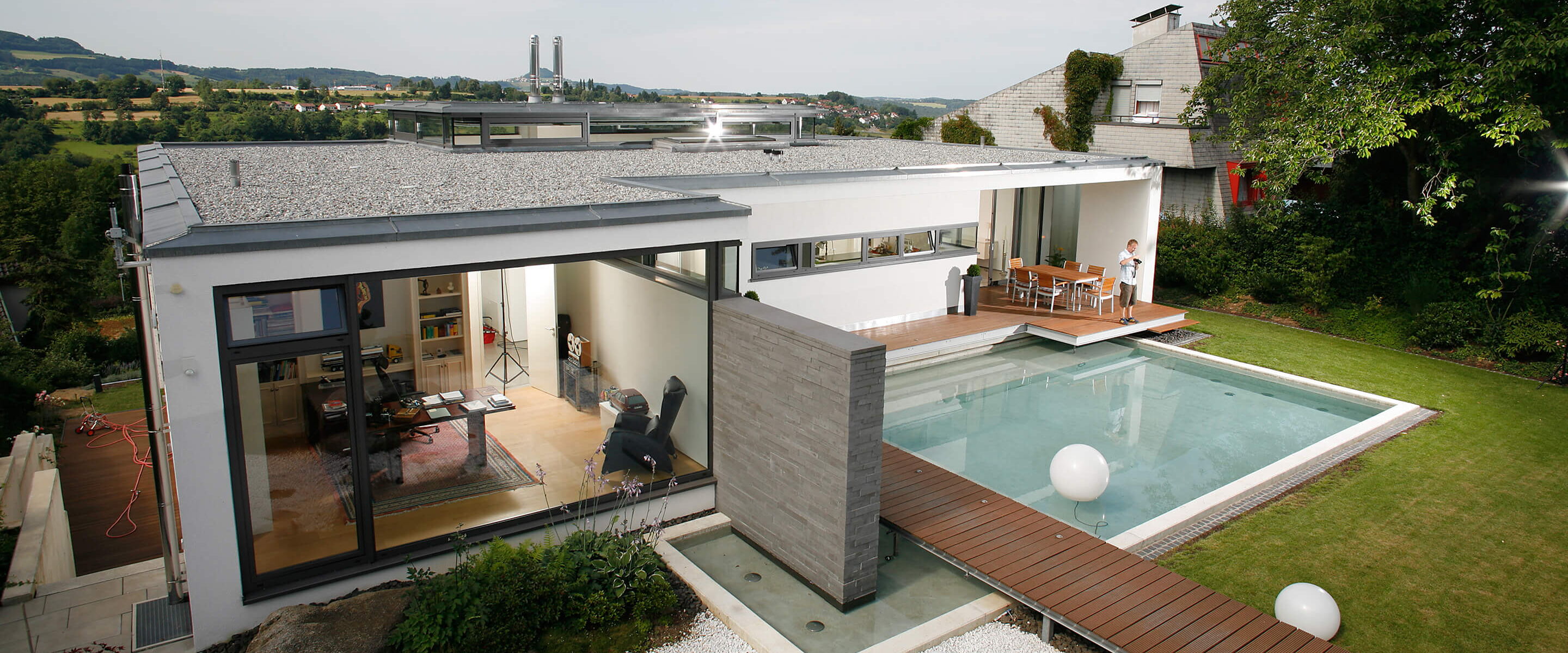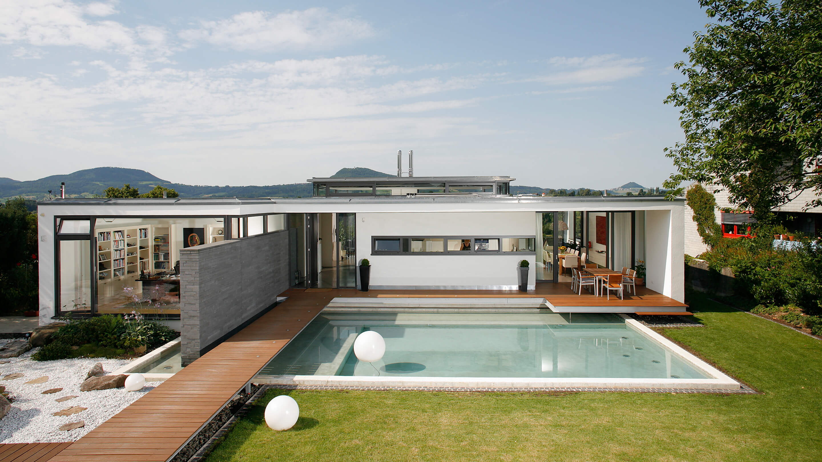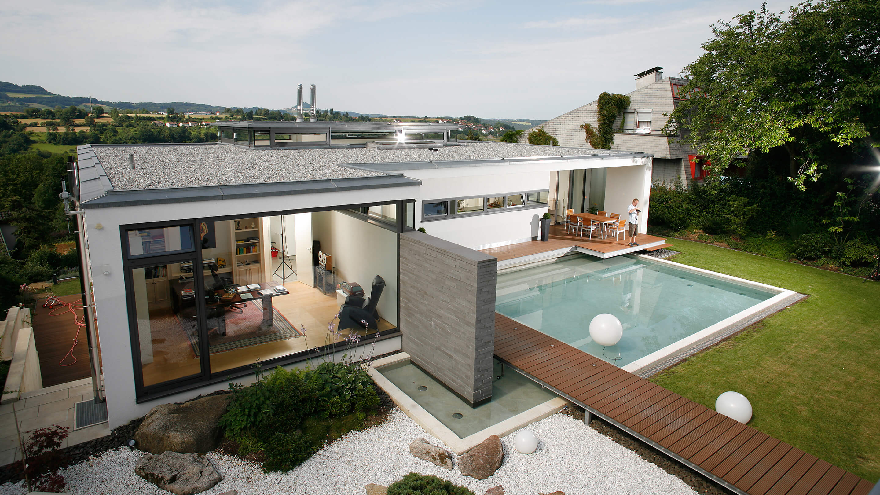 Im schwäbischen Mittelgebirge befindet sich die gelungene Symbiose von Haus und Außenpool, die dem Bauherrn als Rückzugsort mit Aussicht dient.
