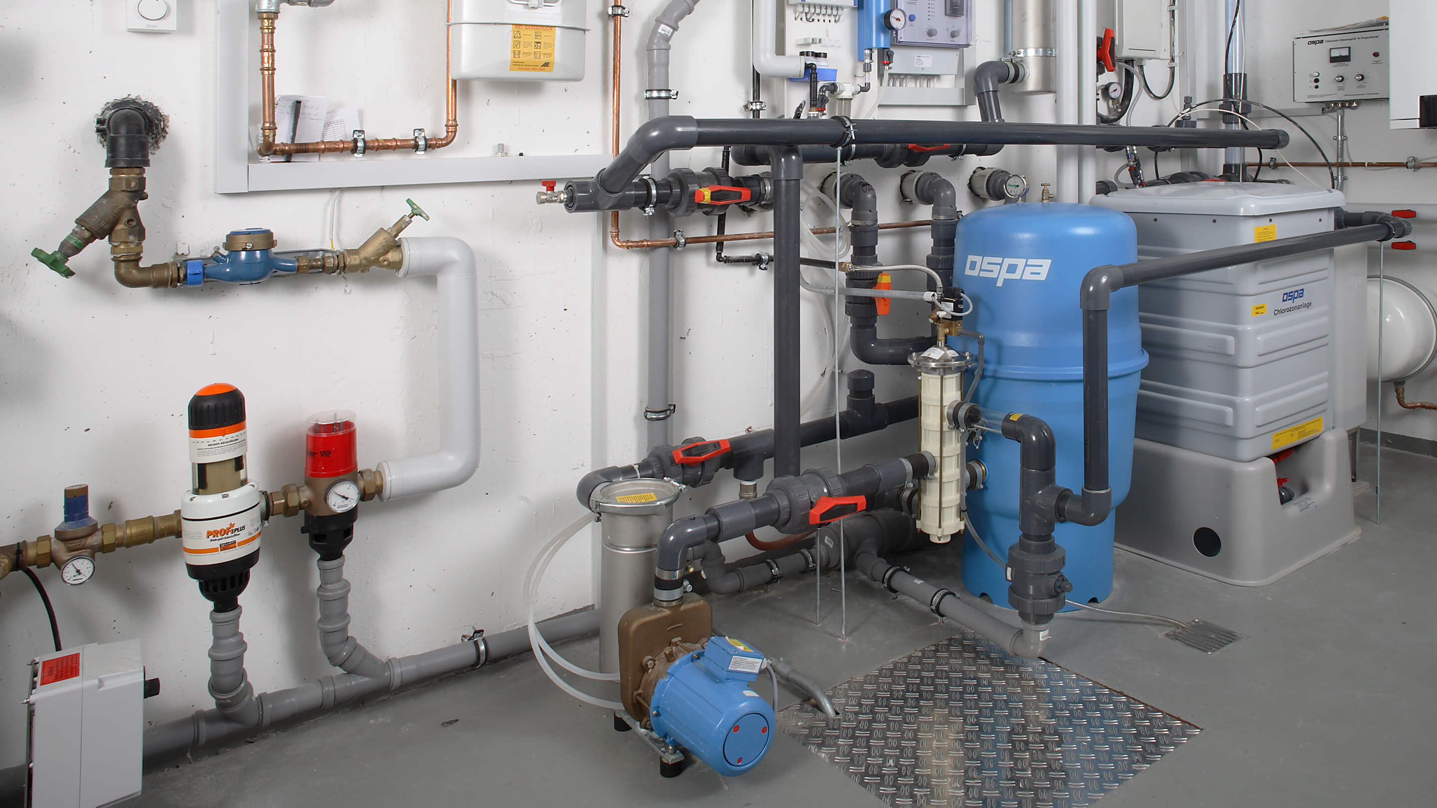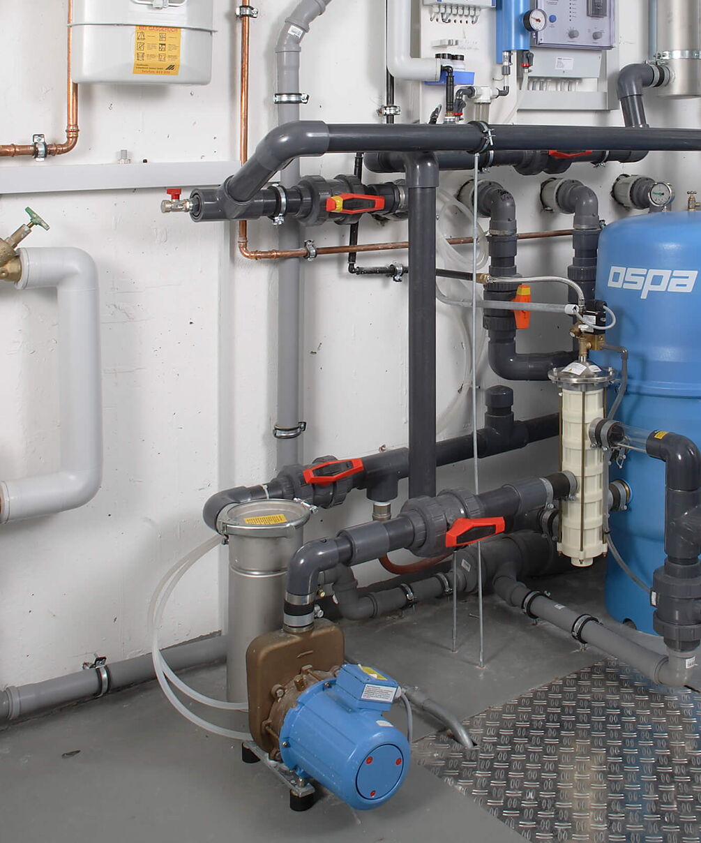 Die Schwimmbadtechnik befindet sich im Untergeschoss des Hauses und arbeitet mit einer beinahe vollautomatischen Ospa-BlueClear®, Ospa-CompactControl® Mess- und Regeltechnik und einer Ospa-Monoblock-Filteranlage mit vollautomatischer Filterspülung.