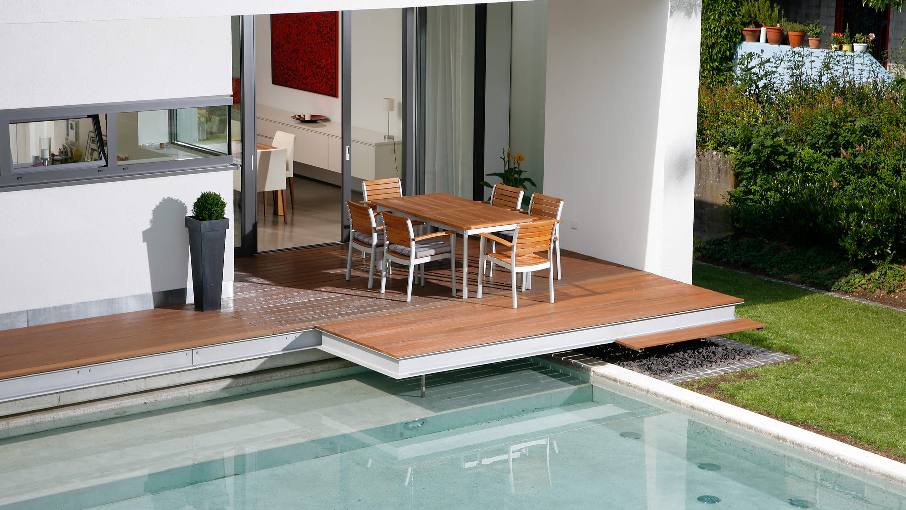 Hier schieben sich das Becken mit breitem Stufenumlauf und Haus beinahe ineinander, verbunden über den hölzernen Steg, der über das Wasser auf die Terrasse führt. Die Farbgestaltung erfolgt weitestgehend über die Materialien: Anthrazitfarbene und weiße Wände, das Holz der Bangkirai-Riffdielen, das Grau der Basaltpflastersteine auf der anderen Seite des ebenfalls grauen Sichtbetonbeckens und das satte Grün des Rasens fügen sich zu einem harmonischen Gesamtbild. Das Wasser der Pools wirkt hell und klar, nicht zuletzt wegen der Unterwasserbeleuchtung.
