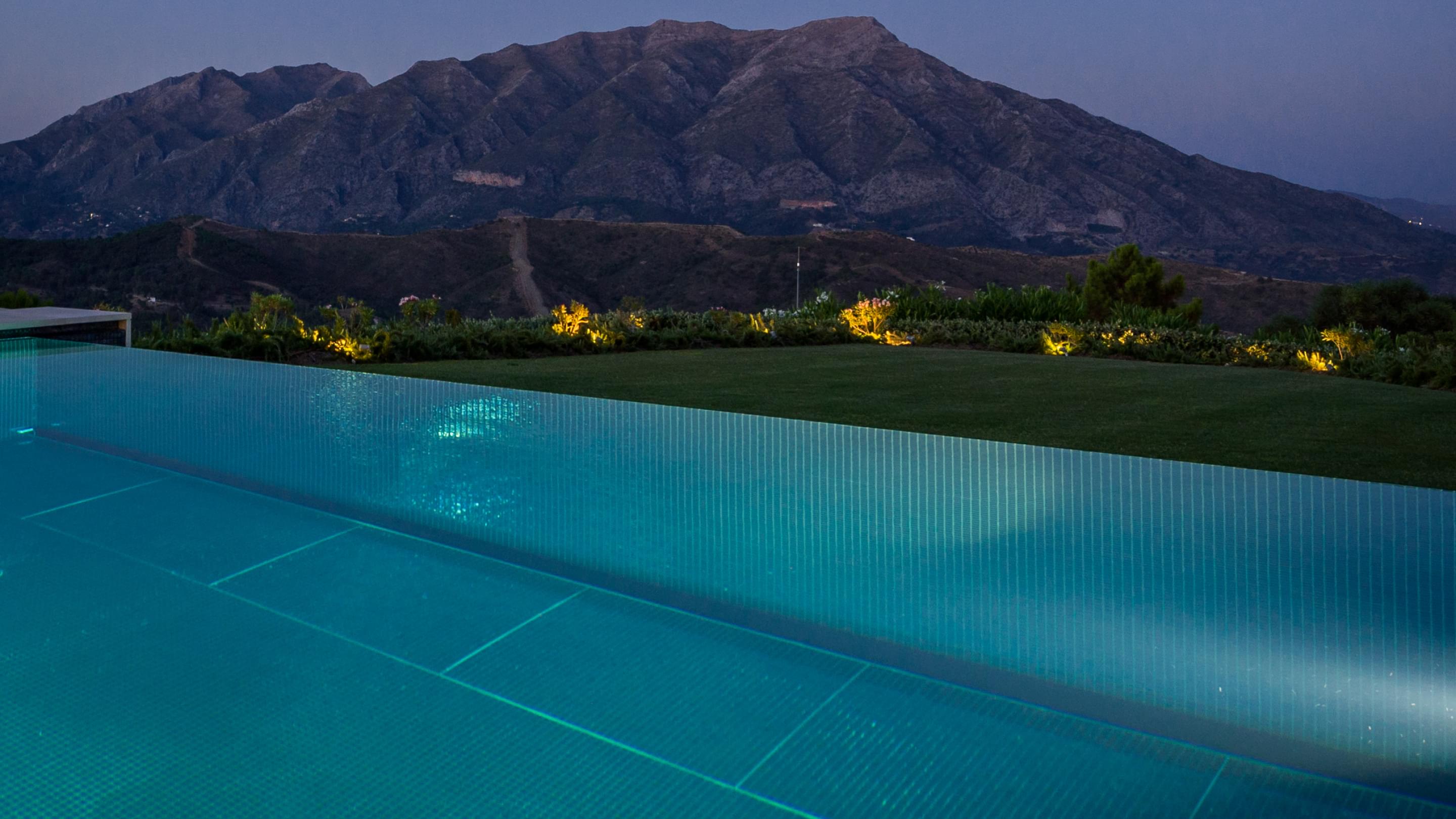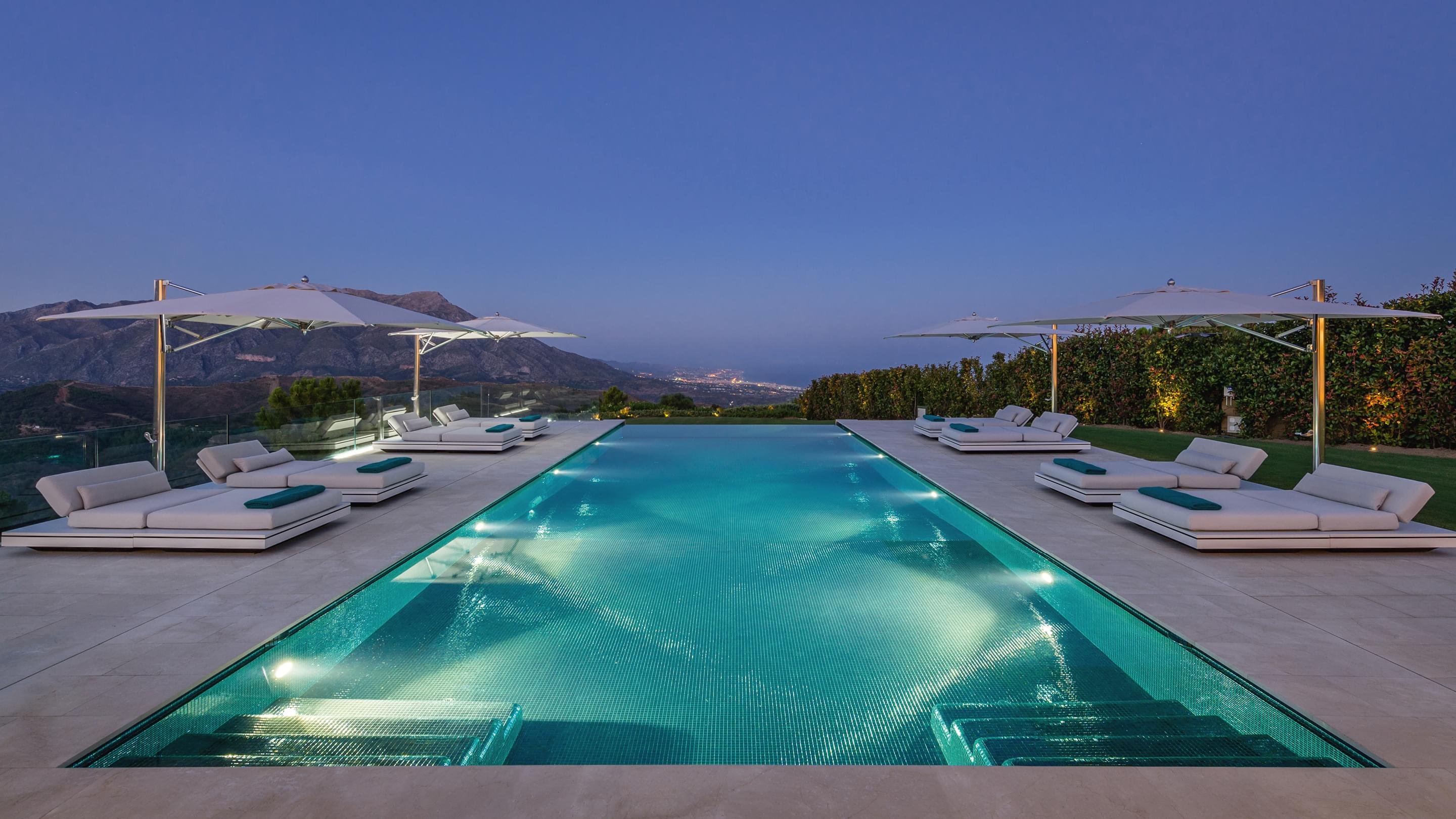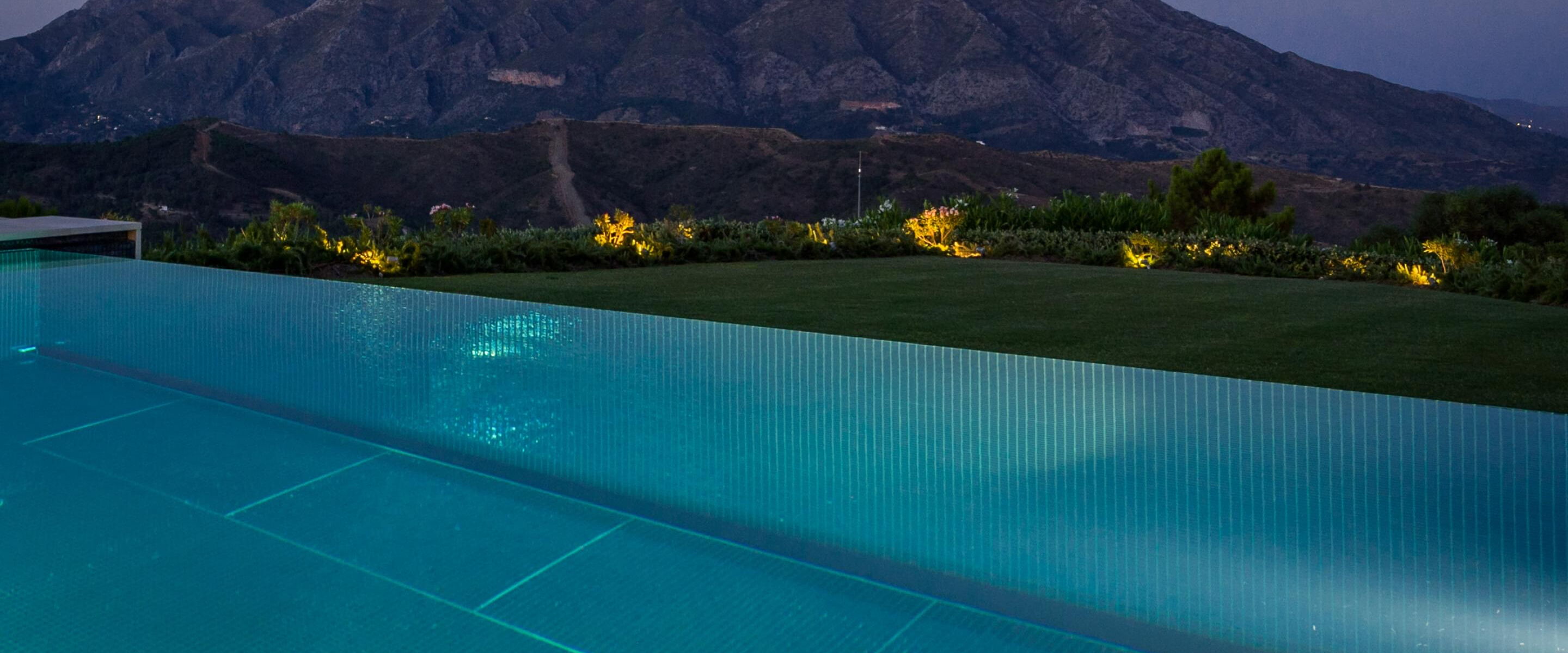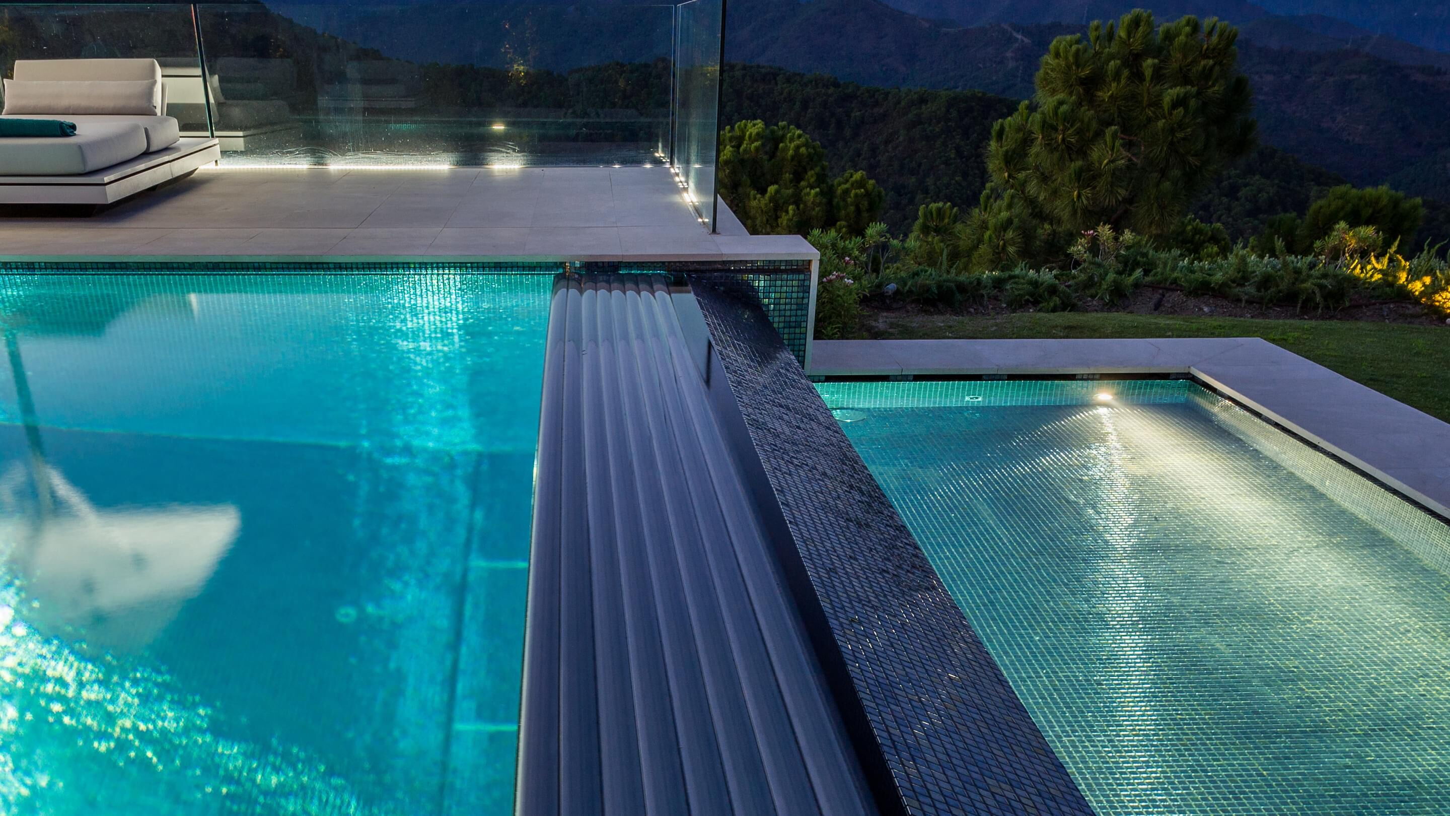 Dieser Outdoor-Pool besticht nicht nur durch seine traumhafte Aussicht, sondern vor allem auch am Abend, wenn die integrierte LED-Beleuchtung das Becken in einem ganz besonderen Licht erstrahlen lässt. Nicht ohne Grund wurde dieser Pool als „Best pool by night“ ausgezeichnet. Für die ausgezeichnete Wasserqualität sorgt die Wasseraufbereitungsanlage von Ospa mit einer EcoClean-Filteranlage, der Desinfektionsanlage OspaBlueClear® sowie der innovativen Ospa-BlueControl®-Schwimmbadsteuerung.