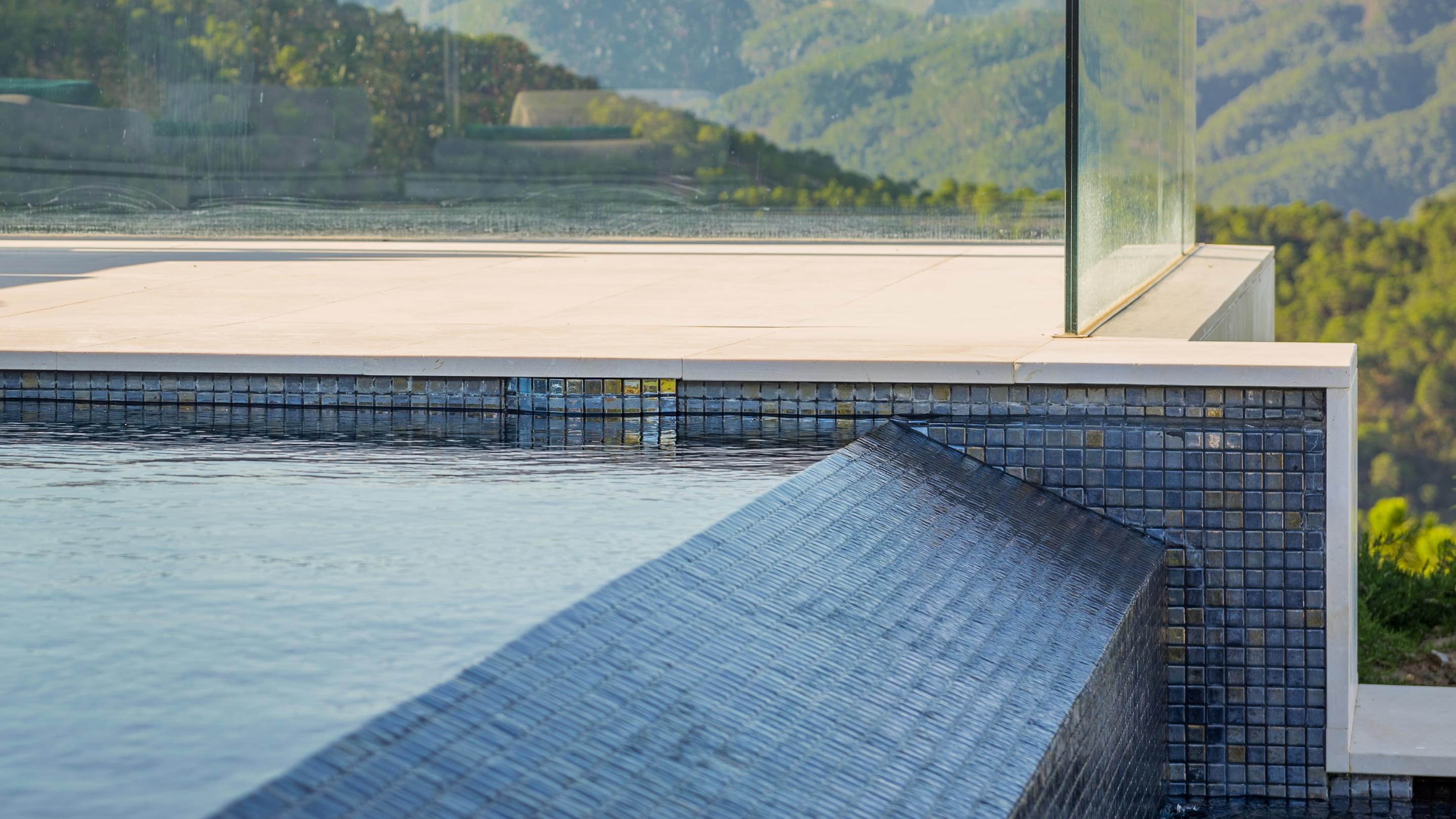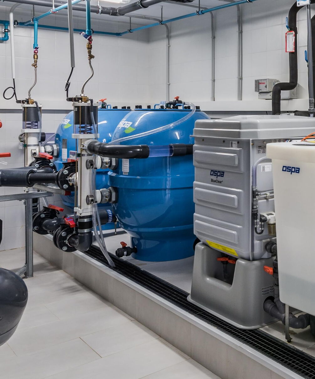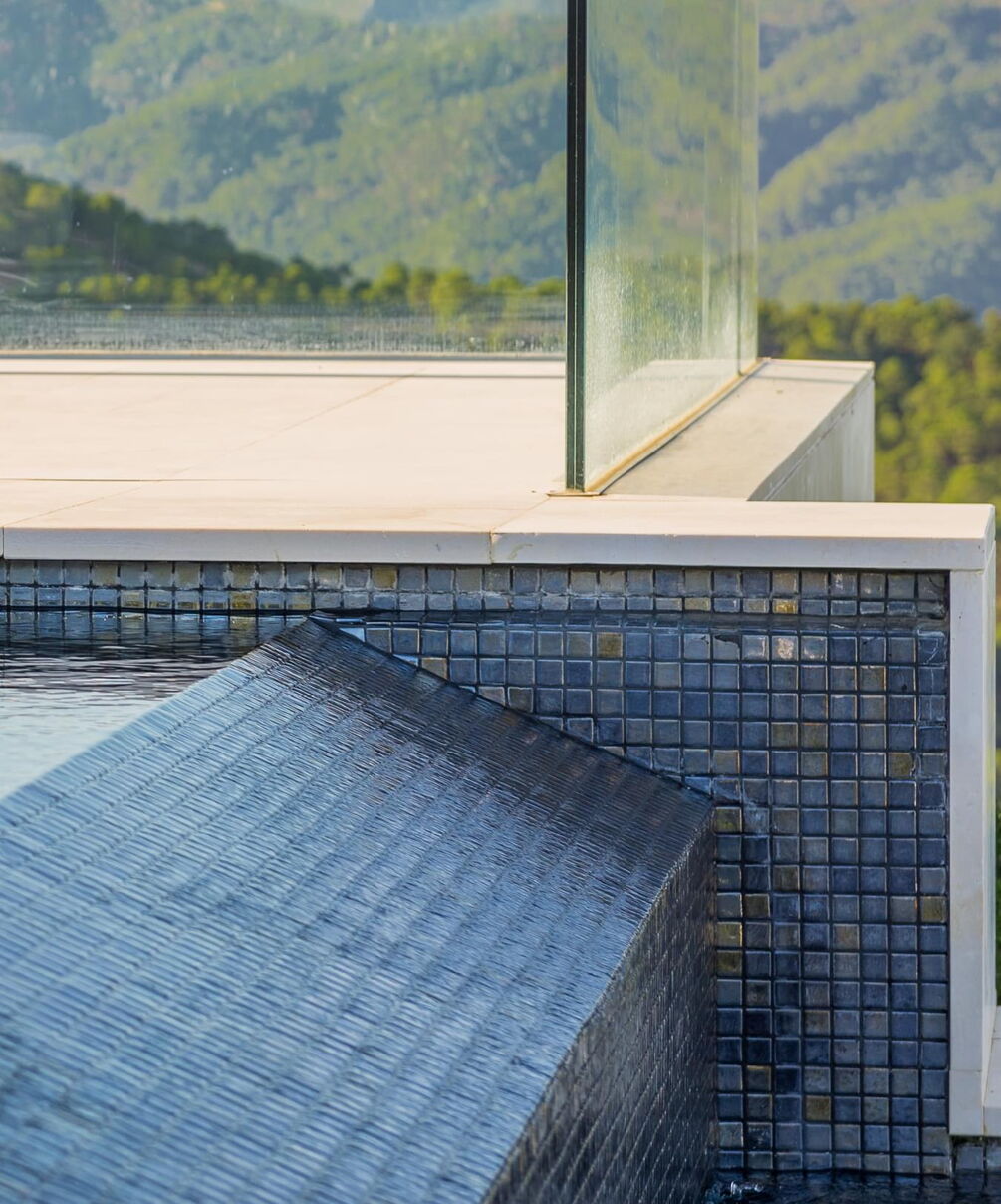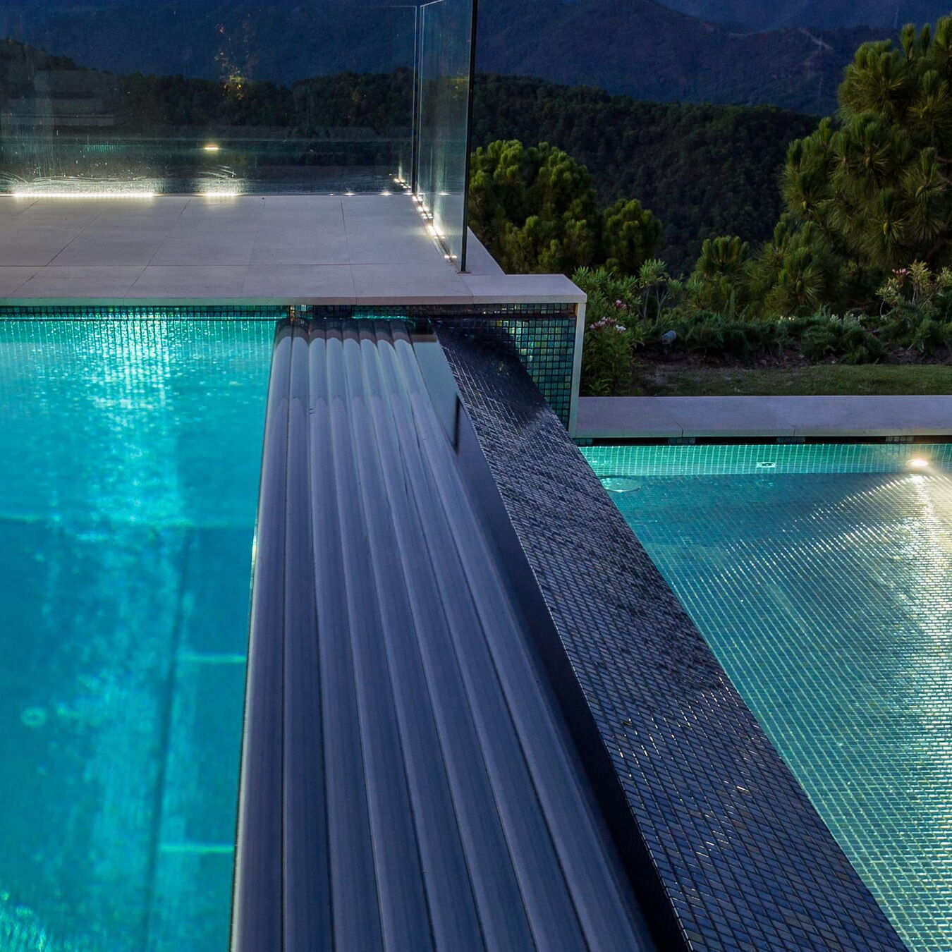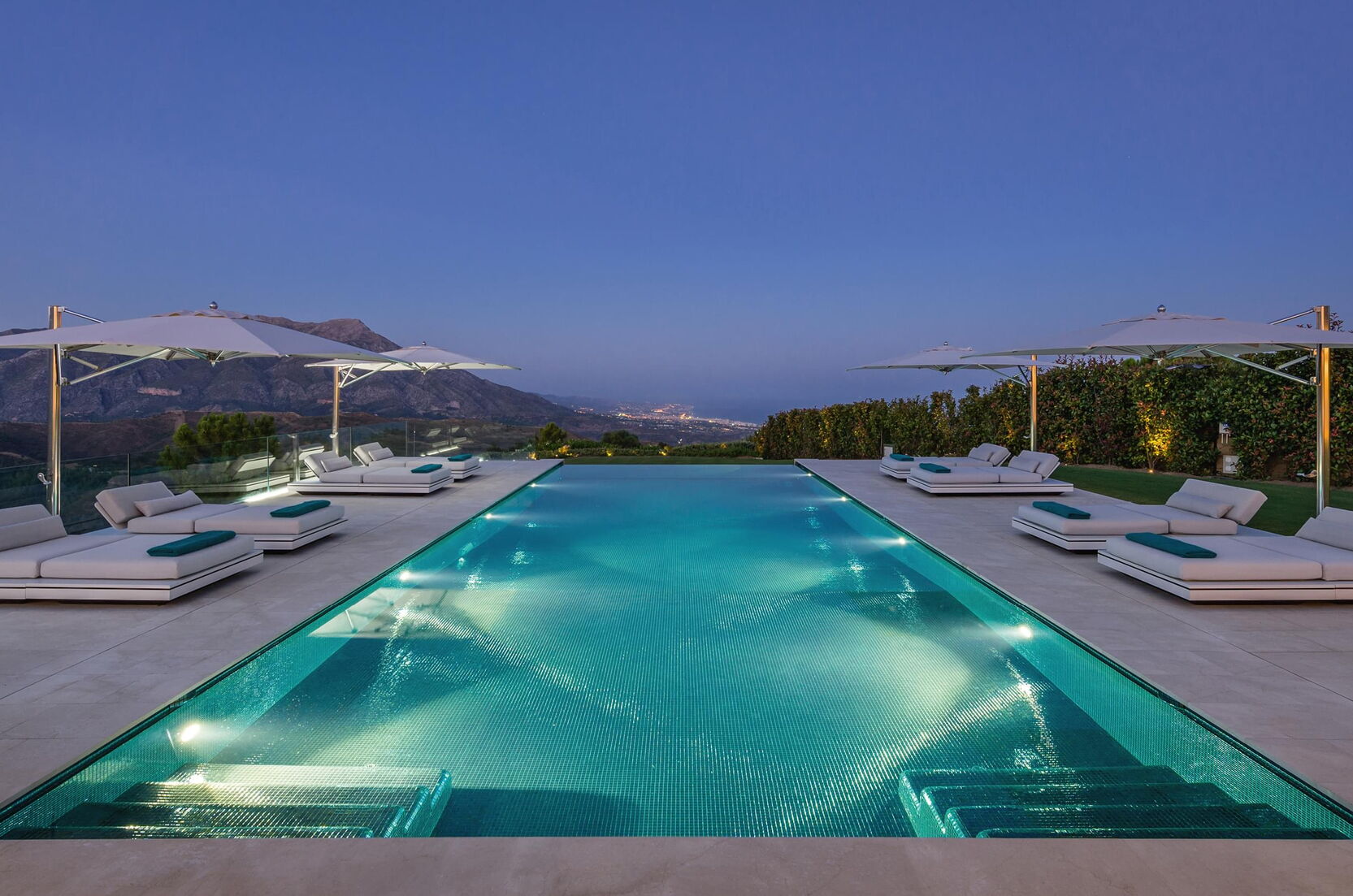 Dieser Outdoor-Pool besticht nicht nur durch seine traumhafte Aussicht, sondern vor allem auch am Abend, wenn die integrierte LED-Beleuchtung das Becken in einem ganz besonderen Licht erstrahlen lässt. Nicht ohne Grund wurde dieser Pool als „Best pool by night“ ausgezeichnet. Für die ausgezeichnete Wasserqualität sorgt die Wasseraufbereitungsanlage von Ospa mit einer EcoClean-Filteranlage, der Desinfektionsanlage OspaBlueClear® sowie der innovativen Ospa-BlueControl®-Schwimmbadsteuerung.