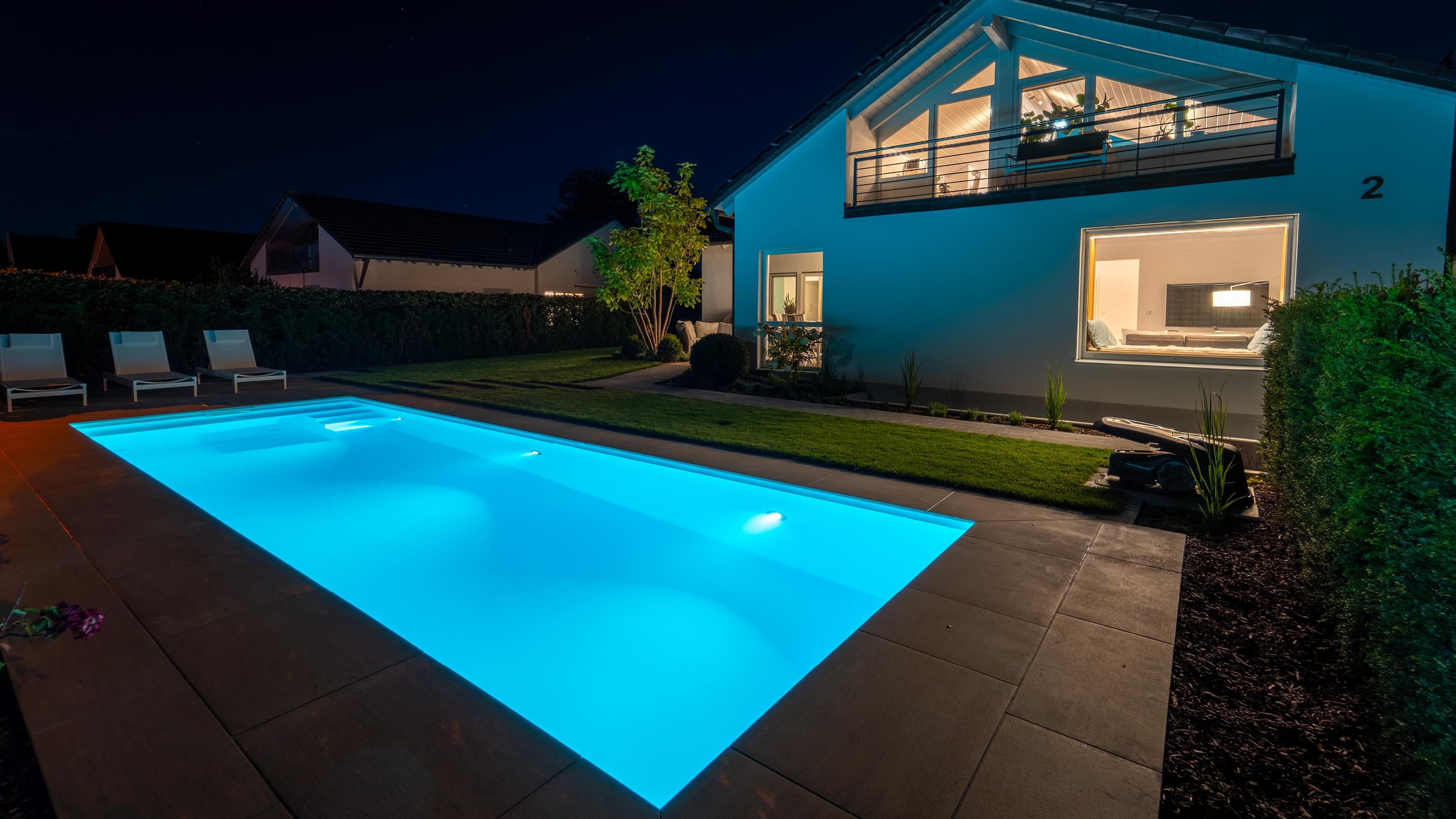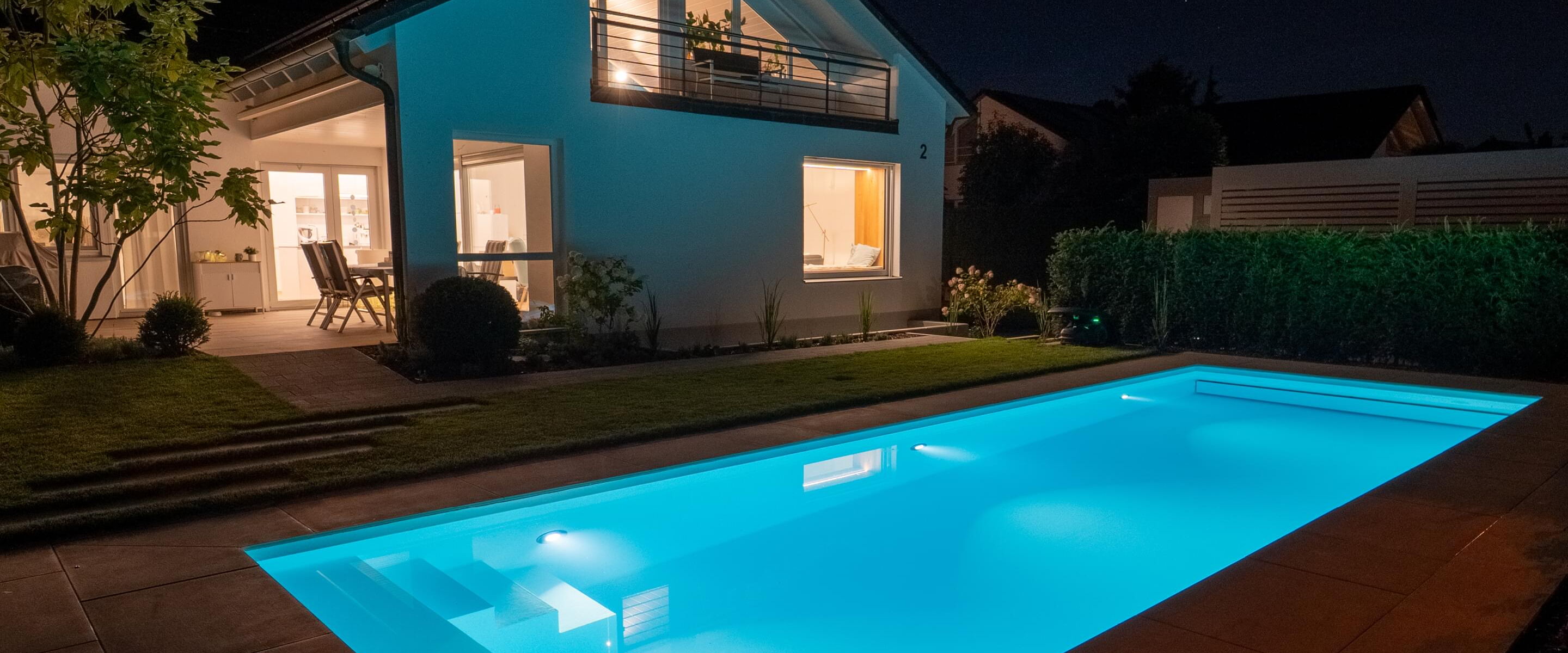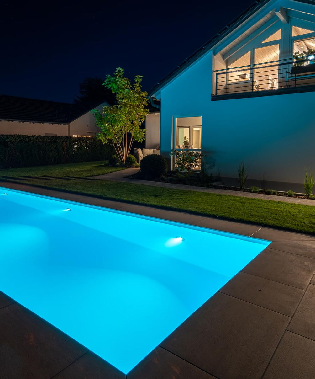 Tauchen Sie ein in fantasievolles und wundervoll farbiges Schwimmbadwasser und erleben Sie Momente einer ganz besonderen Stimmung während Sie durch das Wohlfühlwasser in Ihrem perfekten Schwimmbad gleiten. Bei Dunkelheit und Dämmerung heißt es dann "Licht aus, Spot an"