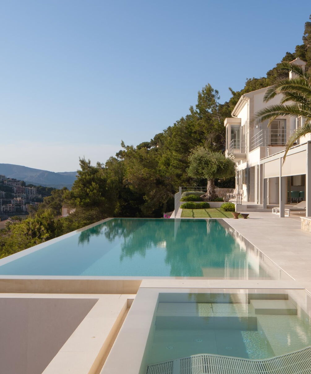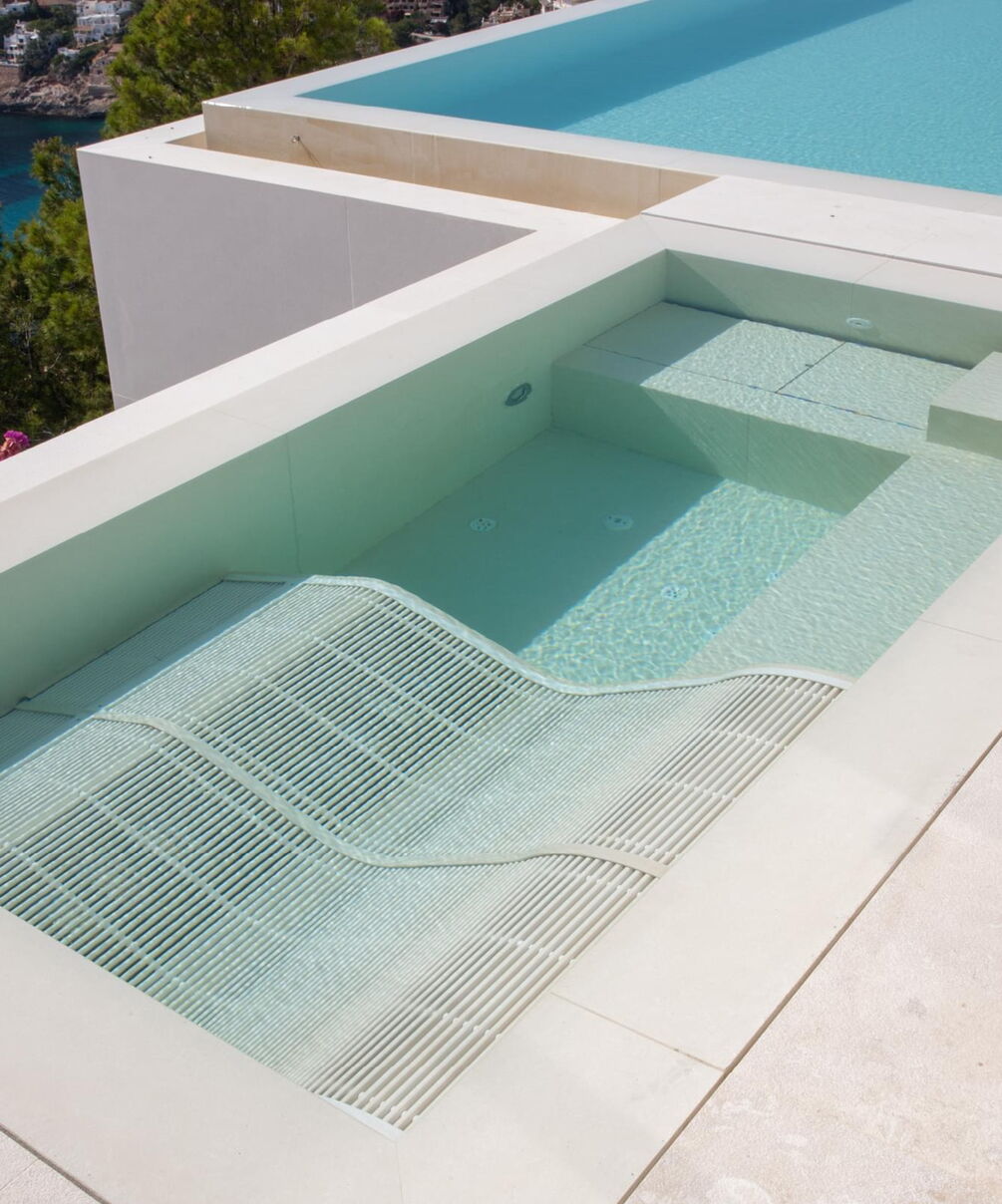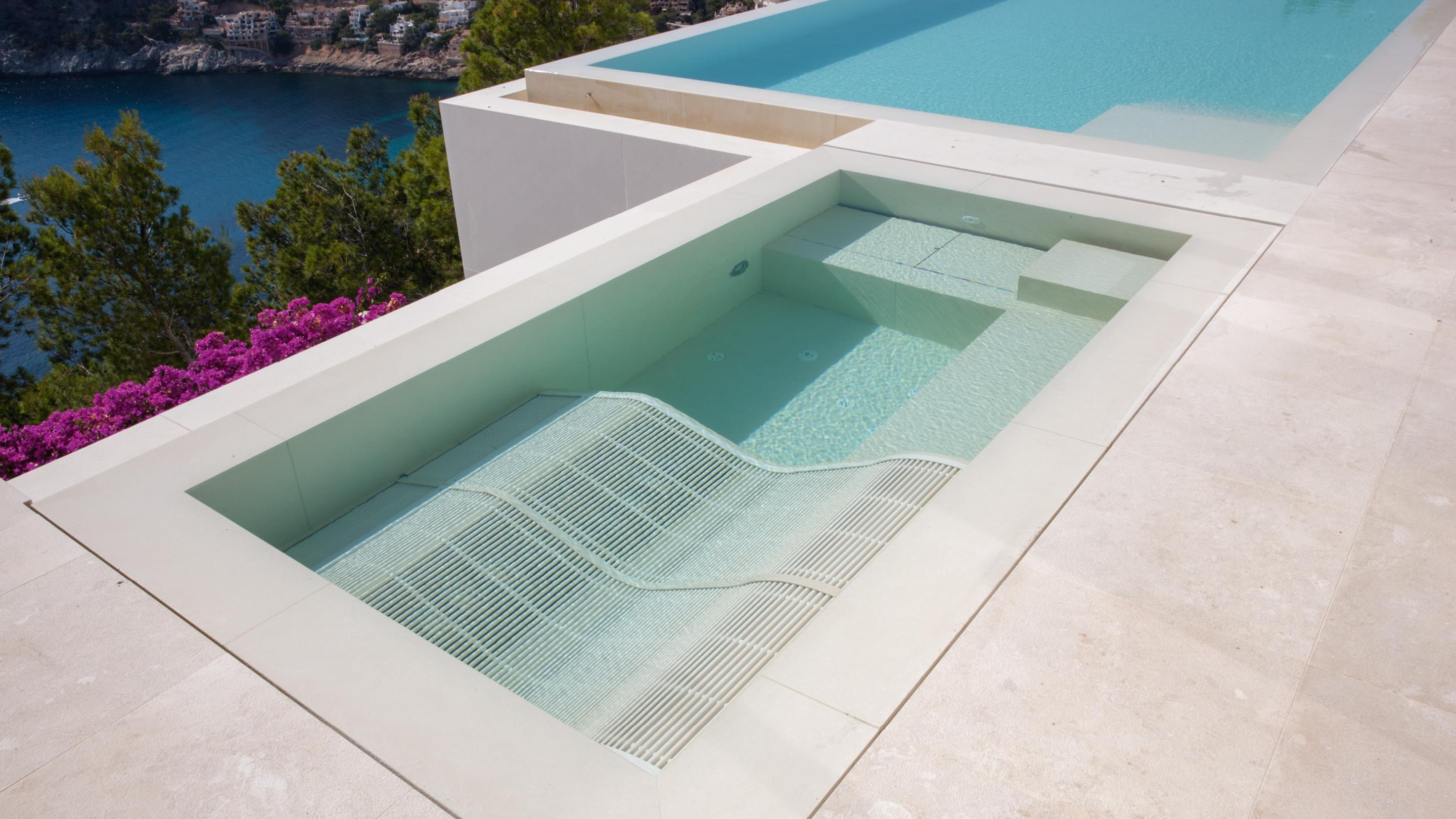 Der endlos wirkende Infinity-Pool bietet einen grandiosen Blick auf die mallorquinische Küste. Das 15 m lange Schwimmbad erforderte das ganze Können der Architekten und Schwimmbadbauer. Aufgrund der engen Platzverhältnisse wurde die gesamte Wasseraufbereitungstechnik inklusive Ospa-Filter und Ospa-BlueClear® mit viel Geschick auf vier verschiedenen Ebenen um das Becken verteilt.
