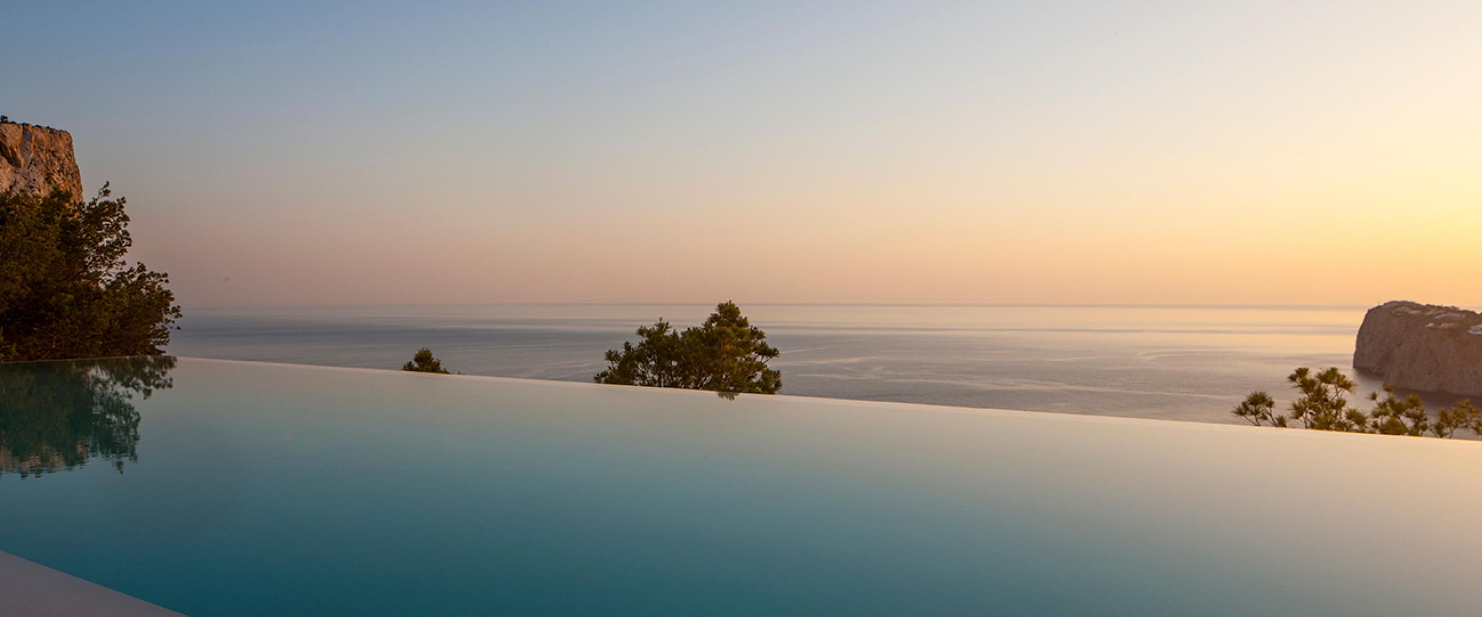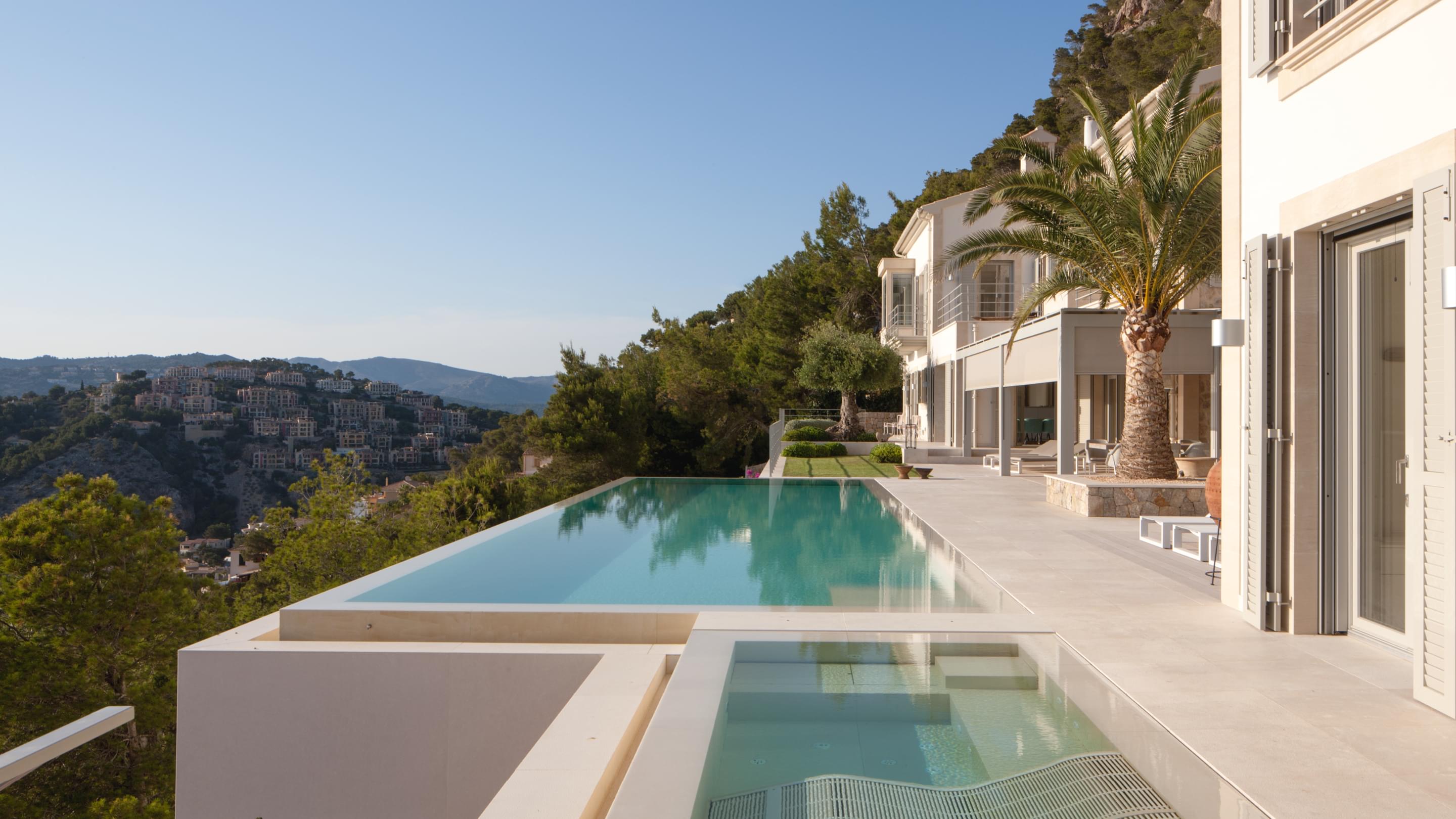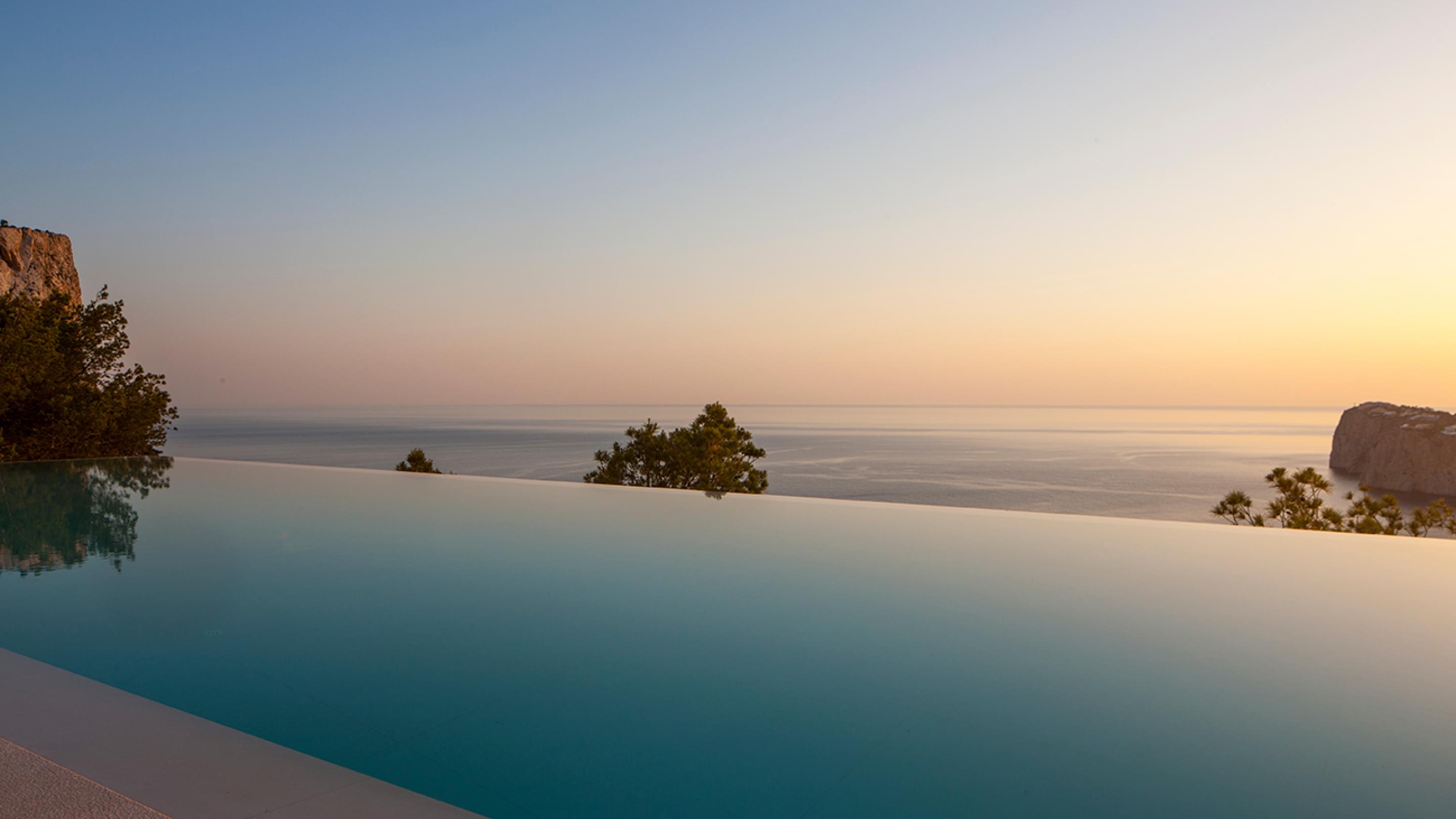 Der endlos wirkende Infinity-Pool bietet einen grandiosen Blick auf die mallorquinische Küste. Das 15 m lange Schwimmbad erforderte das ganze Können der Architekten und Schwimmbadbauer. Aufgrund der engen Platzverhältnisse wurde die gesamte Wasseraufbereitungstechnik inklusive Ospa-Filter und Ospa-BlueClear® mit viel Geschick auf vier verschiedenen Ebenen um das Becken verteilt.