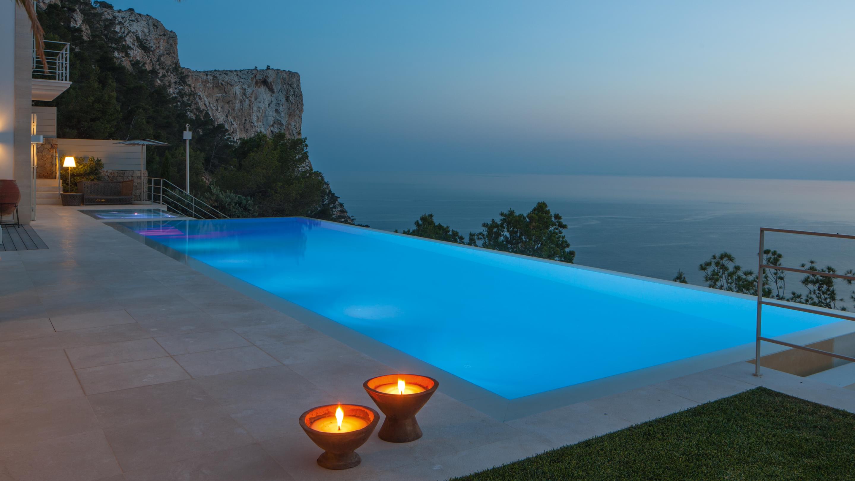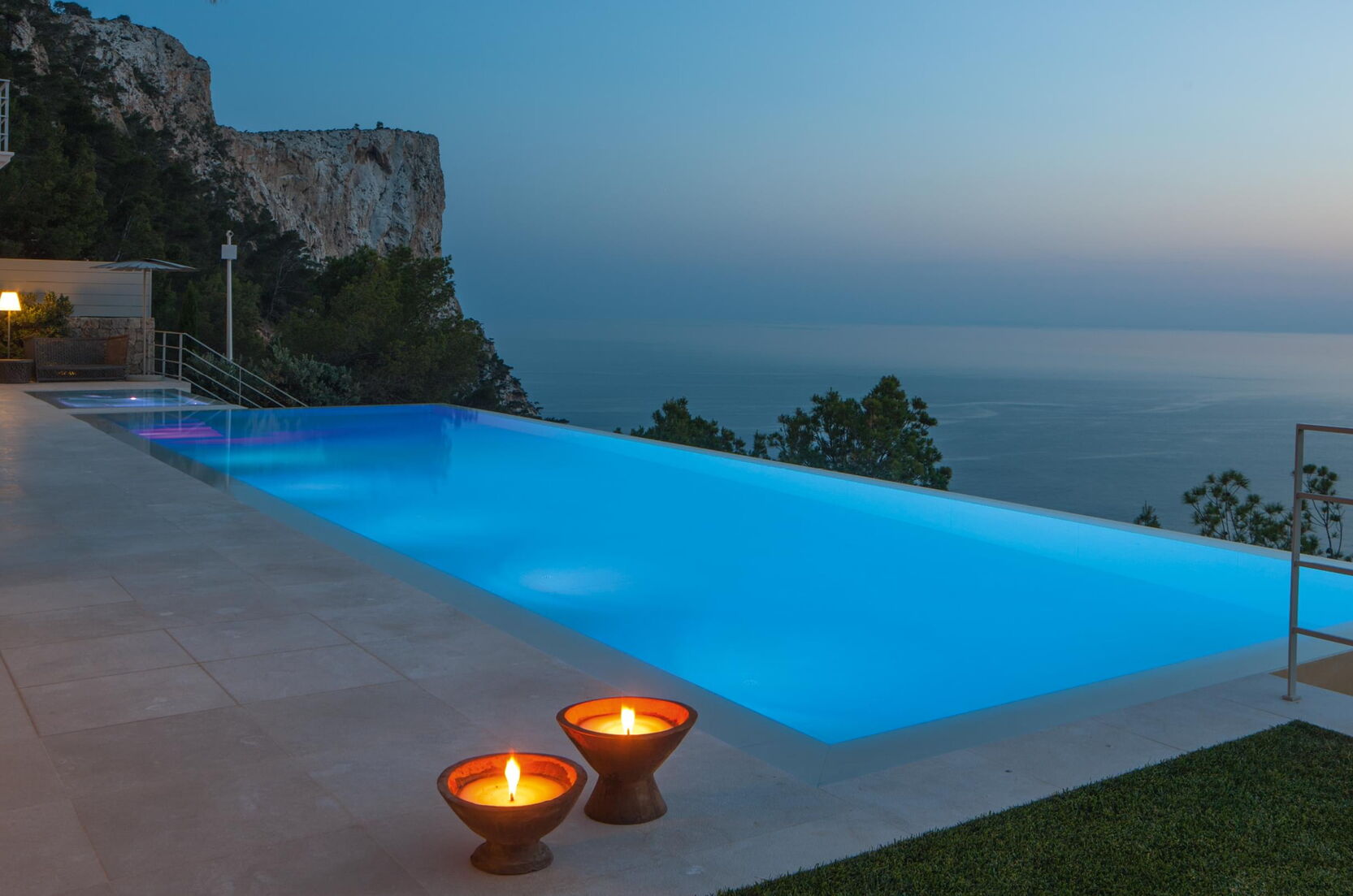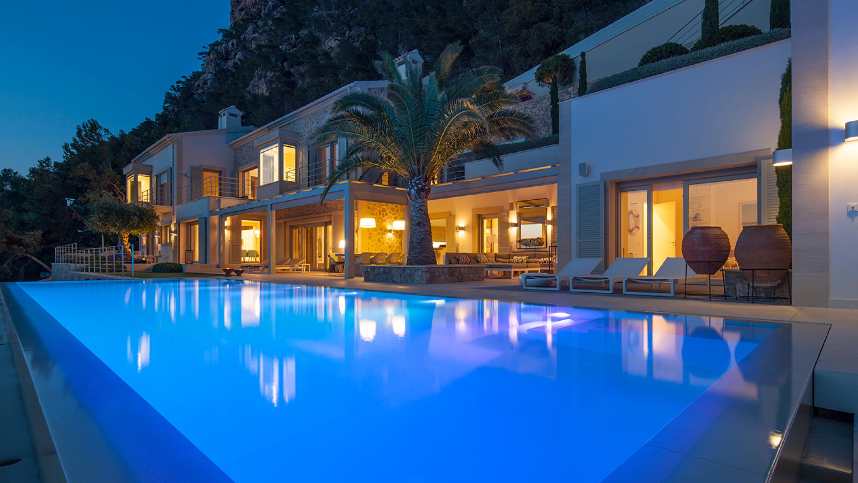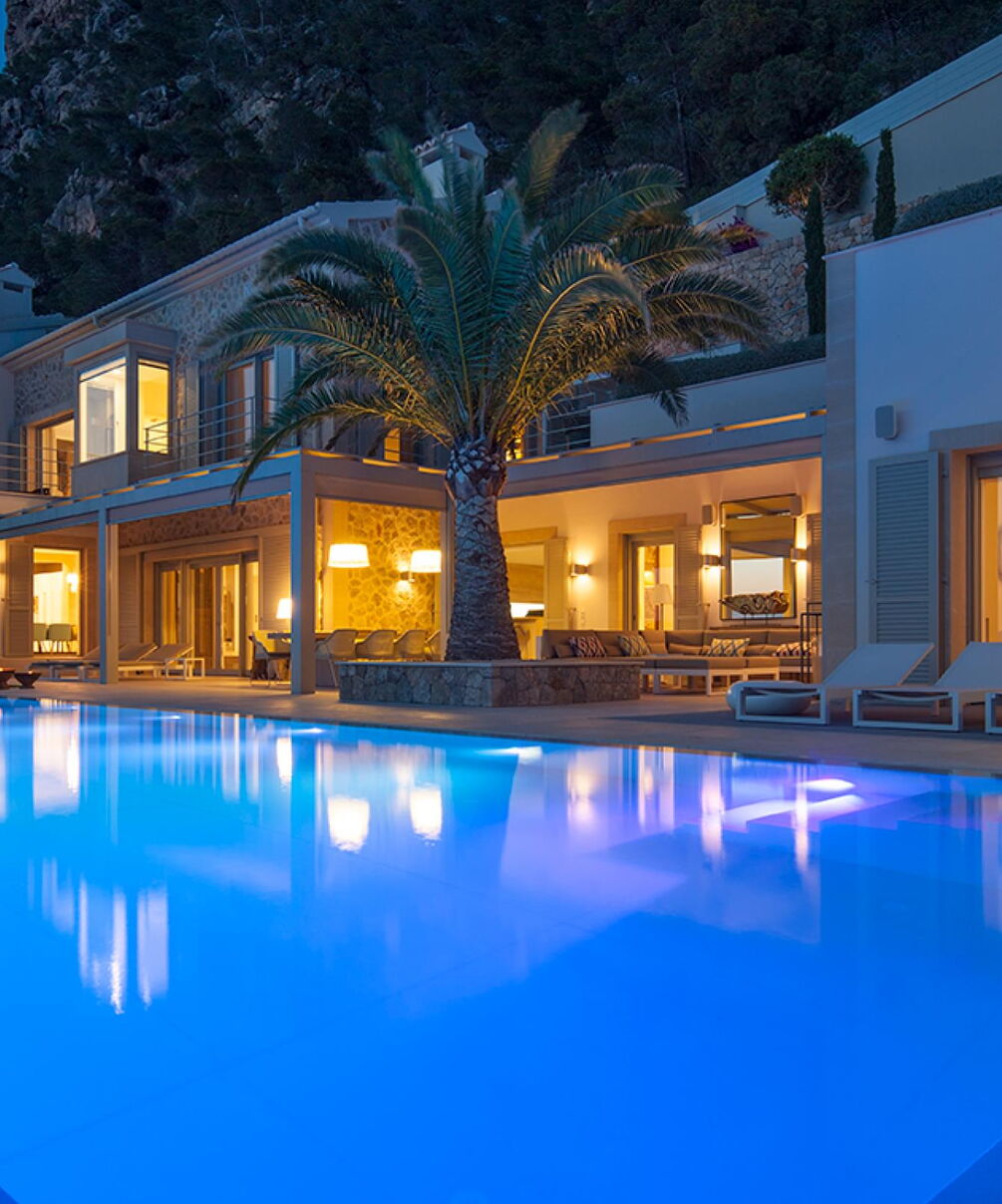 Auch nachts ist der Pool ein Blickfang – die geschickt installierten LED-Unterwasserscheinwerfer setzen die Poollandschaft der Villa einmalig in Szene.