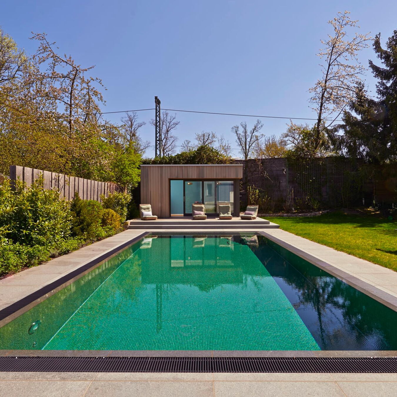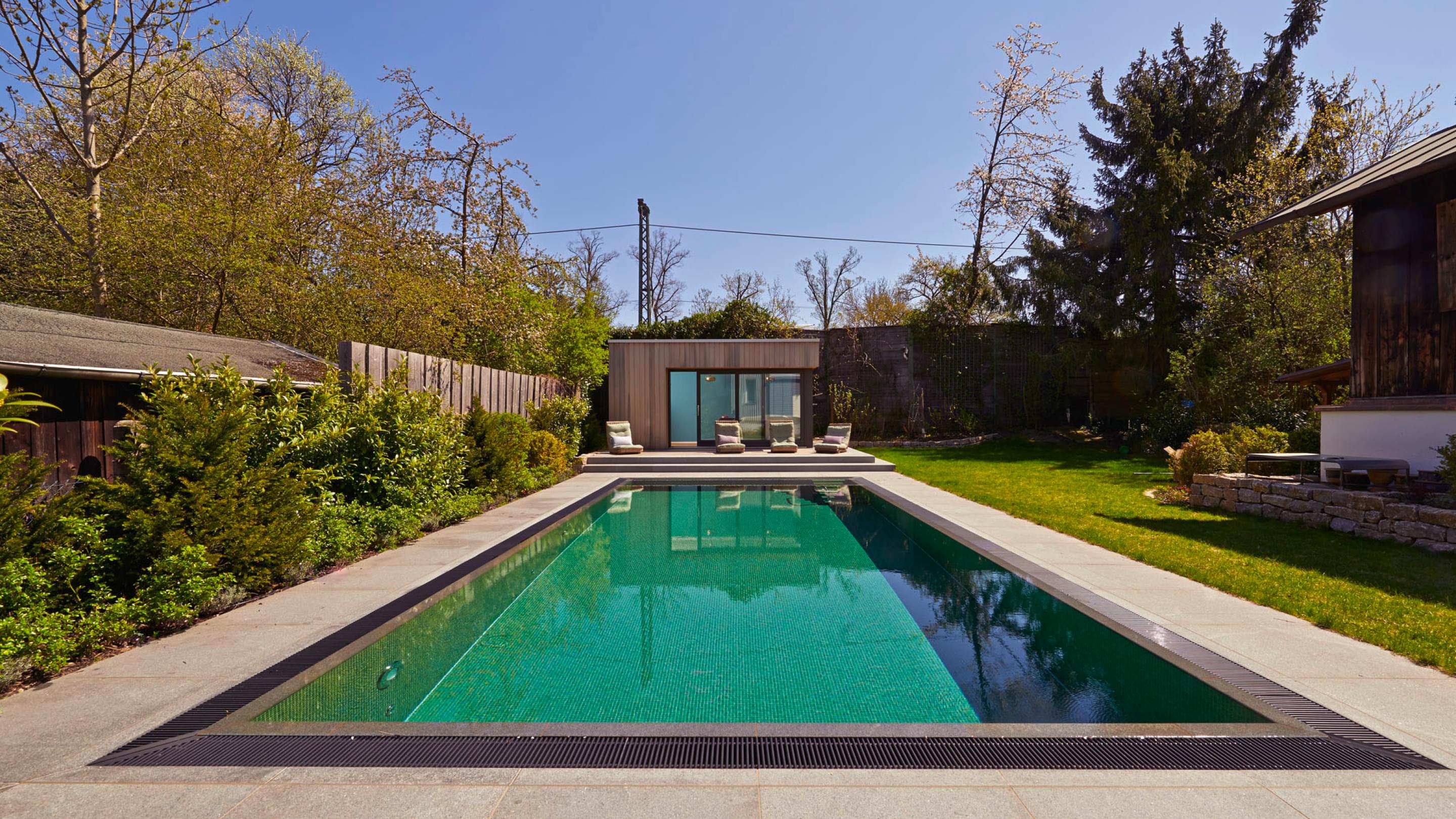 Bei dieser Anlage in München verbreitet das Schwimmbecken türkis-schimmerndes Karibikflair. Eingerahmt von einer schlichten Gartengestaltung bietet der Pool – wen wundert's – viel Platz für sportliche Betätigung.