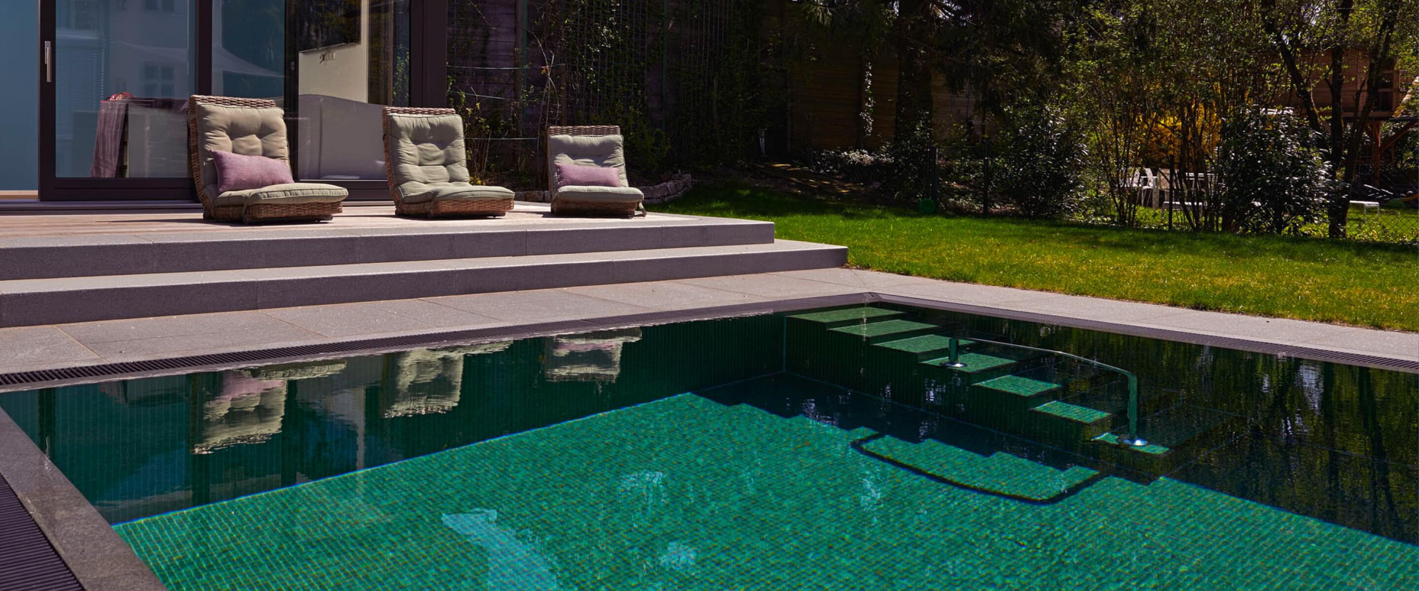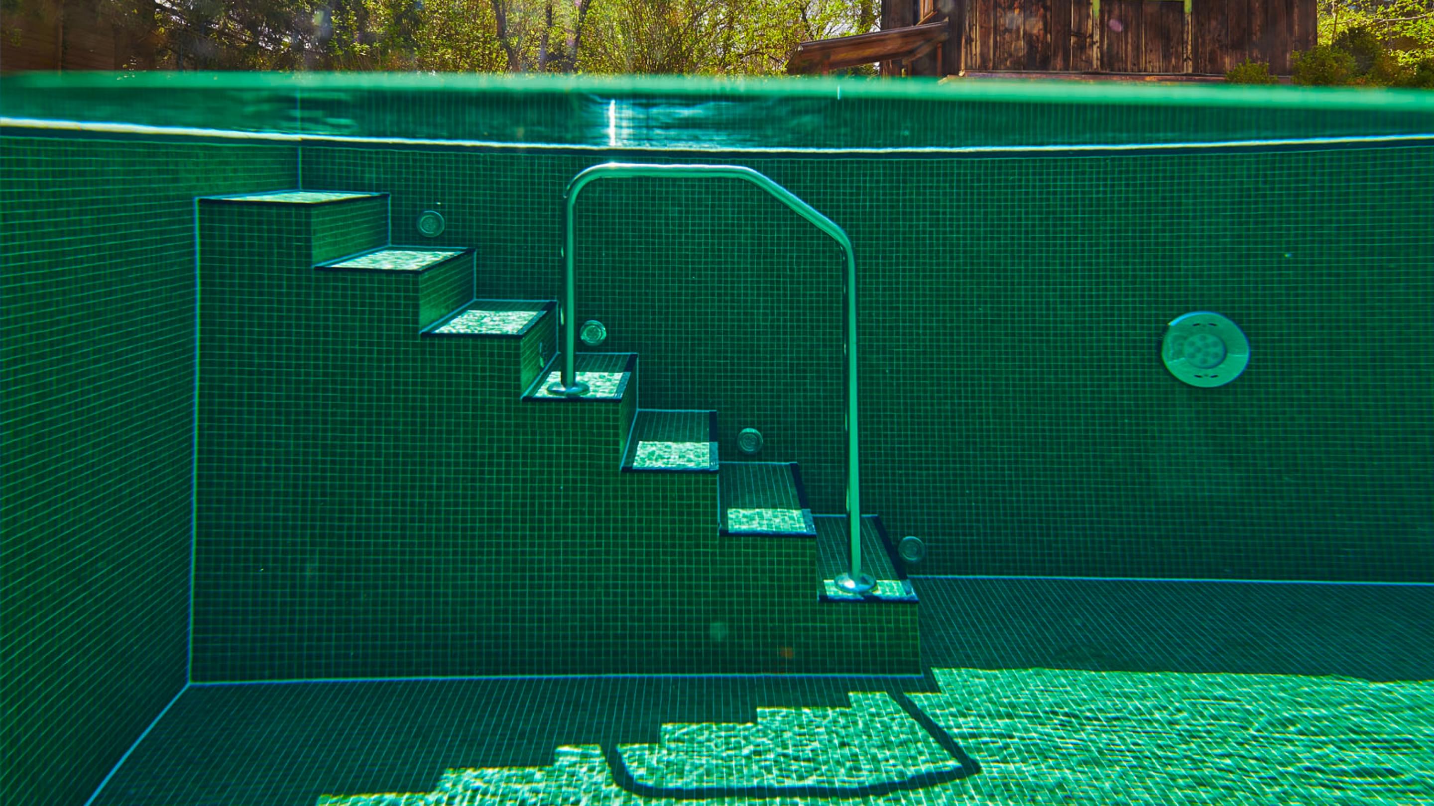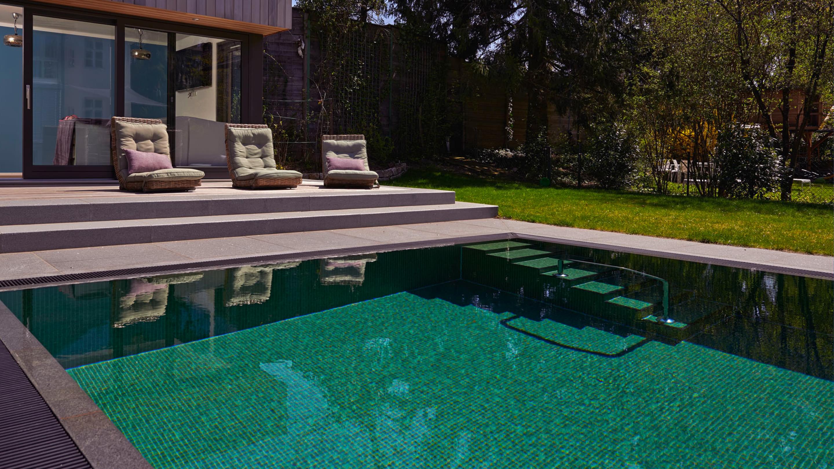 War es die Liebe zum grünen Rasen, die den Bauherrn, einen ehemaligen Fußballprofi, dazu bewog, seinen Pool ganz in Grün zu gestalten?