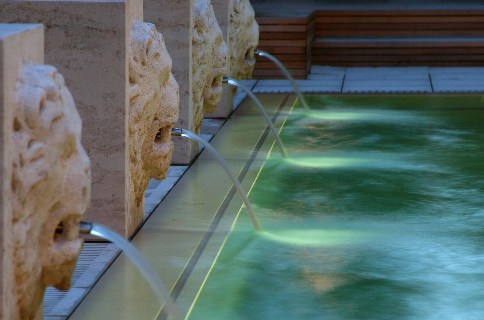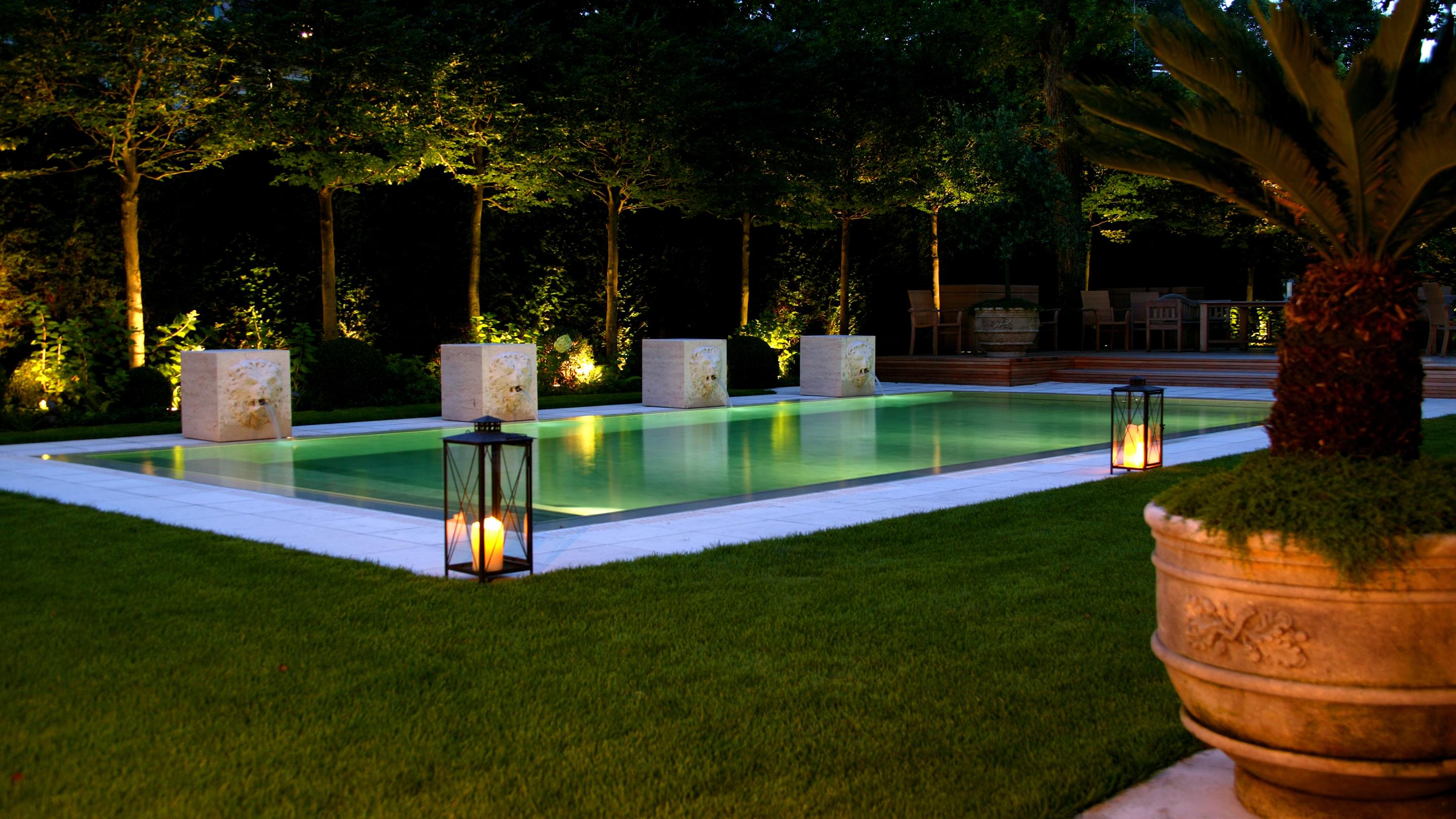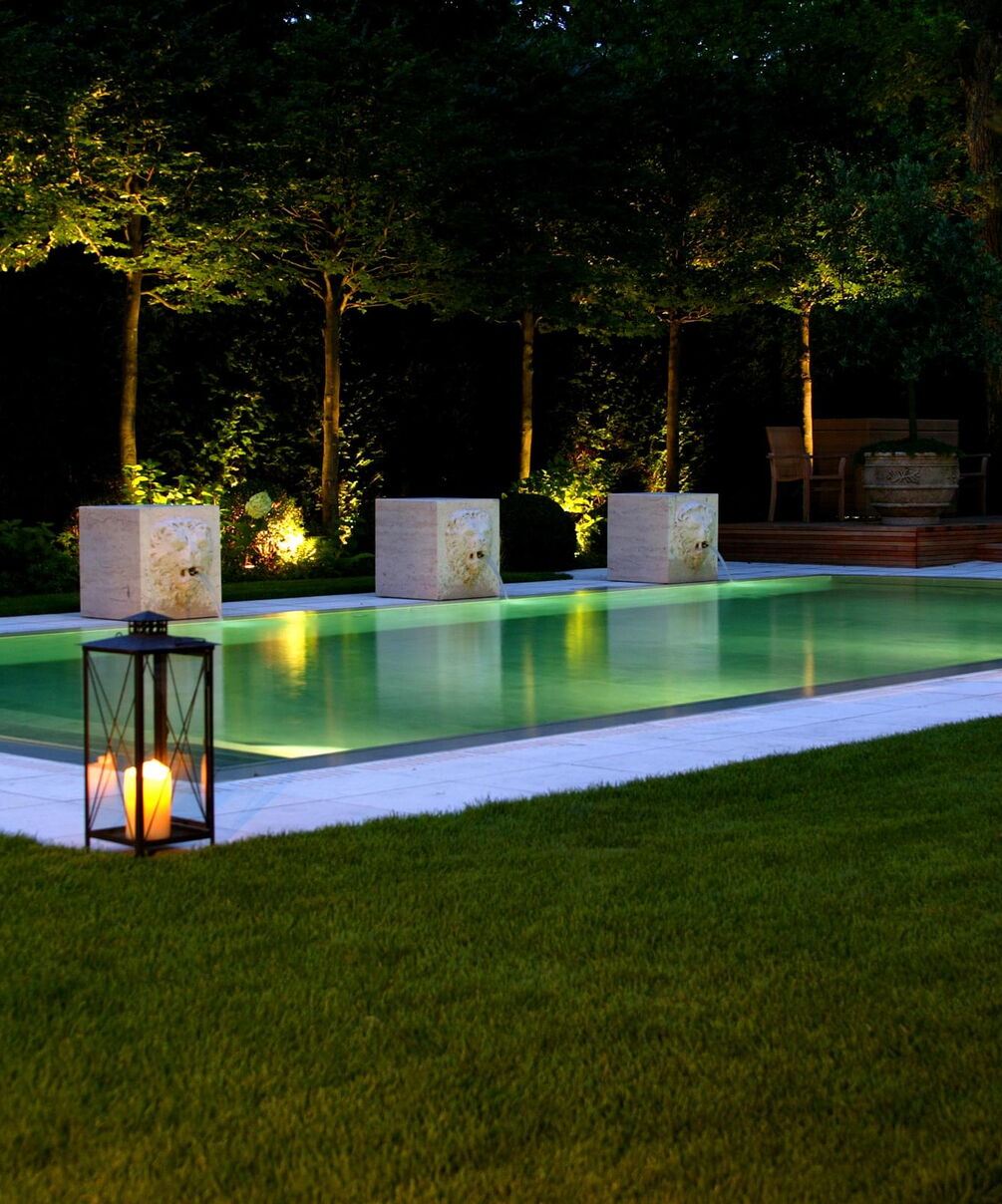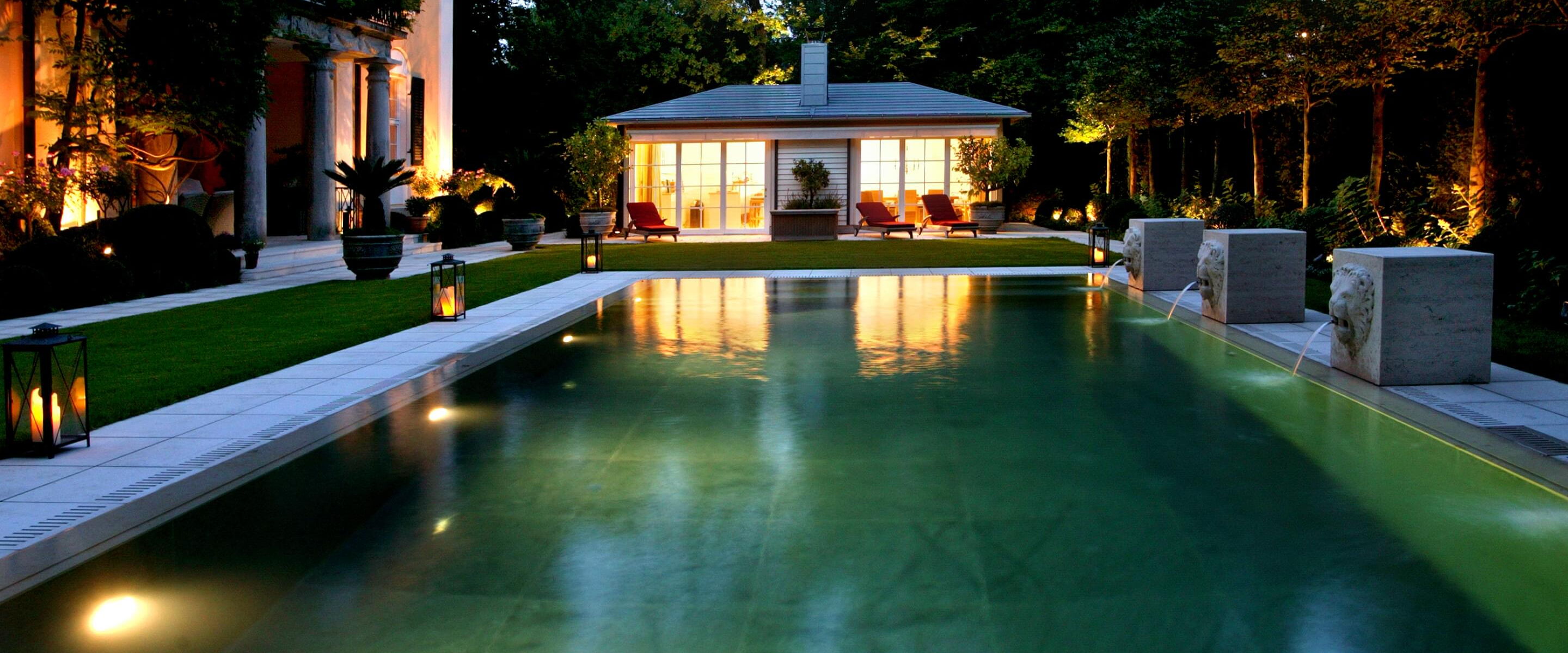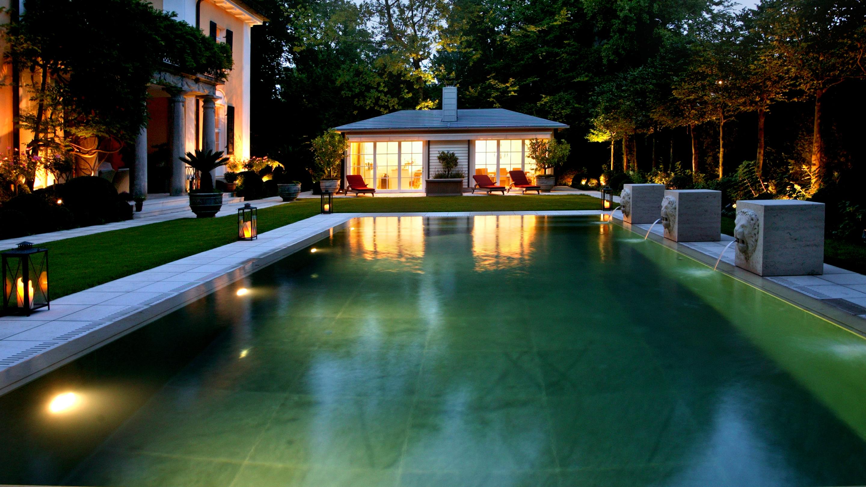 Für eine kristallklare, türkisfarbene Oberfläche sorgt der Schweizer Granit, mit dem der Beckenkörper aus Beton ausgekleidet wurde. Ein ganz besonderer Blickfang fügt den Pool angemessen in die herrschaftliche Umgebung ein: Wasserspeiende Steinlöwen säumen die Längsseite des Beckens.