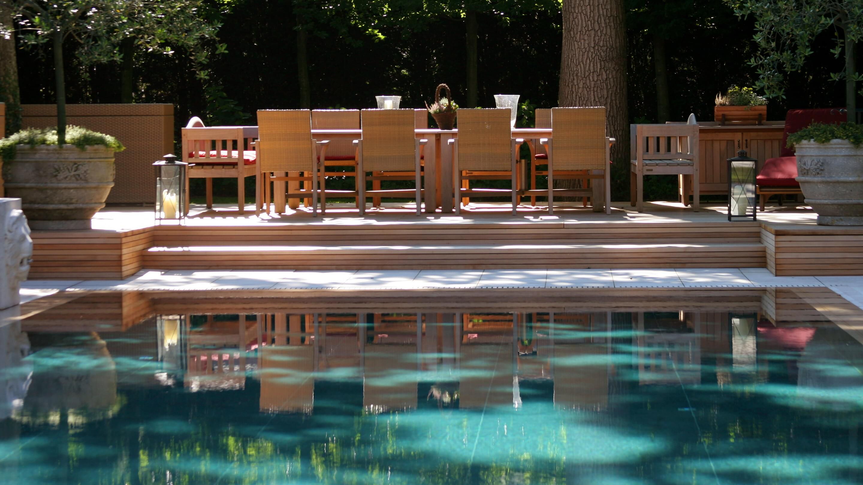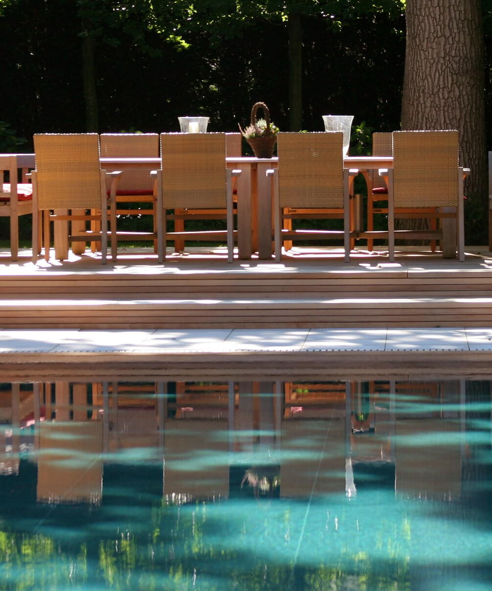 Unterwasserscheinwerfer sorgen außerdem für stimmungsvolle Beleuchtung und die vierdüsige Massagestation lädt zum Relaxen ein. Weiterer Badekomfort ist durch die Unterbringung von Dusche und sanitären Anlagen im Badehaus an der Stirnseite garantiert.