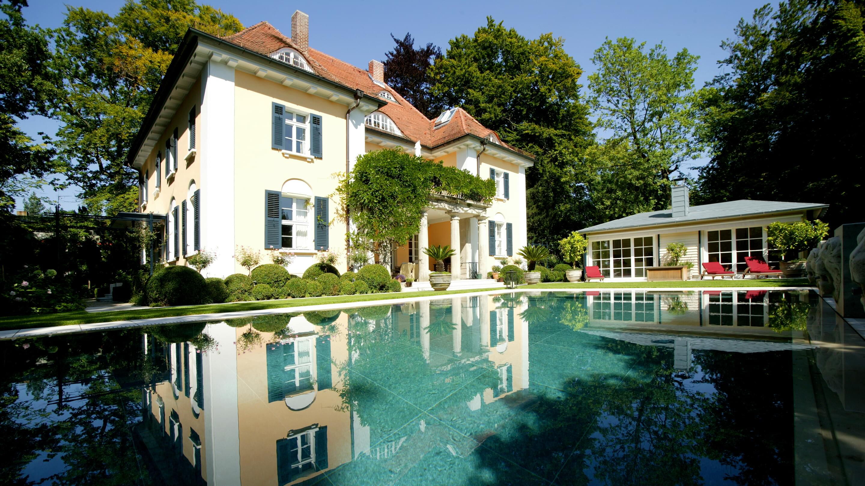 Der Rahmen des schlichten, 13,5 m langen und knappe 5 m breiten Pools besteht aus hellgrauem Kalkstein, welcher mit der Fassade der Münchner Jahrhundertwende-Villa harmoniert.