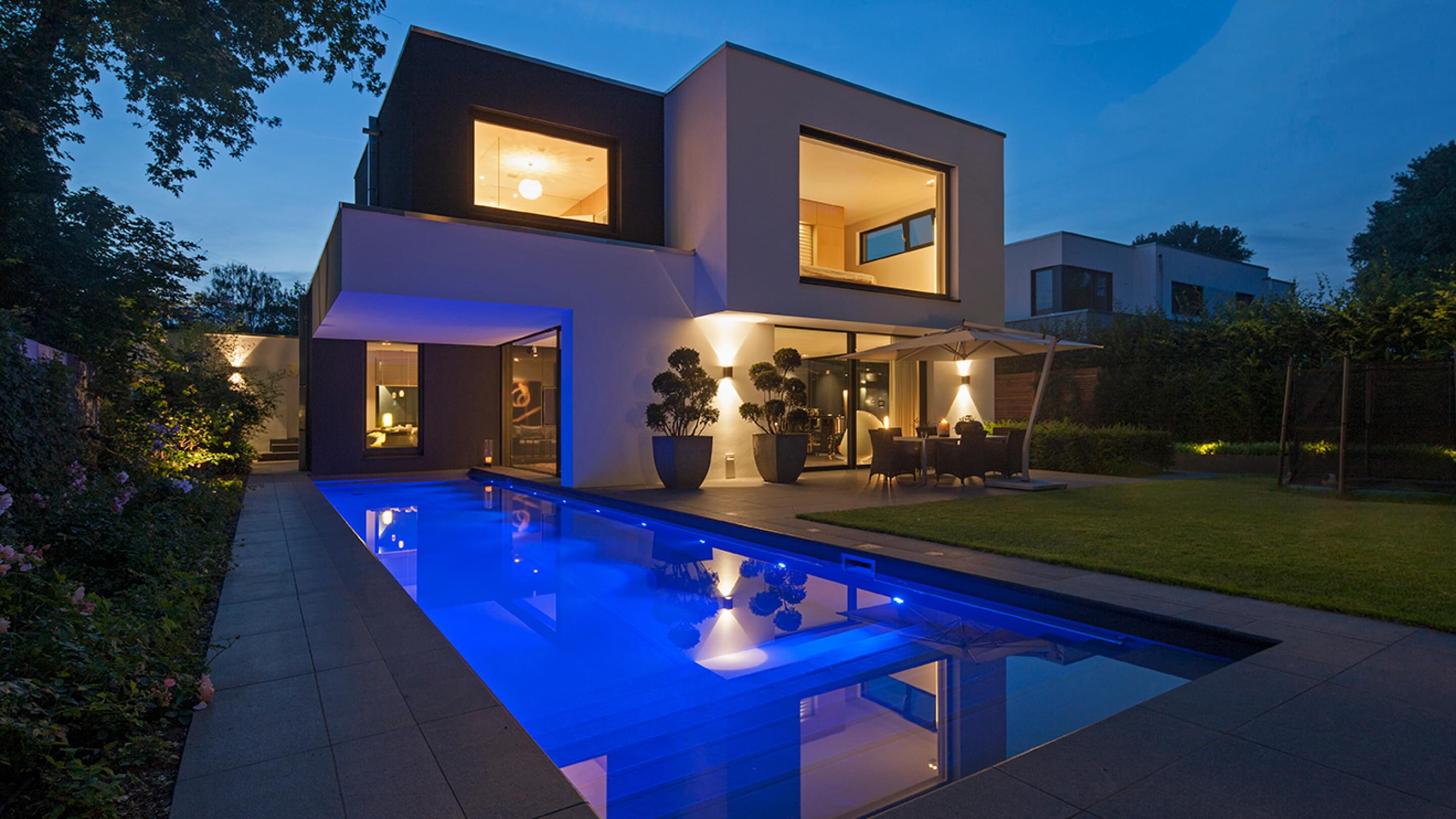 Die klaren Linien des Beckens fügen sich dezent in die Architektur des Grundstücks ein und machen Wohnhaus und Pool zu einer Wohlfühl-Oase der Extraklasse.