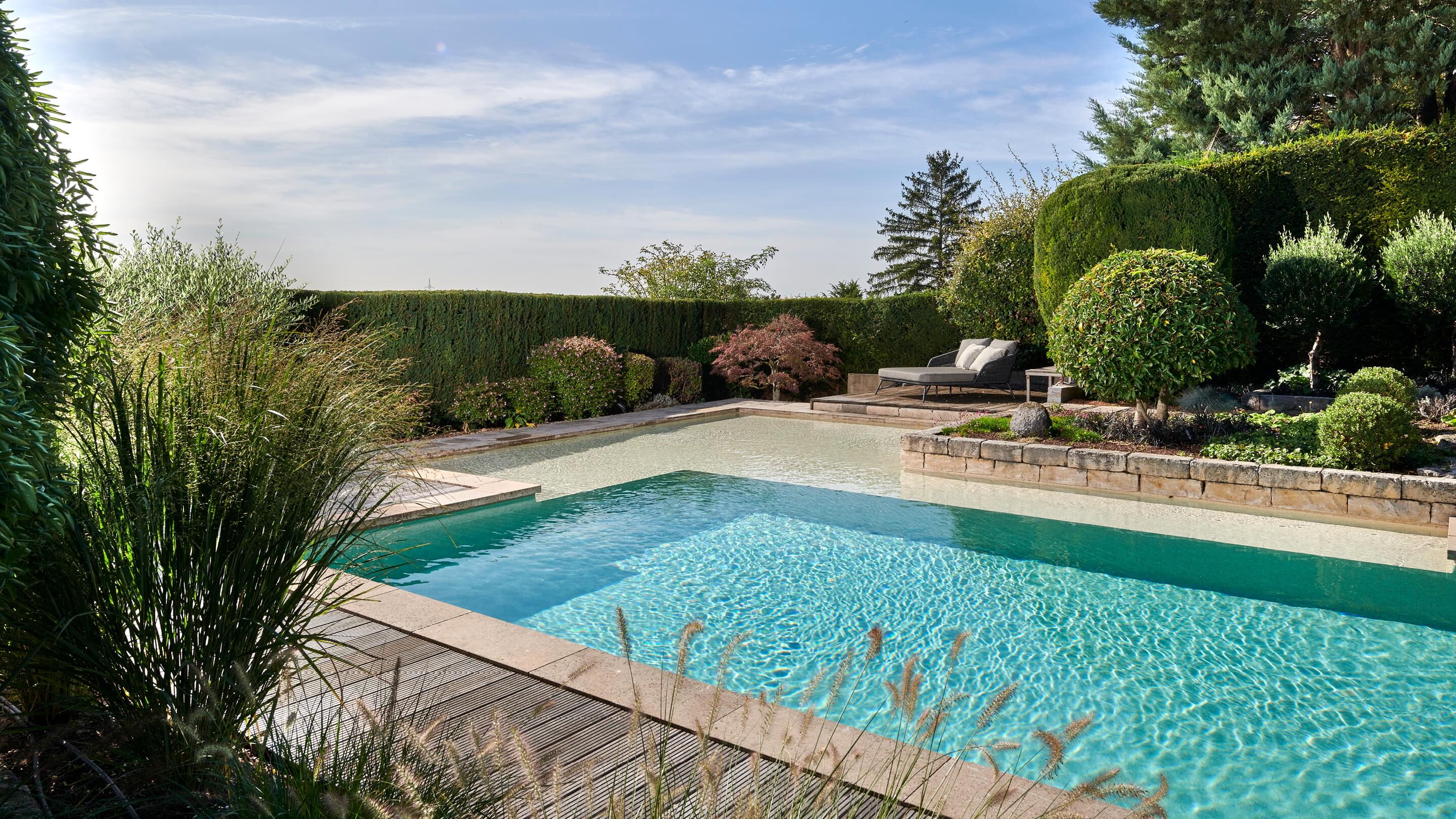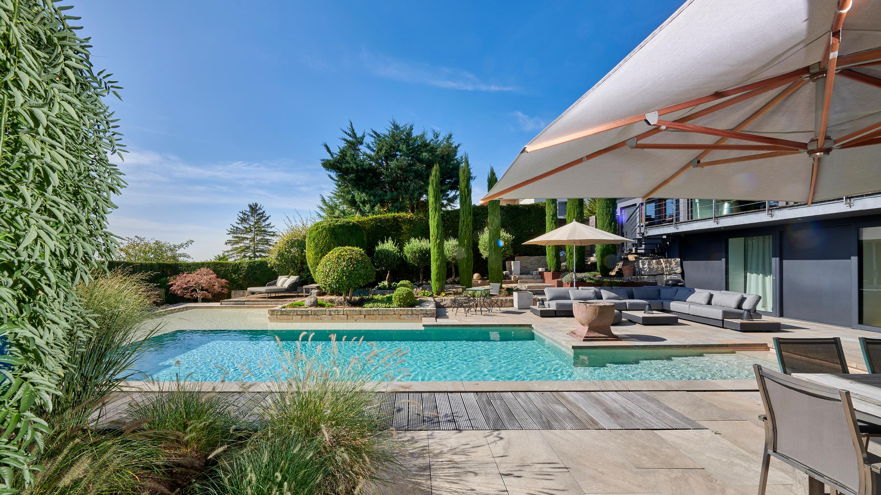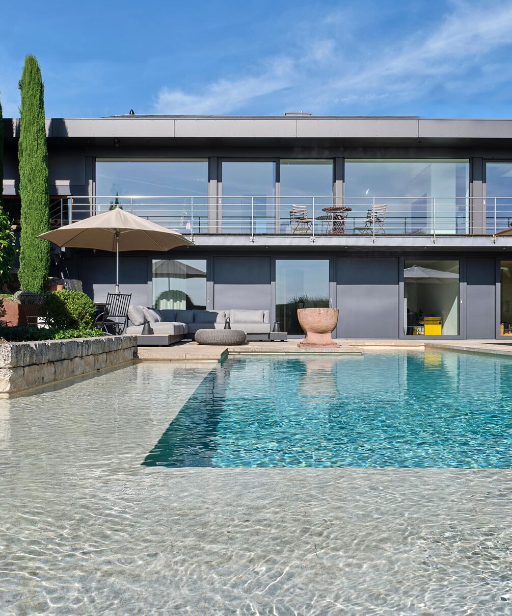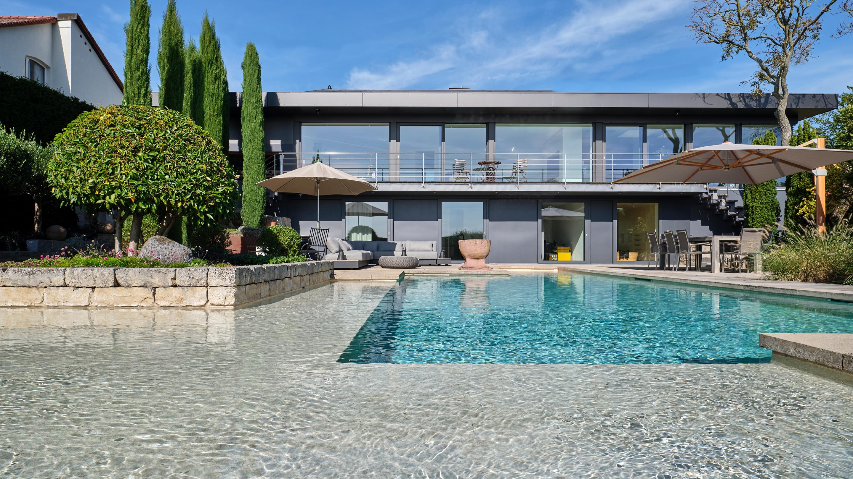 Unzufrieden mit der Wasserqualität des bisherigen Naturpools, entschied sich die Familie für einen Umbau. Pool, Terrassen, Haus und Garten bilden nun eine harmonische Einheit mit zahlreichen Plätzen, die zum Entspannen einladen.