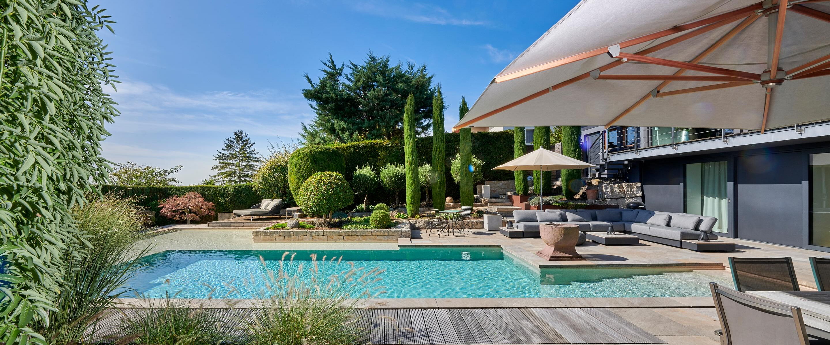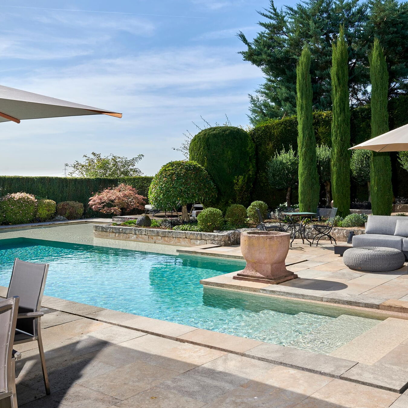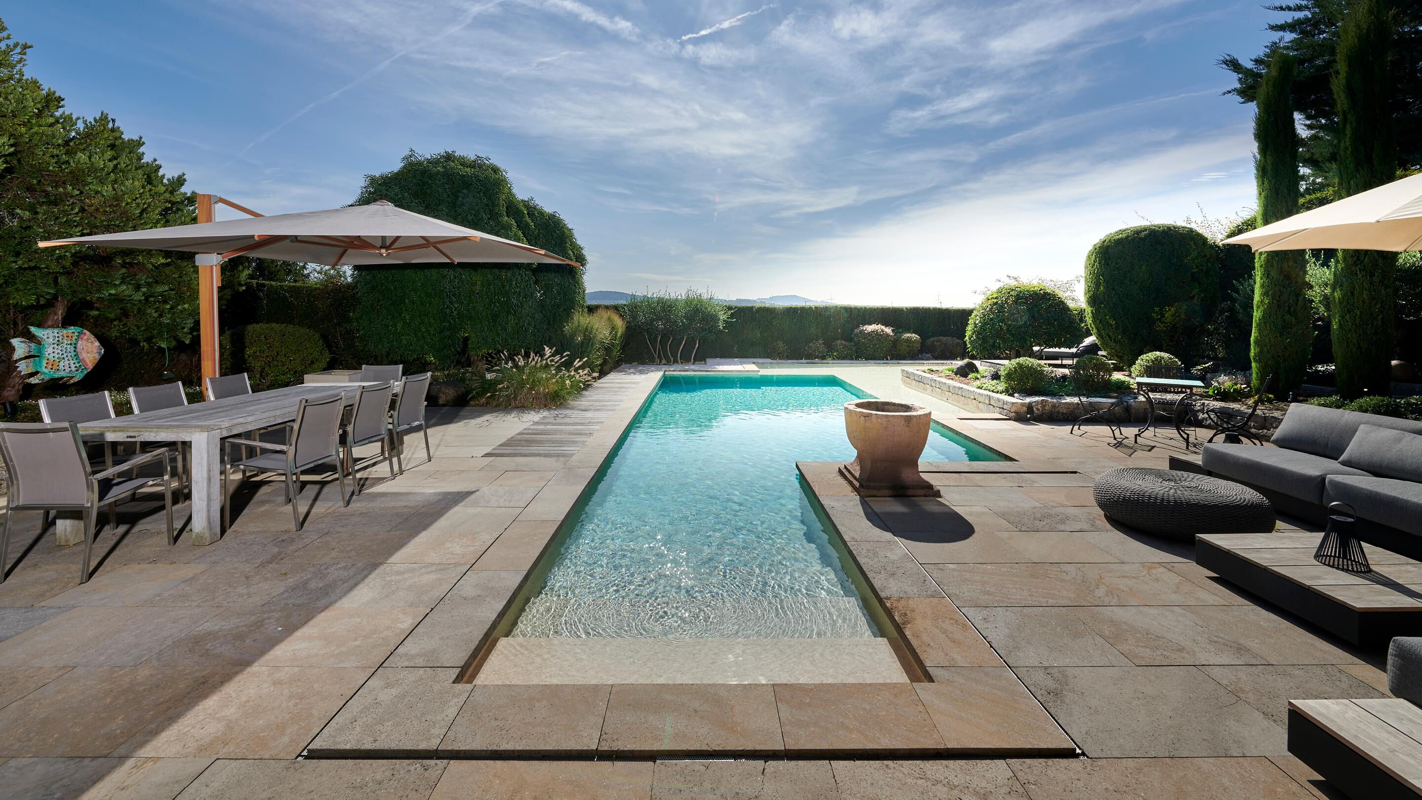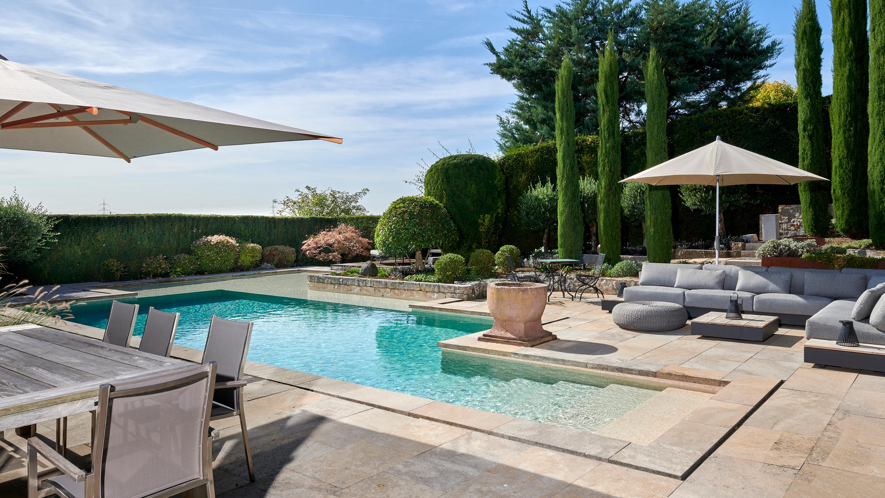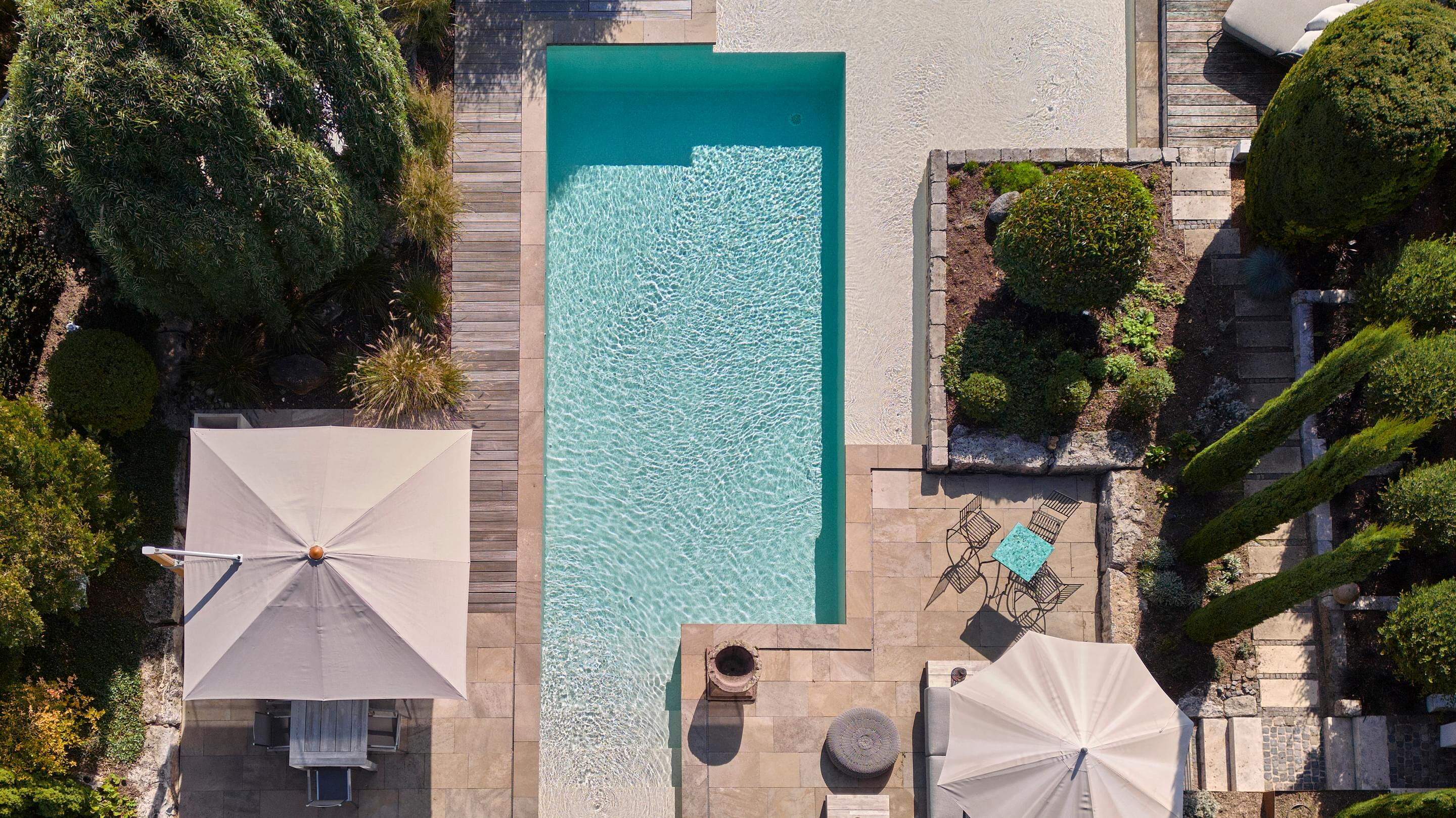 Unzufrieden mit der Wasserqualität des bisherigen Naturpools, entschied sich die Familie für einen Umbau. Pool, Terrassen, Haus und Garten bilden nun eine harmonische Einheit mit zahlreichen Plätzen, die zum Entspannen einladen.