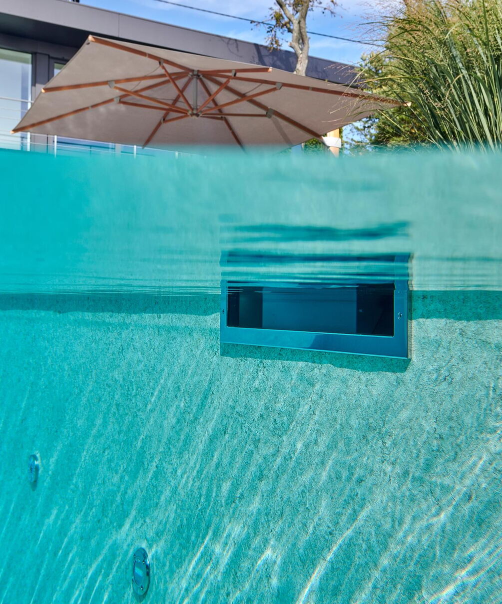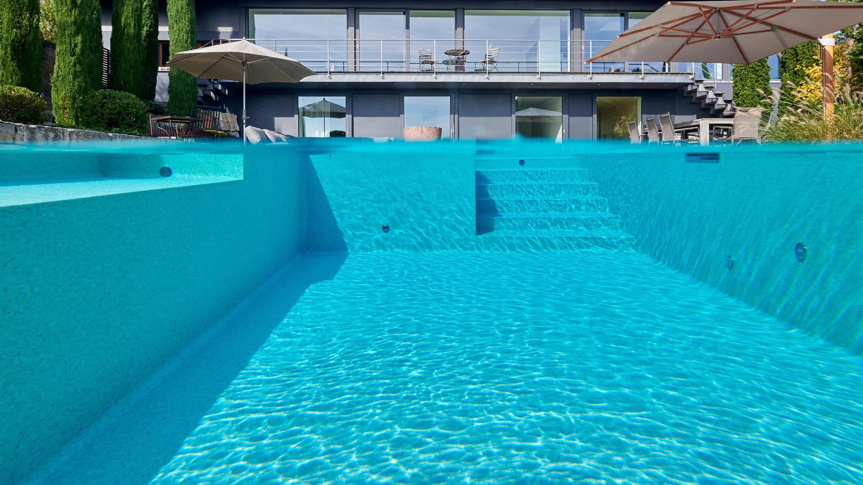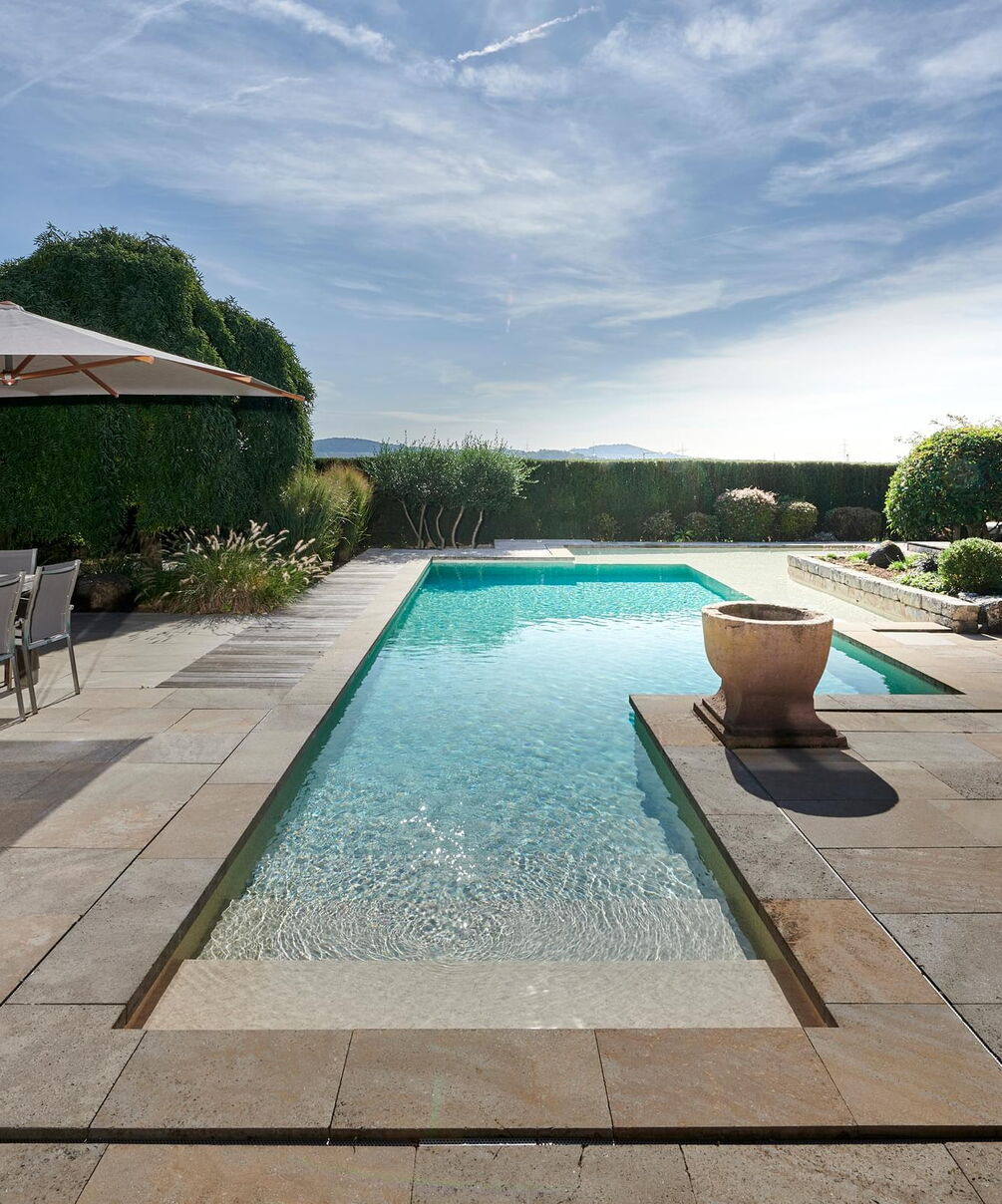 Der Pool ist von Naturstein- und Holzoberflächen umgeben und bietet durch seine verschiedenen Tiefen unterschiedliche Farbwirkungen des Wassers. Am Abend sorgen Ospa-LED-Scheinwerfer für das passende Farbenspiel.