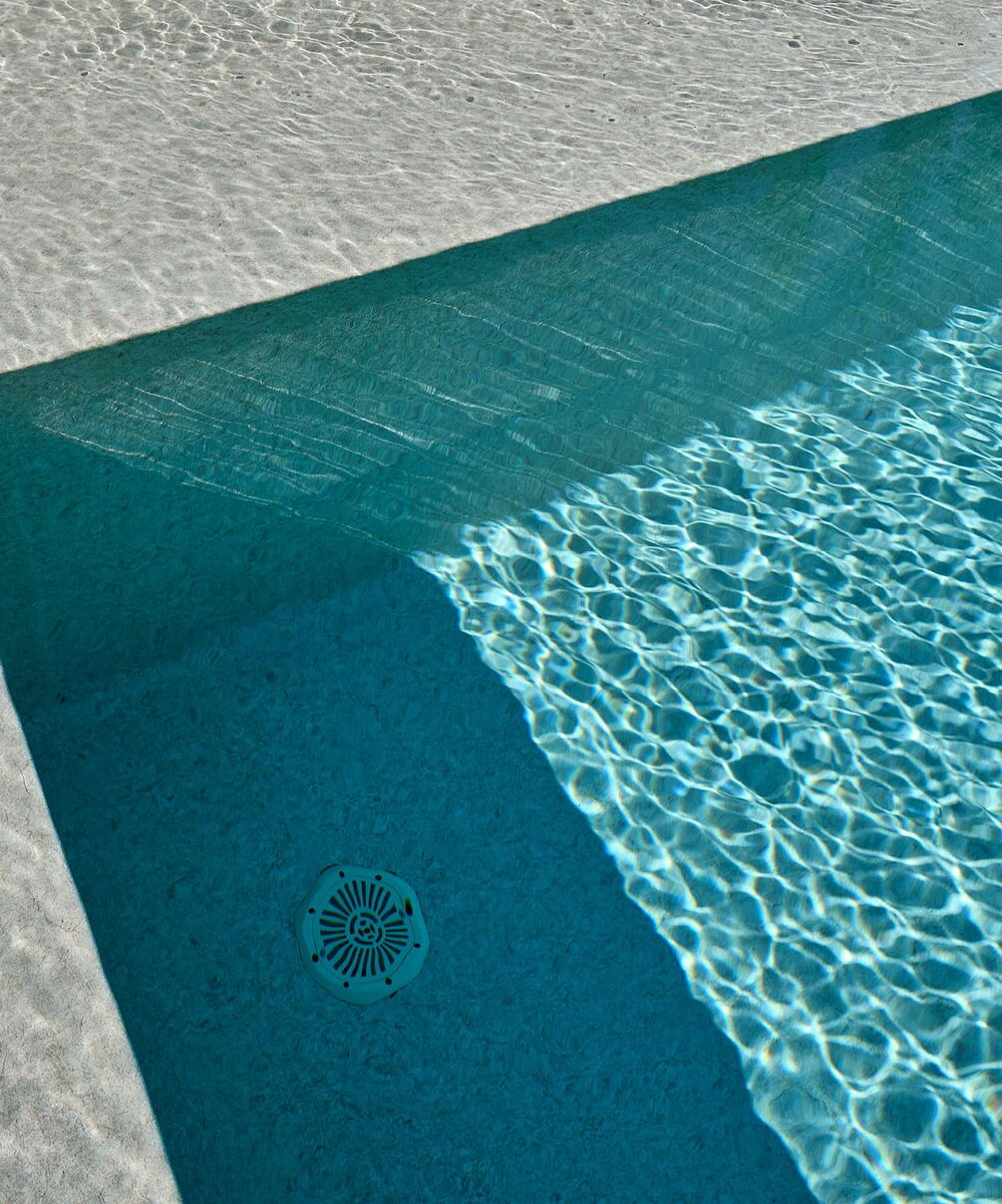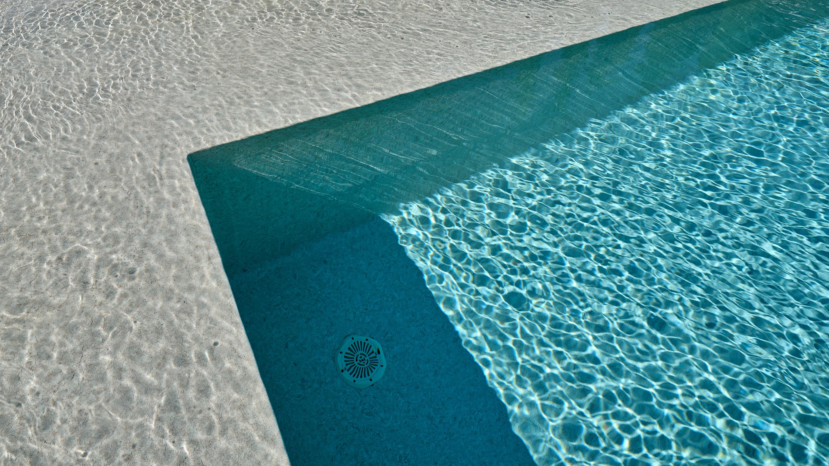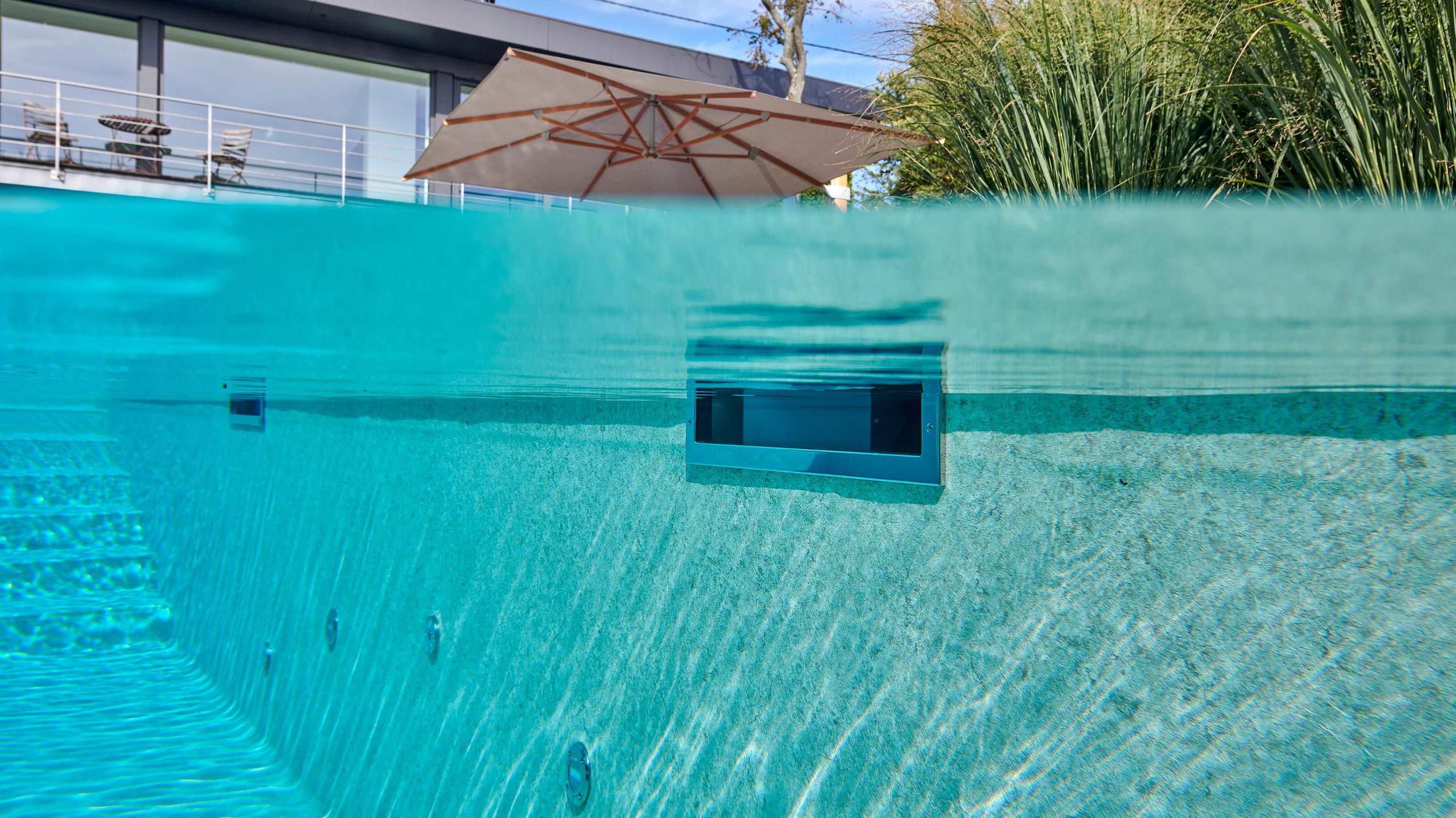 Der Pool ist von Naturstein- und Holzoberflächen umgeben und bietet durch seine verschiedenen Tiefen unterschiedliche Farbwirkungen des Wassers. Am Abend sorgen Ospa-LED-Scheinwerfer für das passende Farbenspiel.