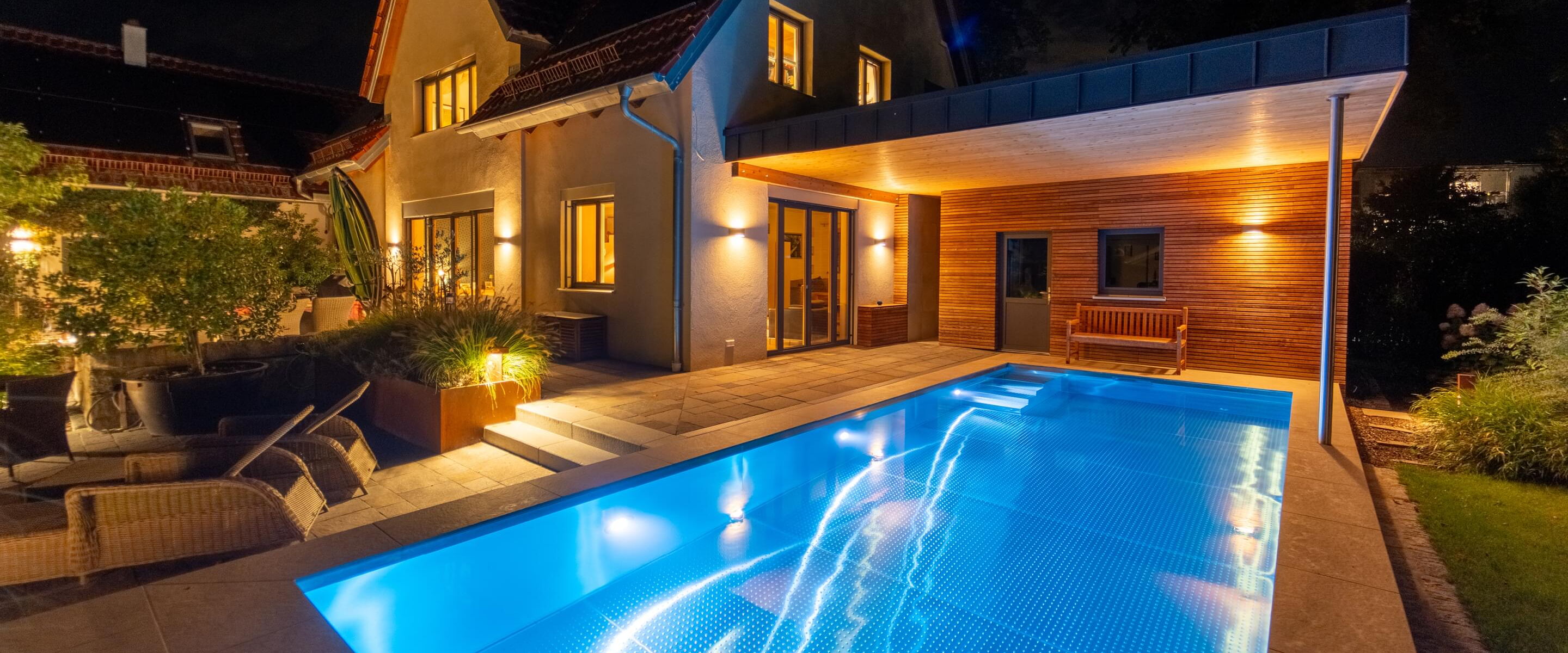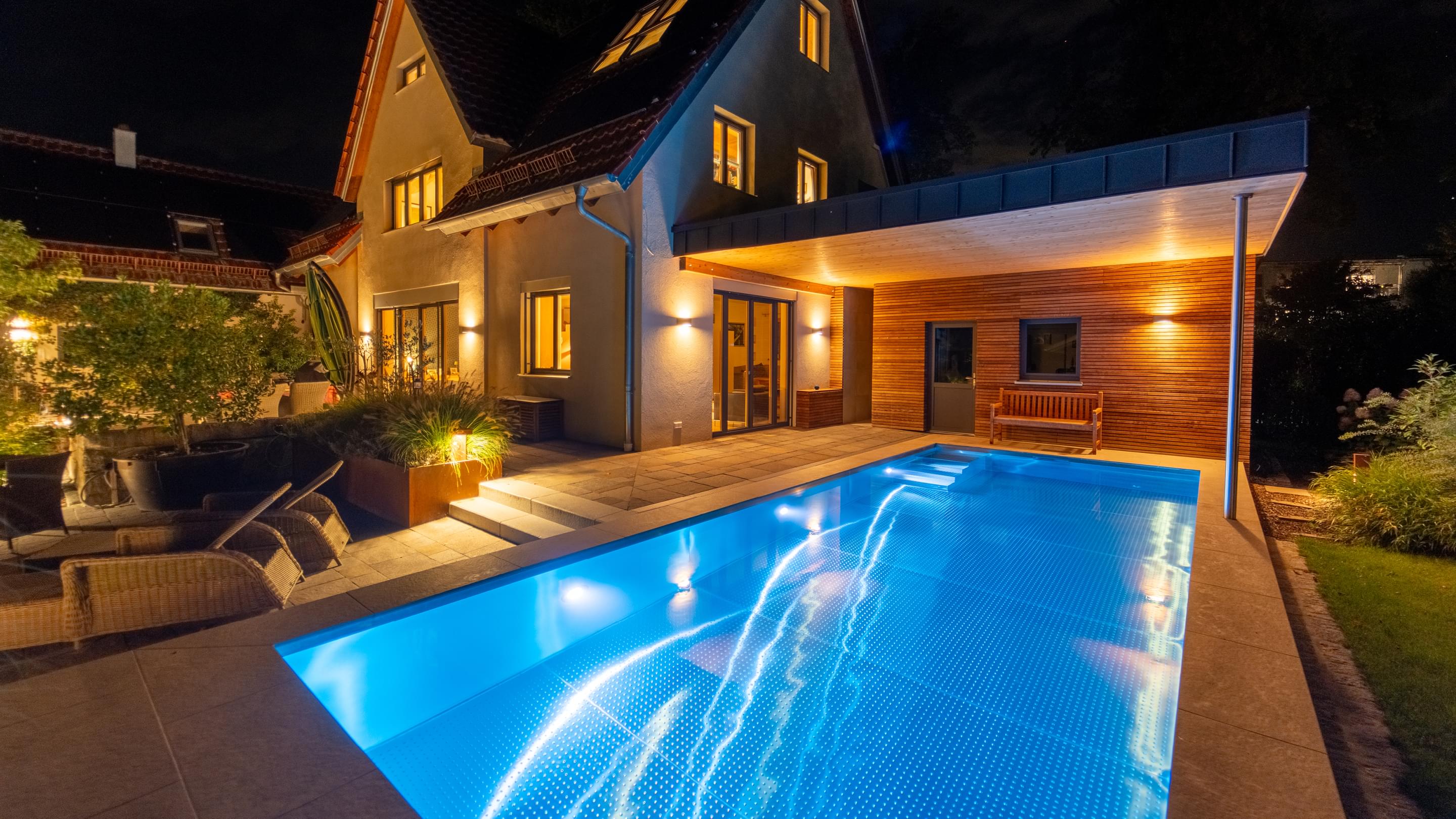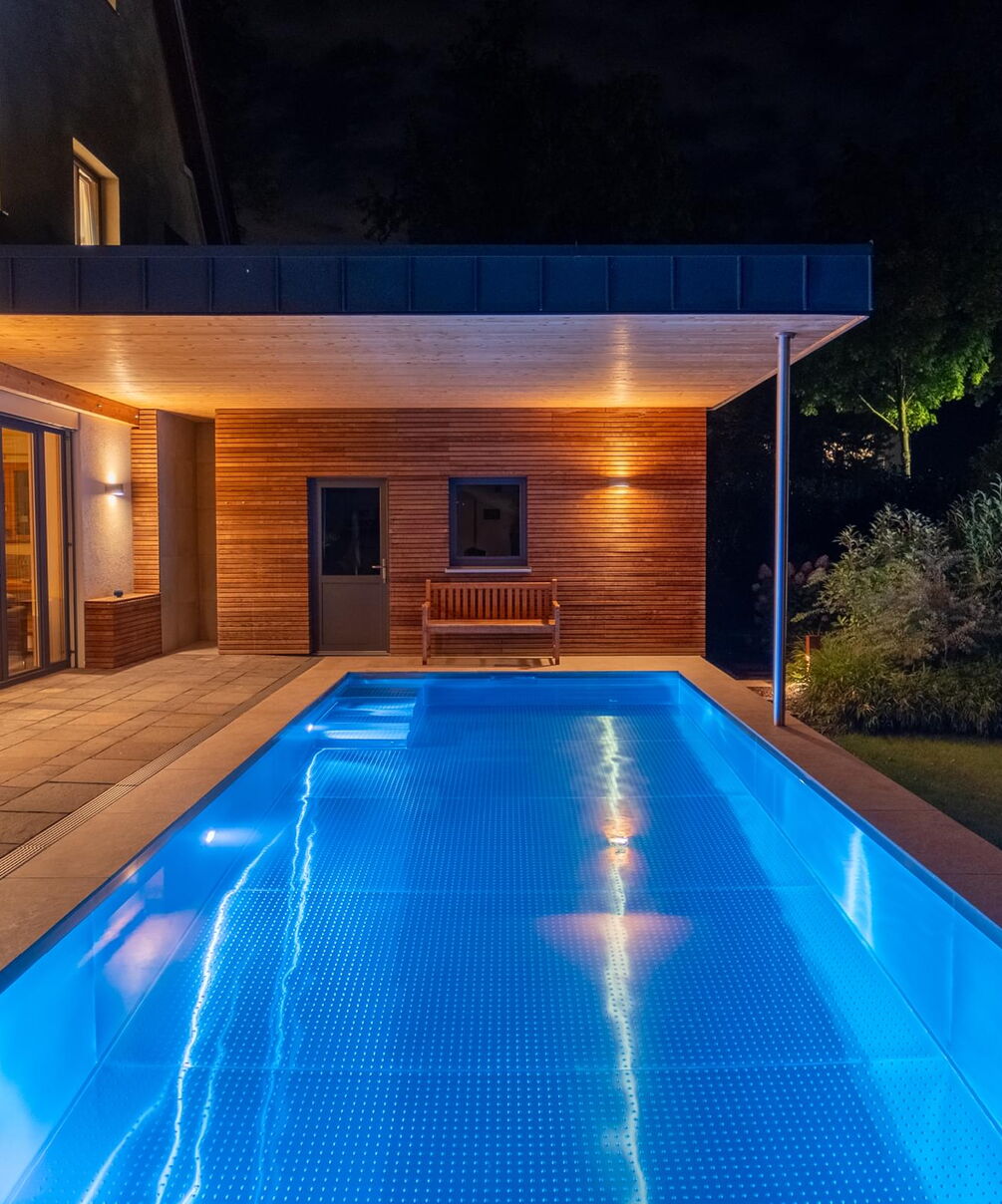 Tauchen Sie ein in fantasievolles und wundervoll farbiges Schwimmbadwasser und erleben Sie Momente einer ganz besonderen Stimmung während Sie durch das Wohlfühlwasser in Ihrem perfekten Schwimmbad gleiten. Bei Dunkelheit und Dämmerung heißt es dann "Licht aus, Spot an"