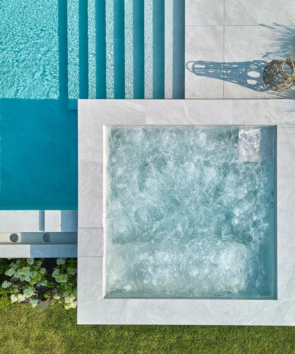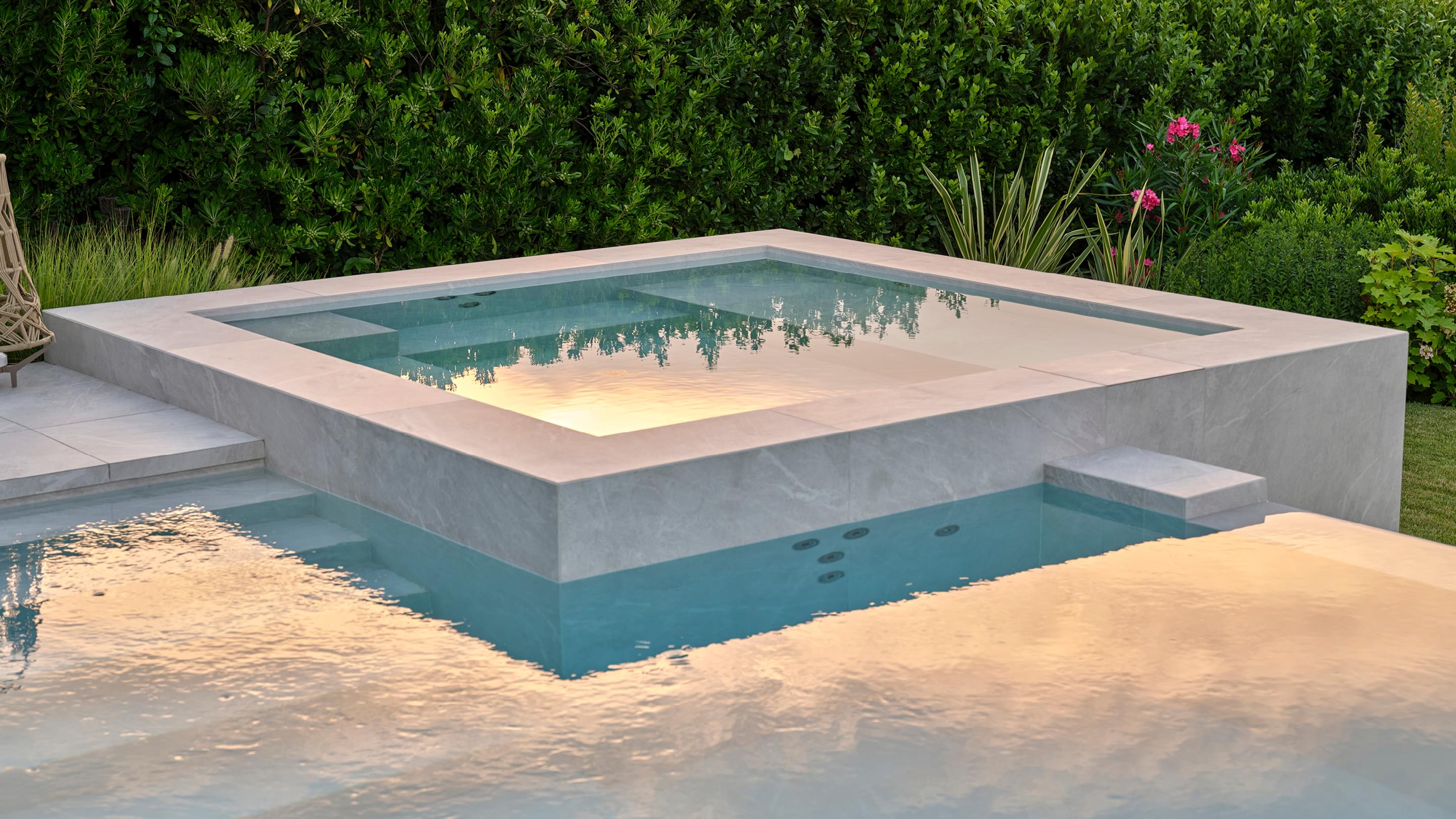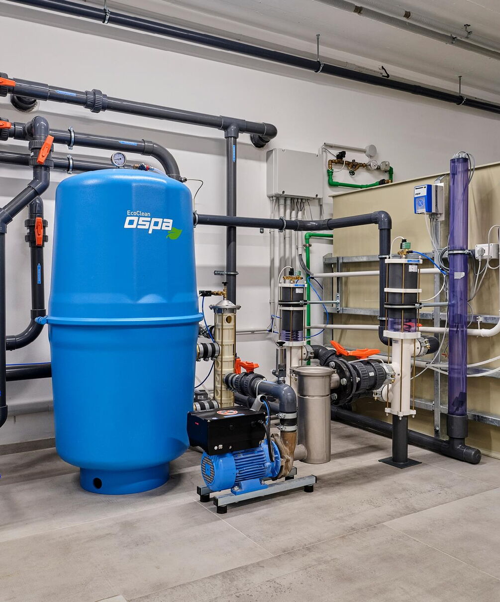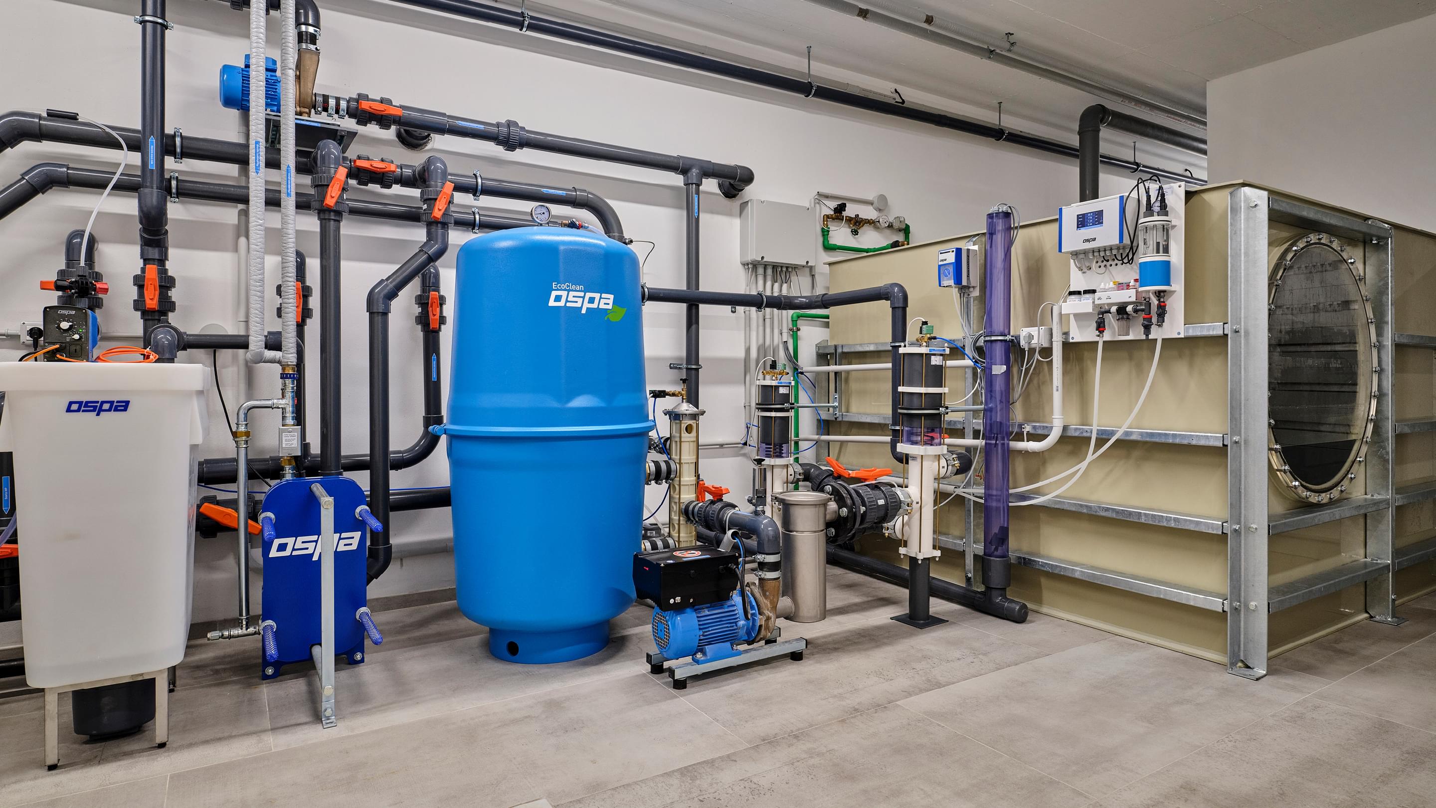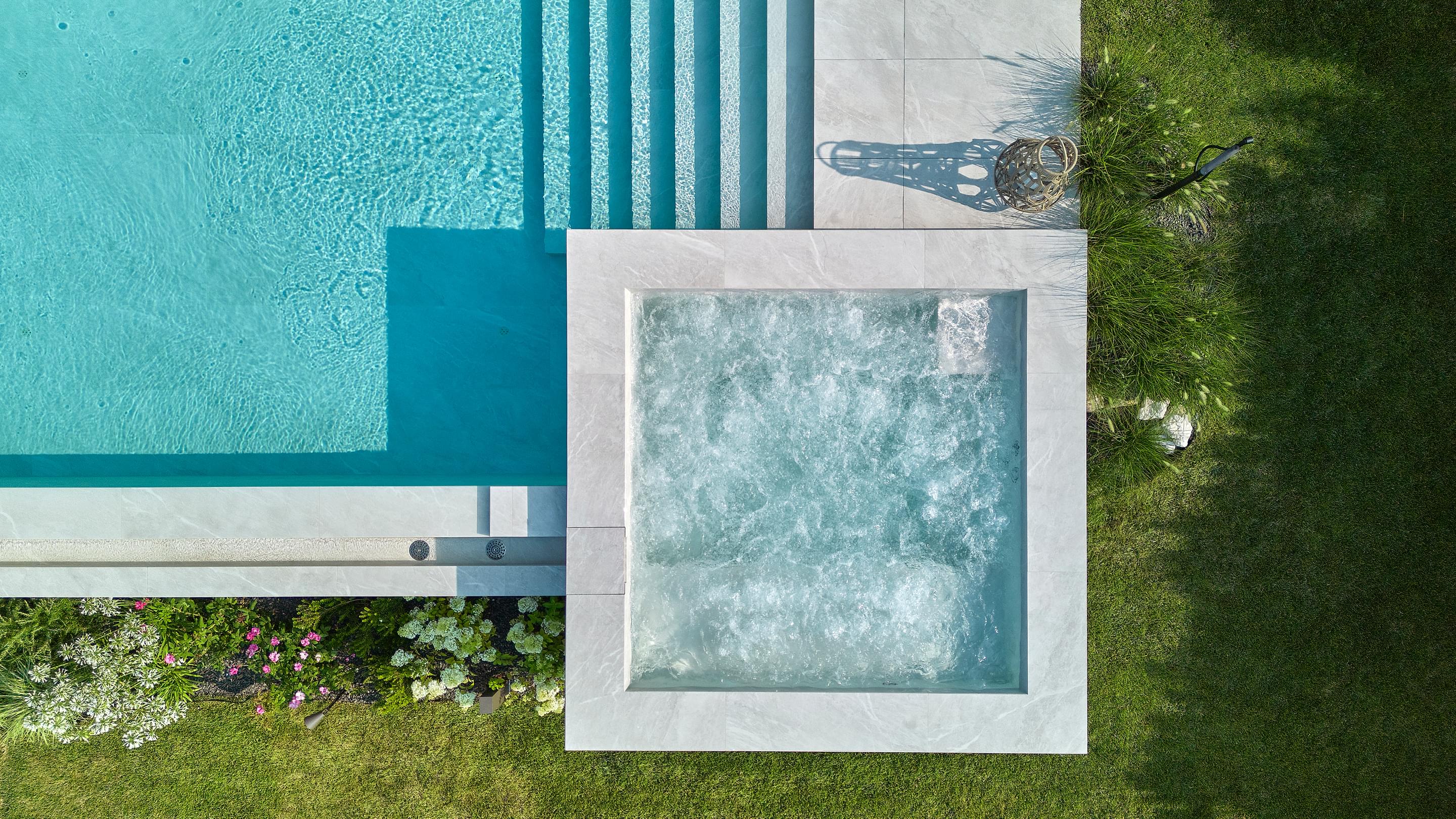Das betoniert geflieste Becken mit breiter Einstiegstreppe misst 10,40 x 4,00 Metern und hat eine Wassertiefe von 1,4 Meter. Der abgetrennte Whirlpool hat eine Wasserfläche von 2,4 × 2,4 Metern. Zur Pool-Ausstattung gehören eine Ospa-TopSwim 3 Gegenstromanlage und Massagestation Ospa-MassageT Air. Der Whirlpool besitzt zwei stufenlos einstellbare Gebläse, wovon eines für sie Massageliege, das andere für die Sitzbänke und den Fußbereich zuständig ist. Zusätzlich verfügt er über ein MassageT Air mit Fuß-Reflexzonenmassage. Die farbige LED-RGBW Unterwasserbeleuchtung sorgt für stimmungsvolle Abende am Pool.