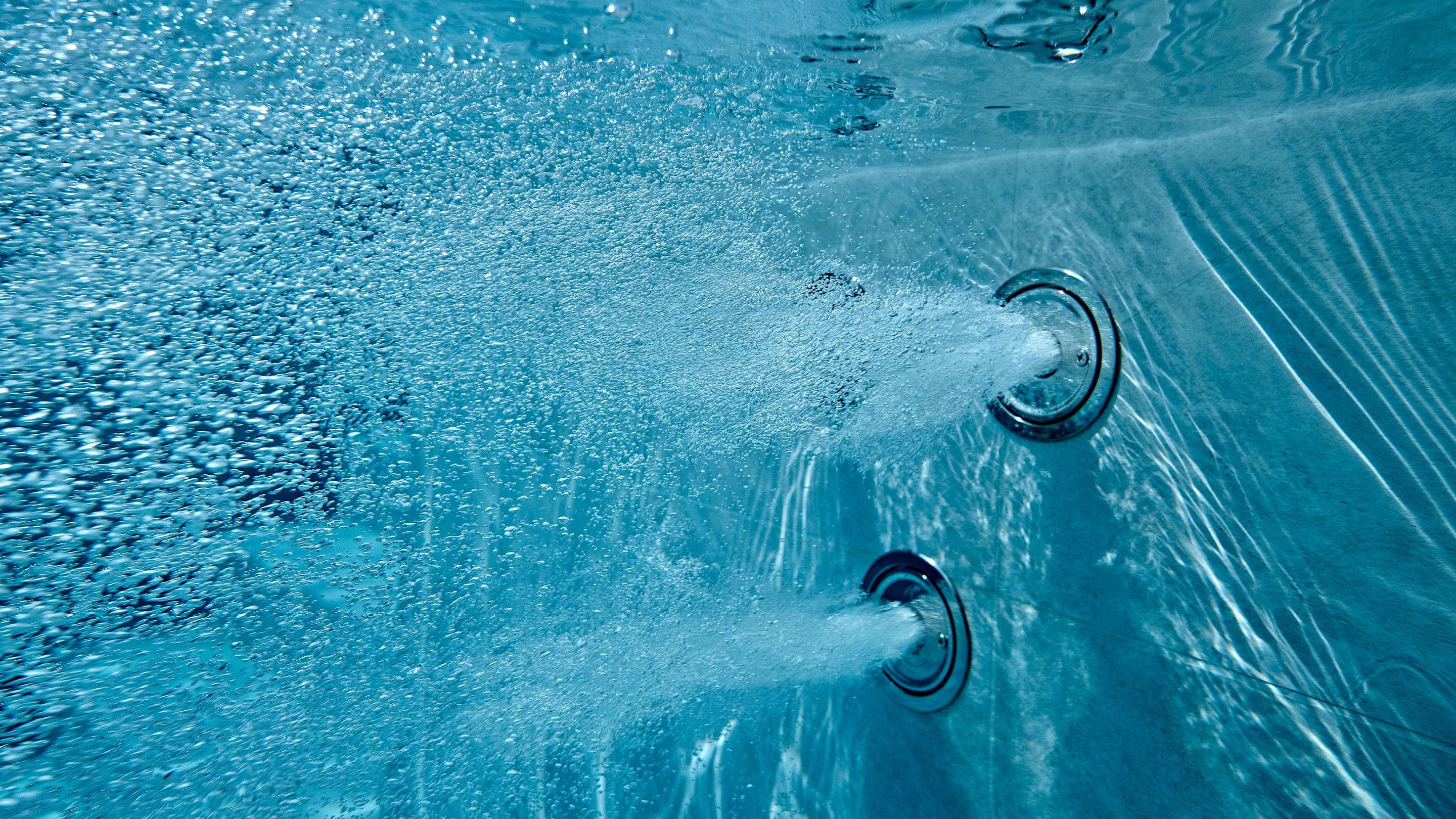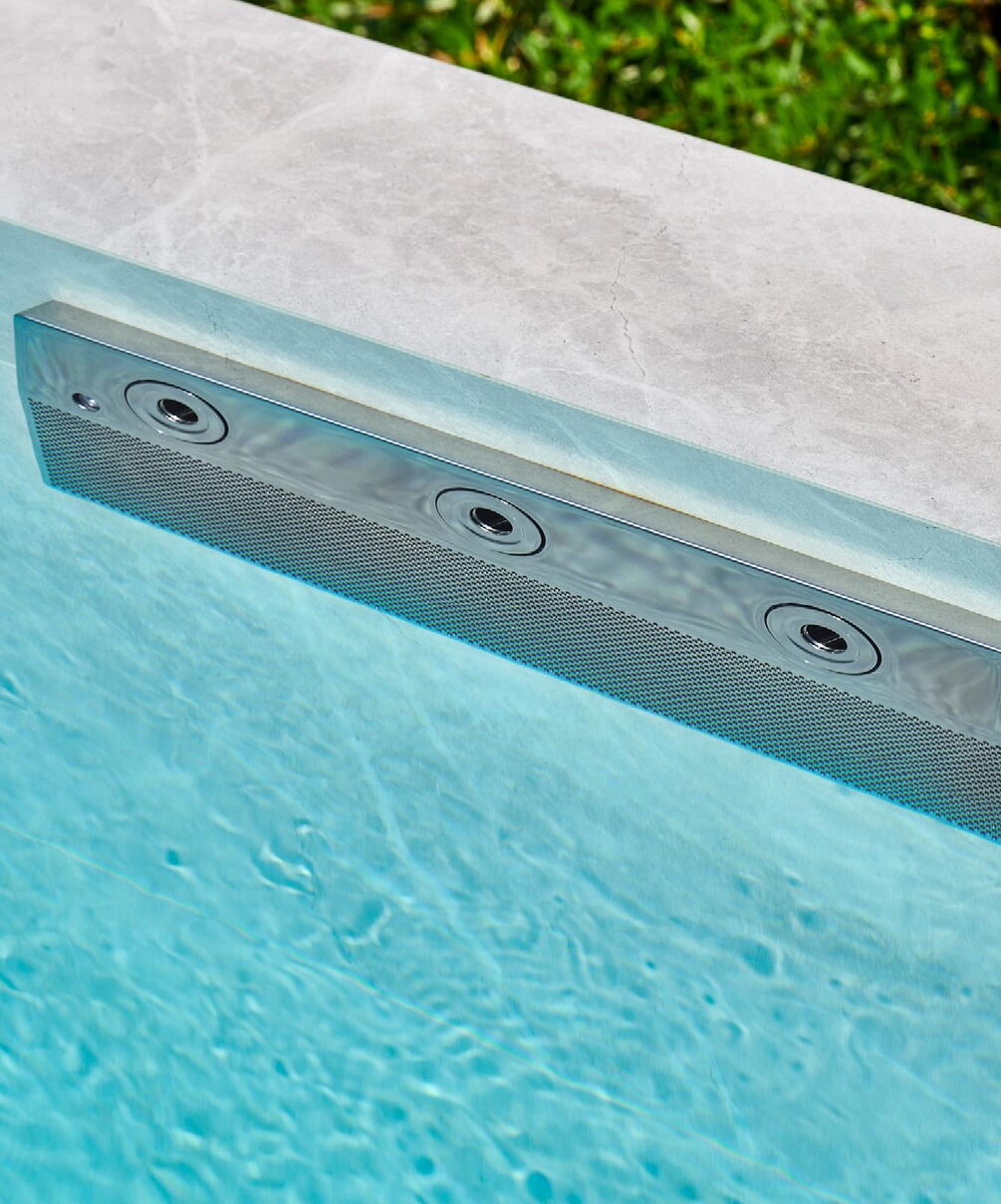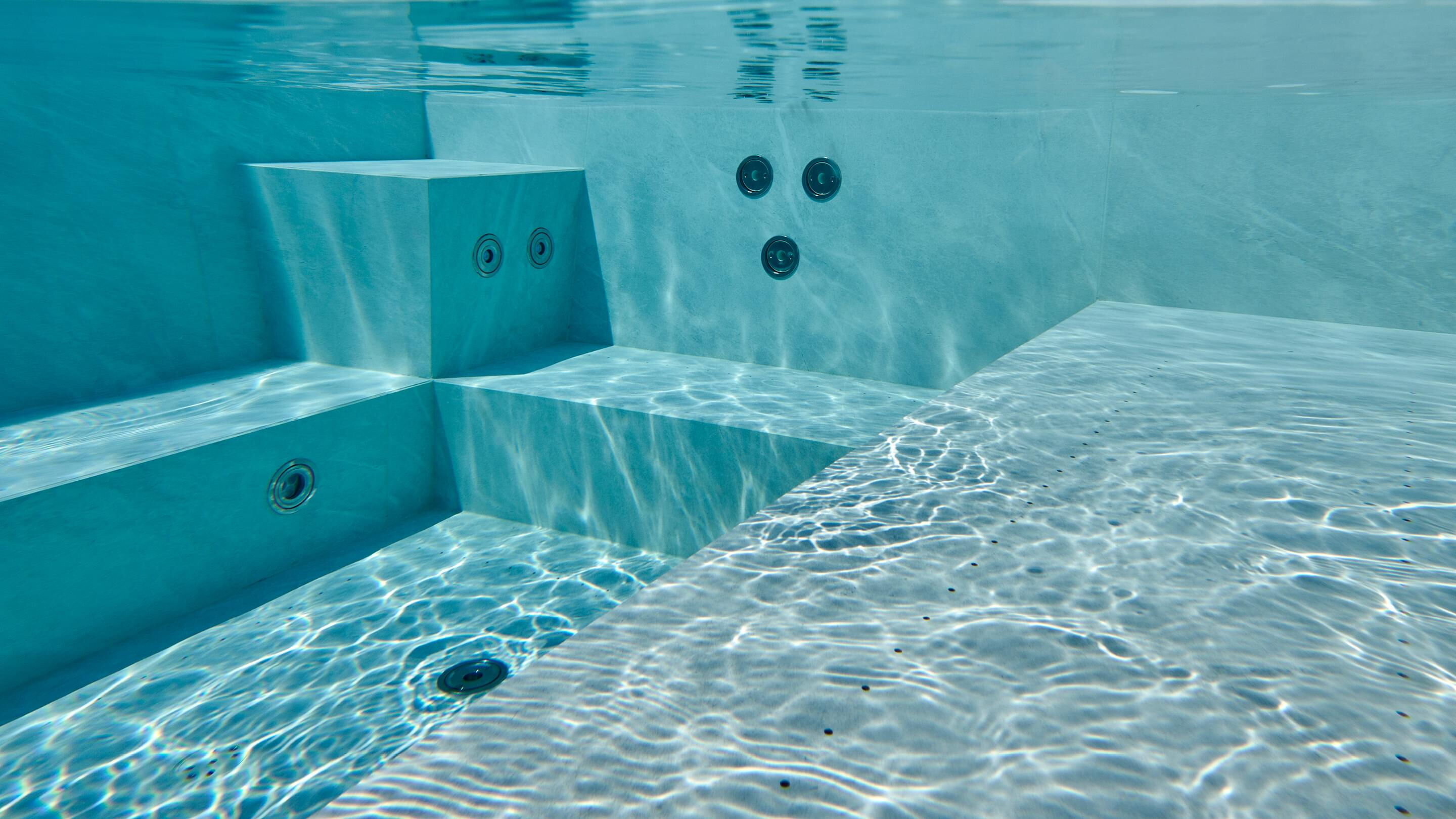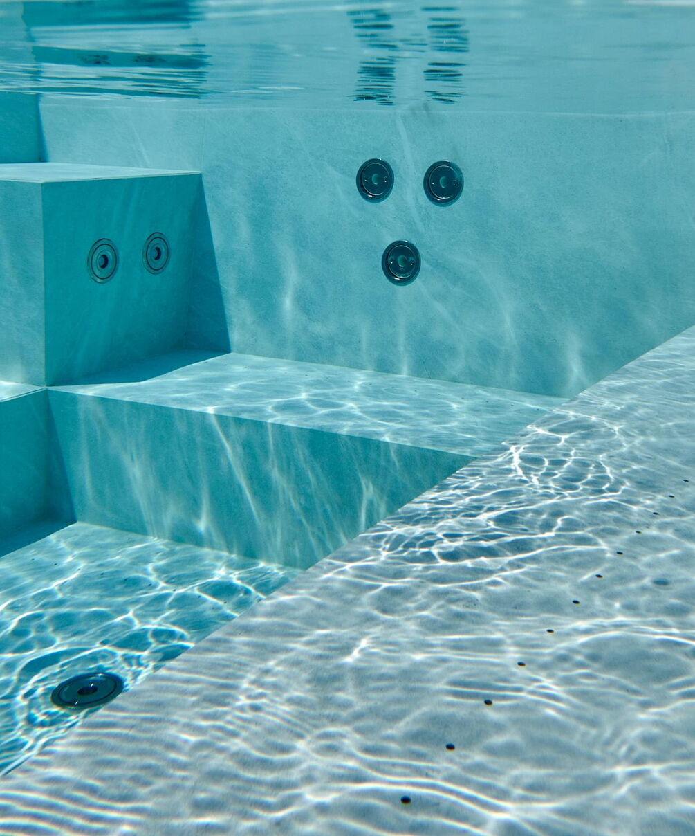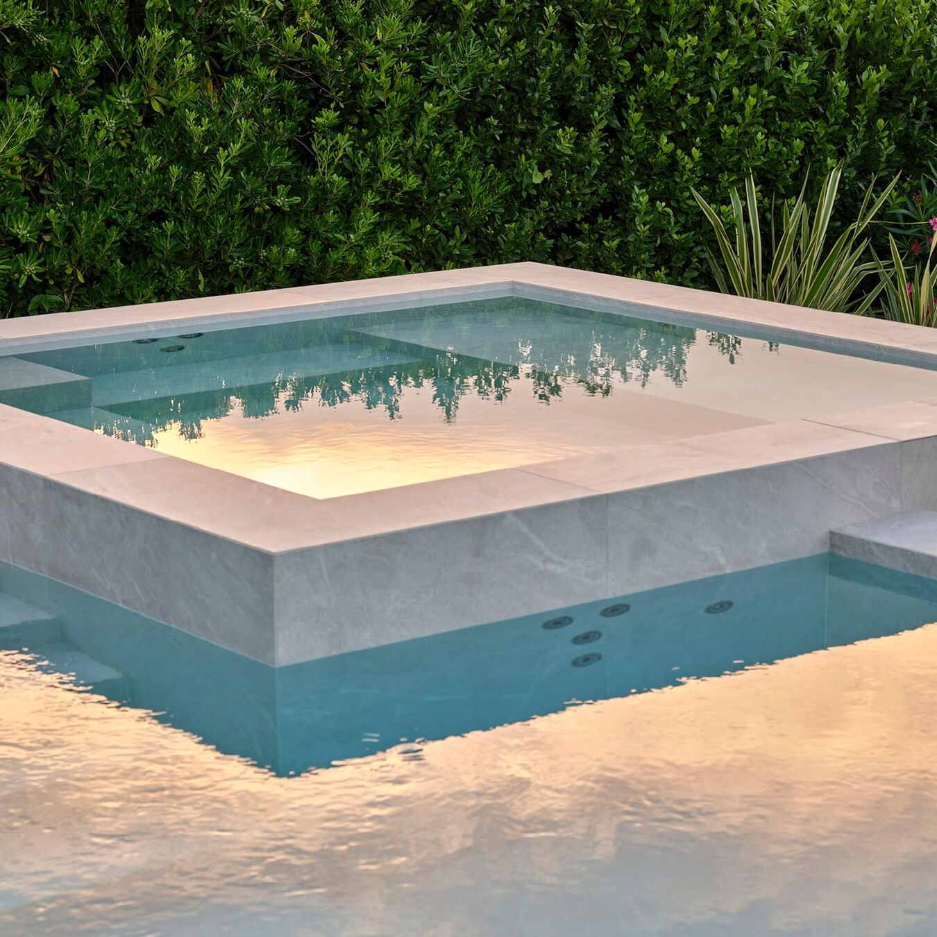 Das betoniert geflieste Becken mit breiter Einstiegstreppe misst 10,40 x 4,00 Metern und hat eine Wassertiefe von 1,4 Meter. Der abgetrennte Whirlpool hat eine Wasserfläche von 2,4 × 2,4 Metern. Zur Pool-Ausstattung gehören eine Ospa-TopSwim 3 Gegenstromanlage und Massagestation Ospa-MassageT Air. Der Whirlpool besitzt zwei stufenlos einstellbare Gebläse, wovon eines für sie Massageliege, das andere für die Sitzbänke und den Fußbereich zuständig ist. Zusätzlich verfügt er über ein MassageT Air mit Fuß-Reflexzonenmassage. Die farbige LED-RGBW Unterwasserbeleuchtung sorgt für stimmungsvolle Abende am Pool.