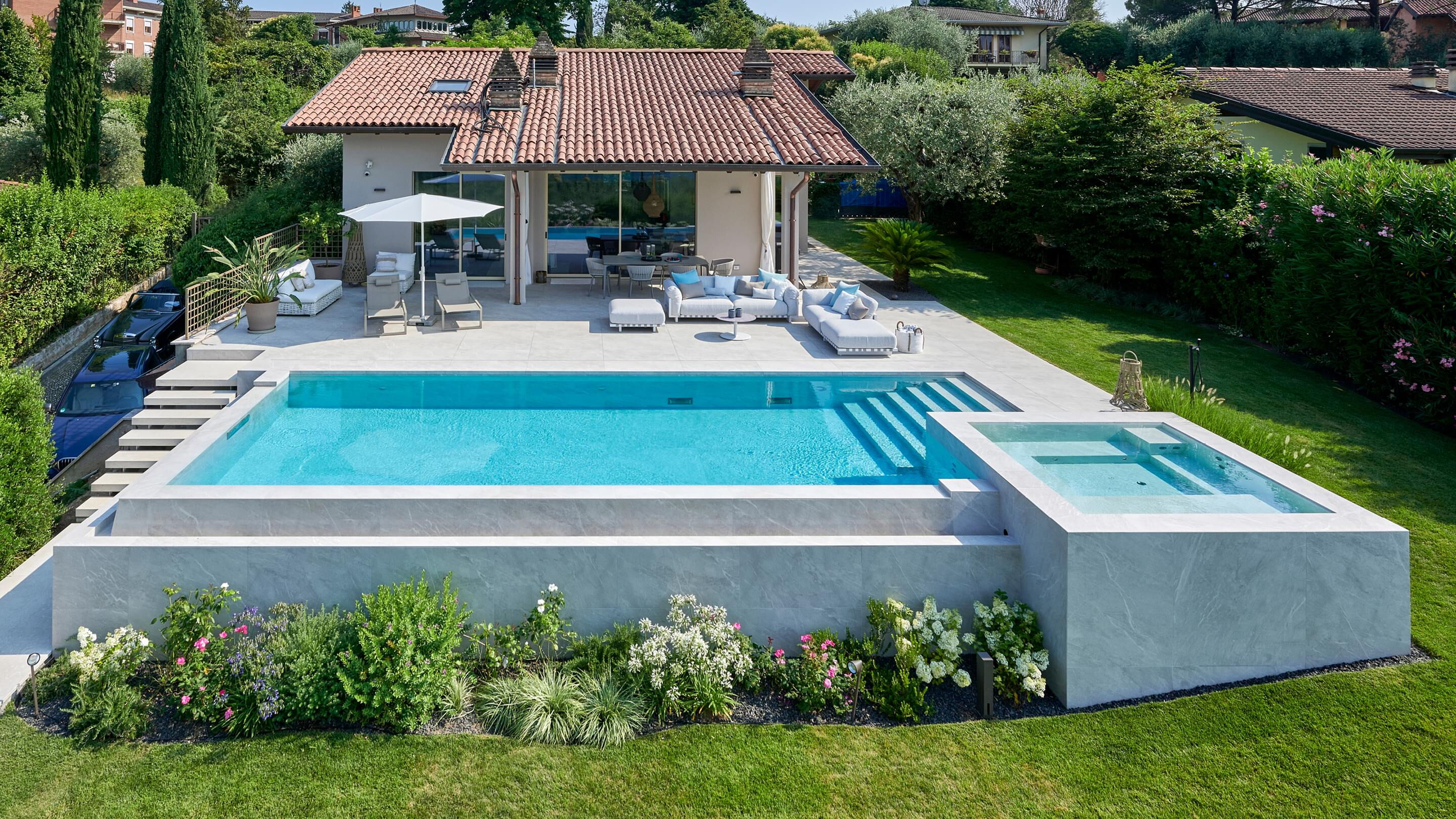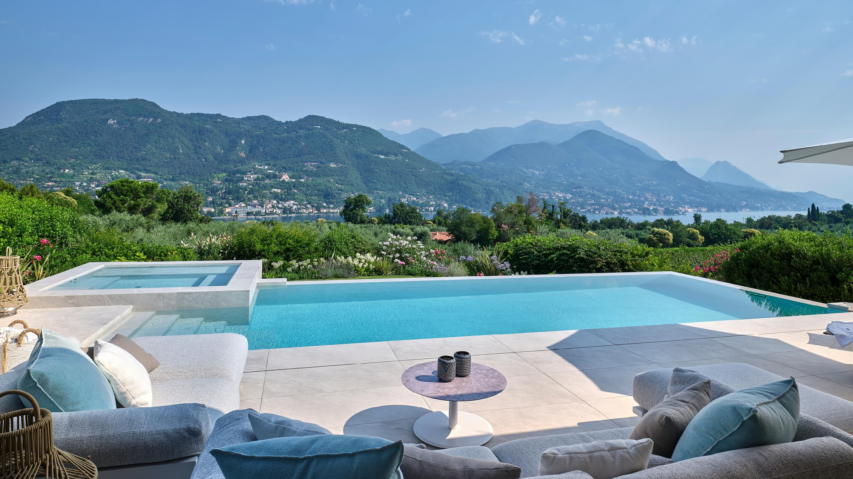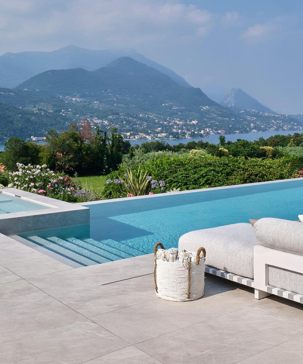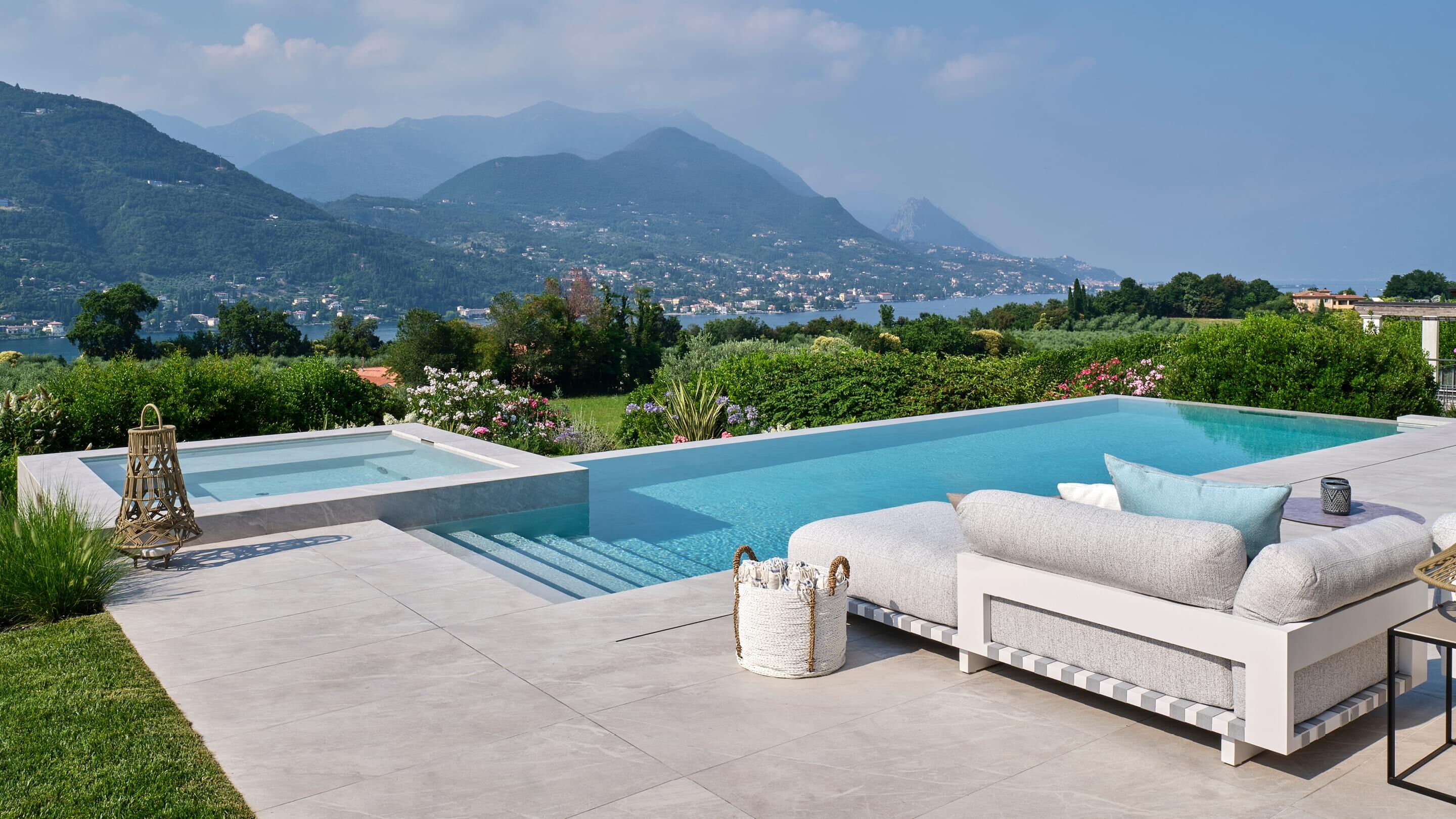 Was die Eigentümer vom ersten Tag an ihrem ruhig gelegenen Grundstück am Gardasee begeisterte, war die traumhafte Lage. 75 m über dem See bietet sich für den Betrachter eine unverbaubare Aussicht auf die umliegenden Berge und den „Golfo di Salò“. Jetzt fehlte nur noch der passende Pool. Der Garten bot genug Potenzial, um die eigenen Vorstellungen von einer Poollandschaft verwirklichen zu können: einen Außenpool mit Infinity-Rinne auf zwei Seiten plus Whirlpool.