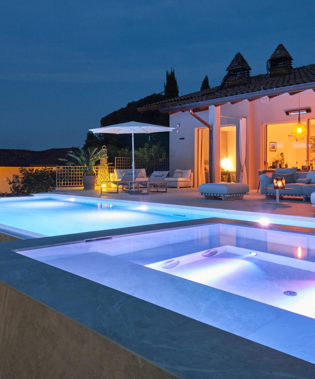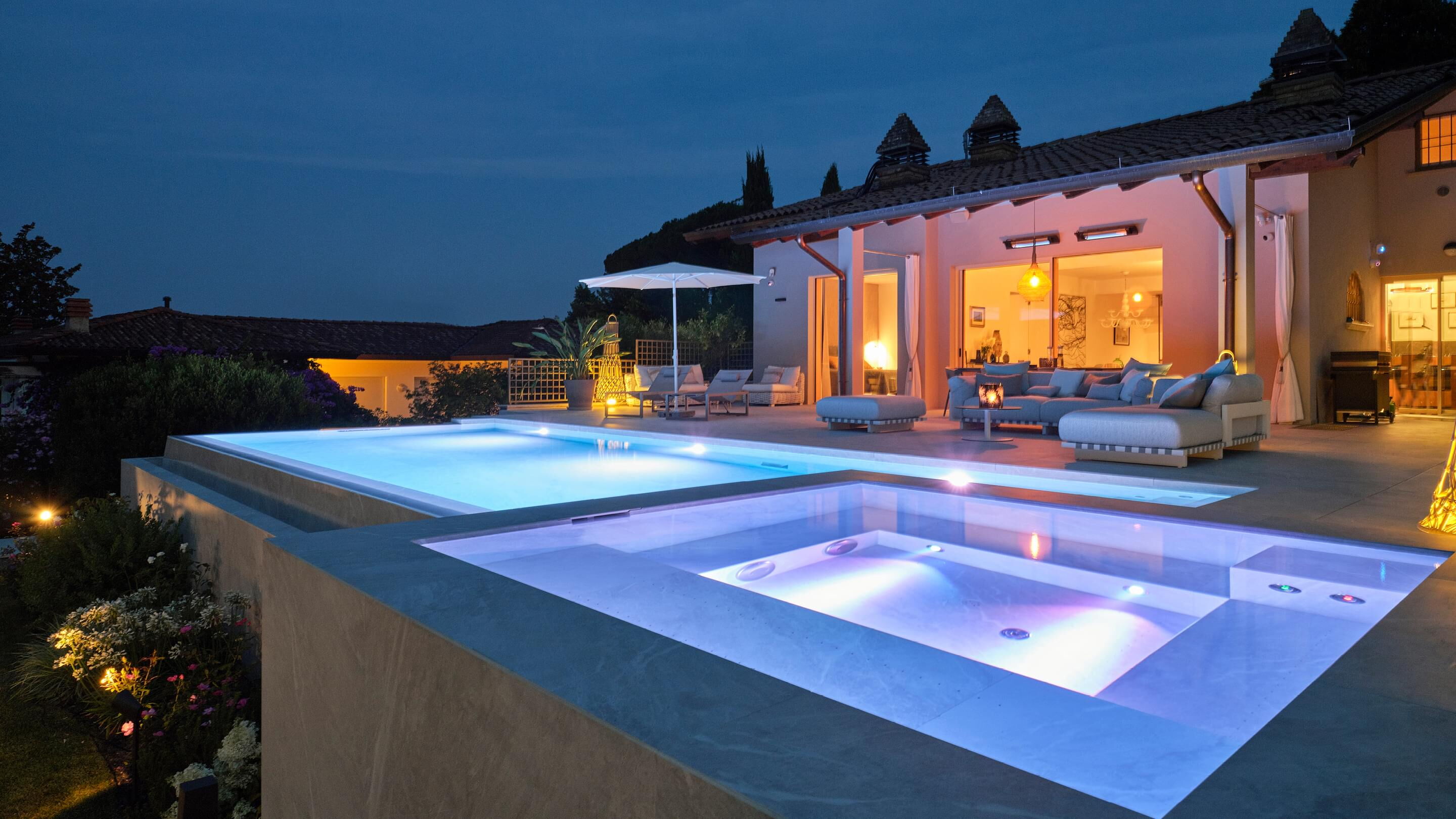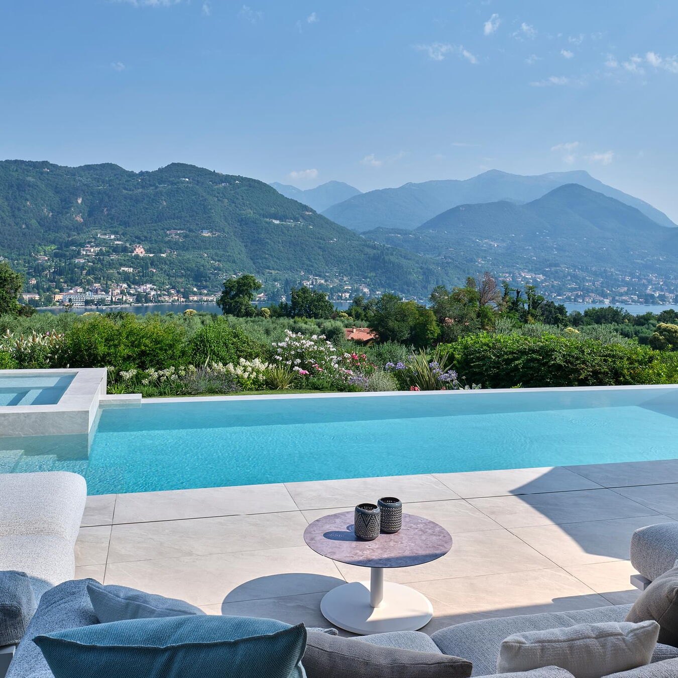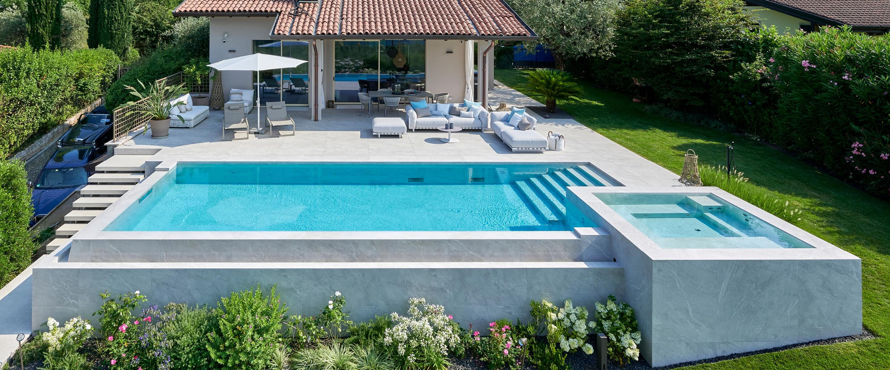 Was die Eigentümer vom ersten Tag an ihrem ruhig gelegenen Grundstück am Gardasee begeisterte, war die traumhafte Lage. 75 m über dem See bietet sich für den Betrachter eine unverbaubare Aussicht auf die umliegenden Berge und den „Golfo di Salò“. Jetzt fehlte nur noch der passende Pool. Der Garten bot genug Potenzial, um die eigenen Vorstellungen von einer Poollandschaft verwirklichen zu können: einen Außenpool mit Infinity-Rinne auf zwei Seiten plus Whirlpool.