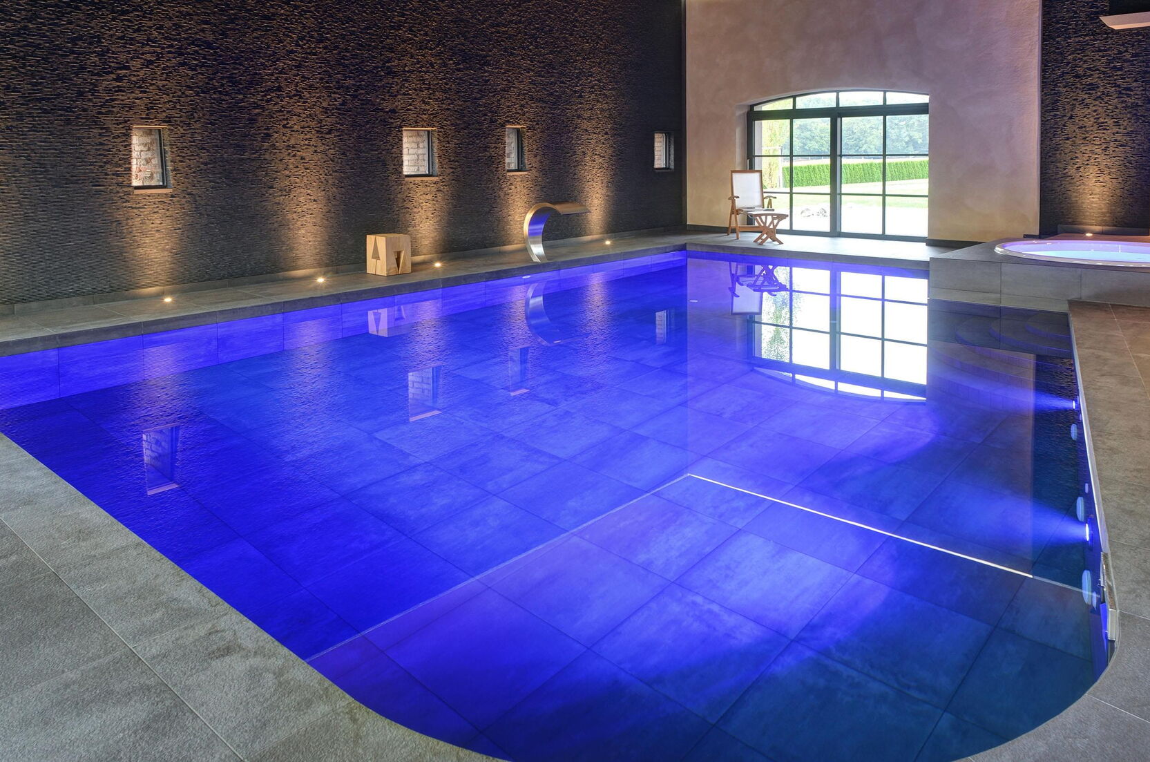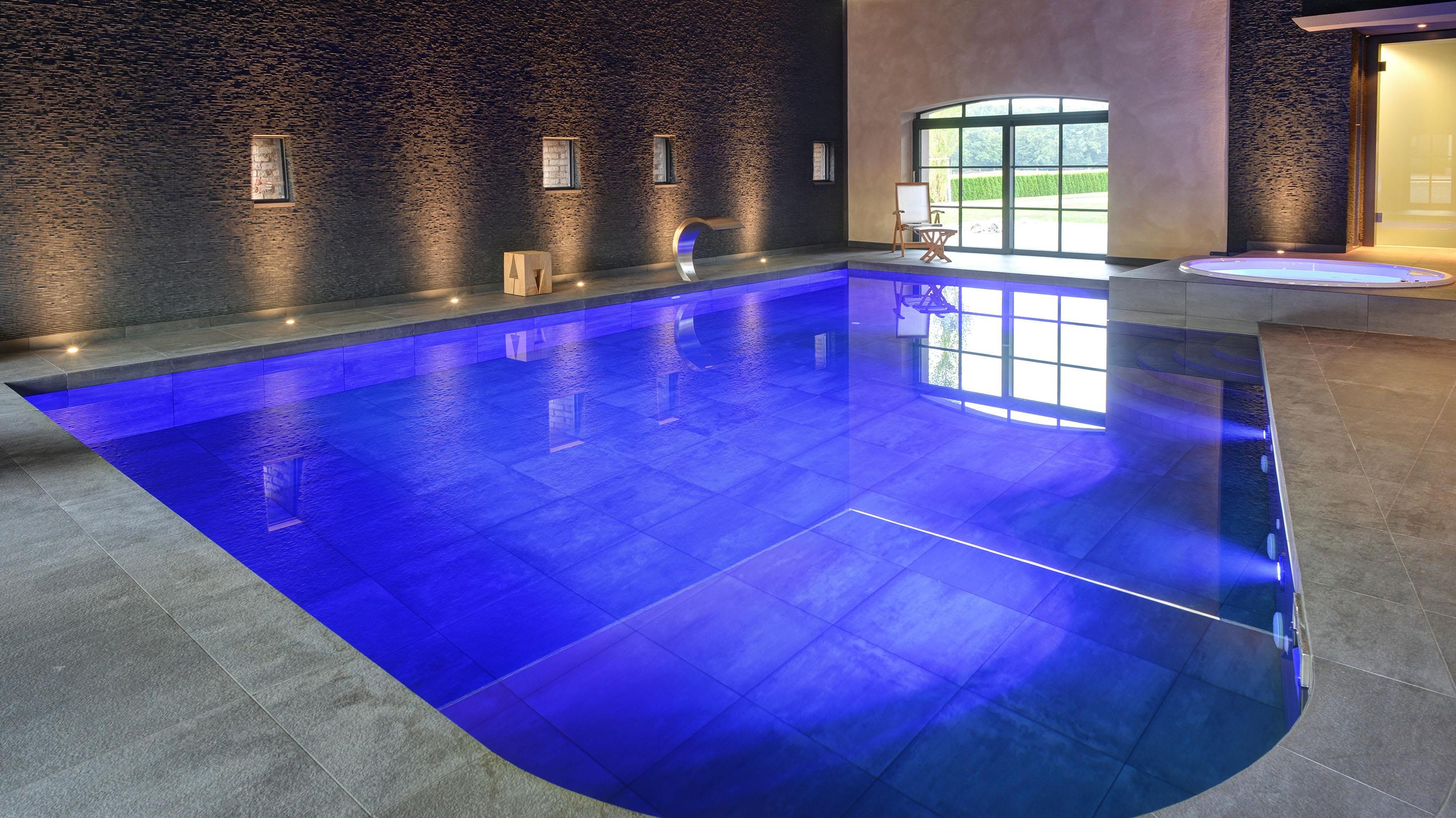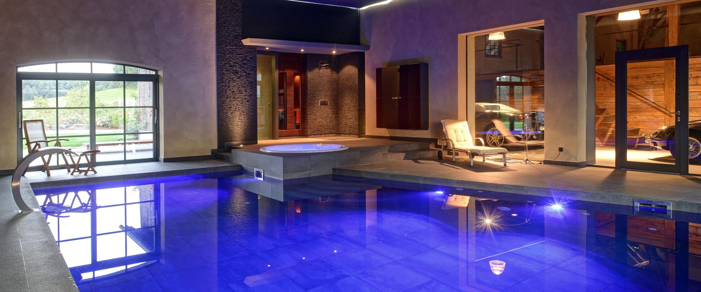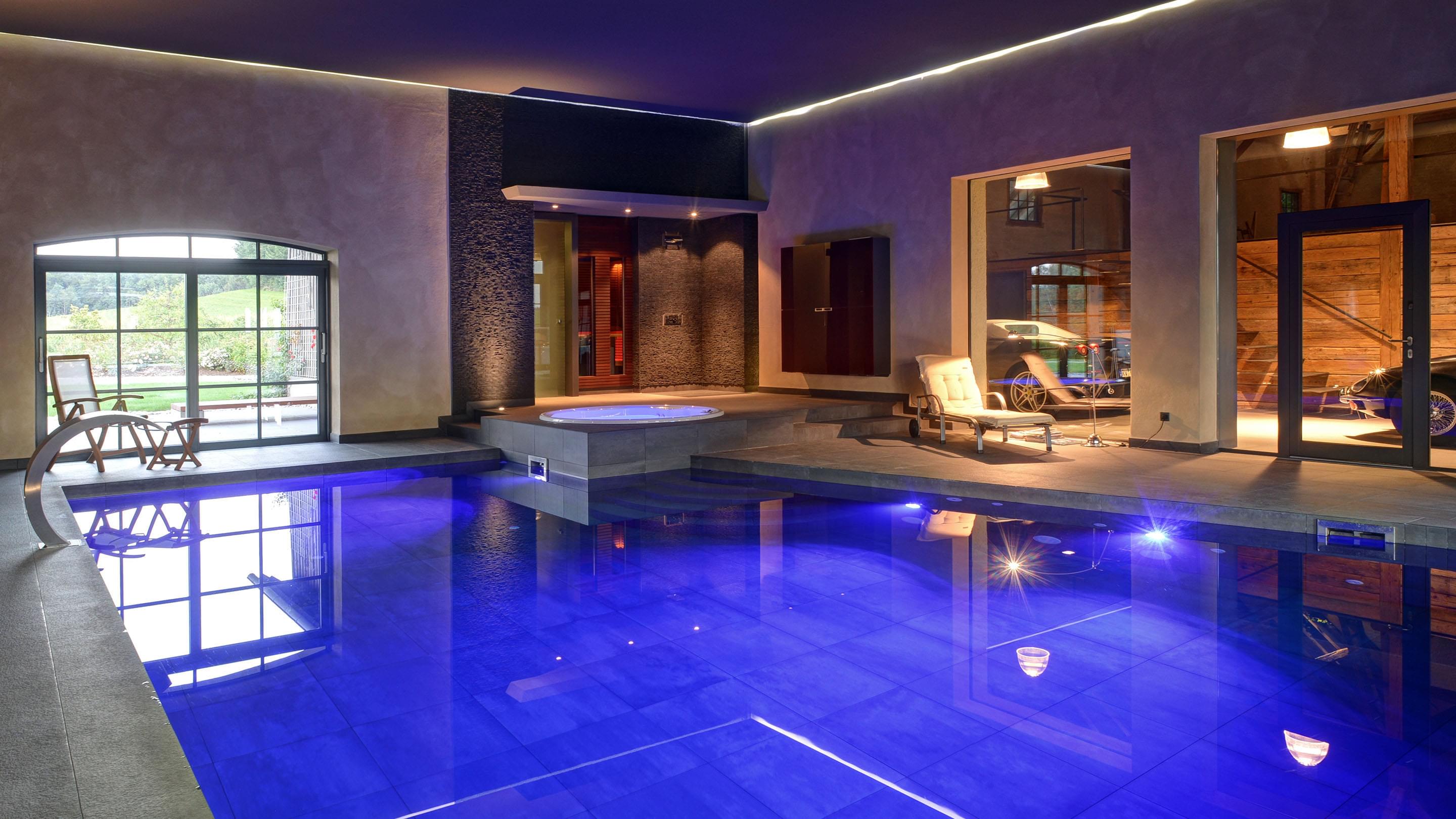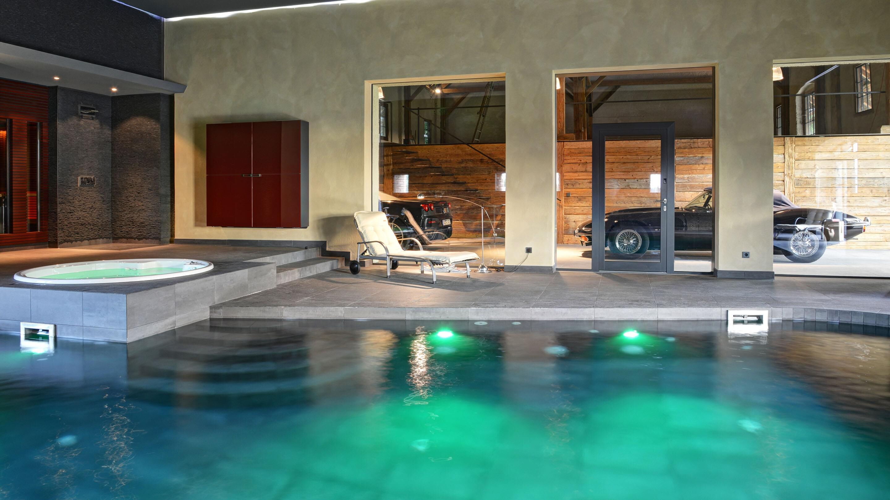 Für den Bauherrn ist diese Wellness-Oase zum Lieblingsplatz avanciert. Hier findet er alles was ihm Freude bereitet: Der 6 x 9 m große geflieste Pool bietet den sportlichen Ausgleich zum Arbeitsalltag. Sauna und Dampfbad bringen den Kreislauf in Schwung und der Whirlpool sorgt für Entspannung. Große Glasfronten ermöglichen eine gute Sicht auf Sammlerobjekte der besonderen Art: Sportwagen. Da kommt man beim Schwimmen schon mal ins Schwärmen.
