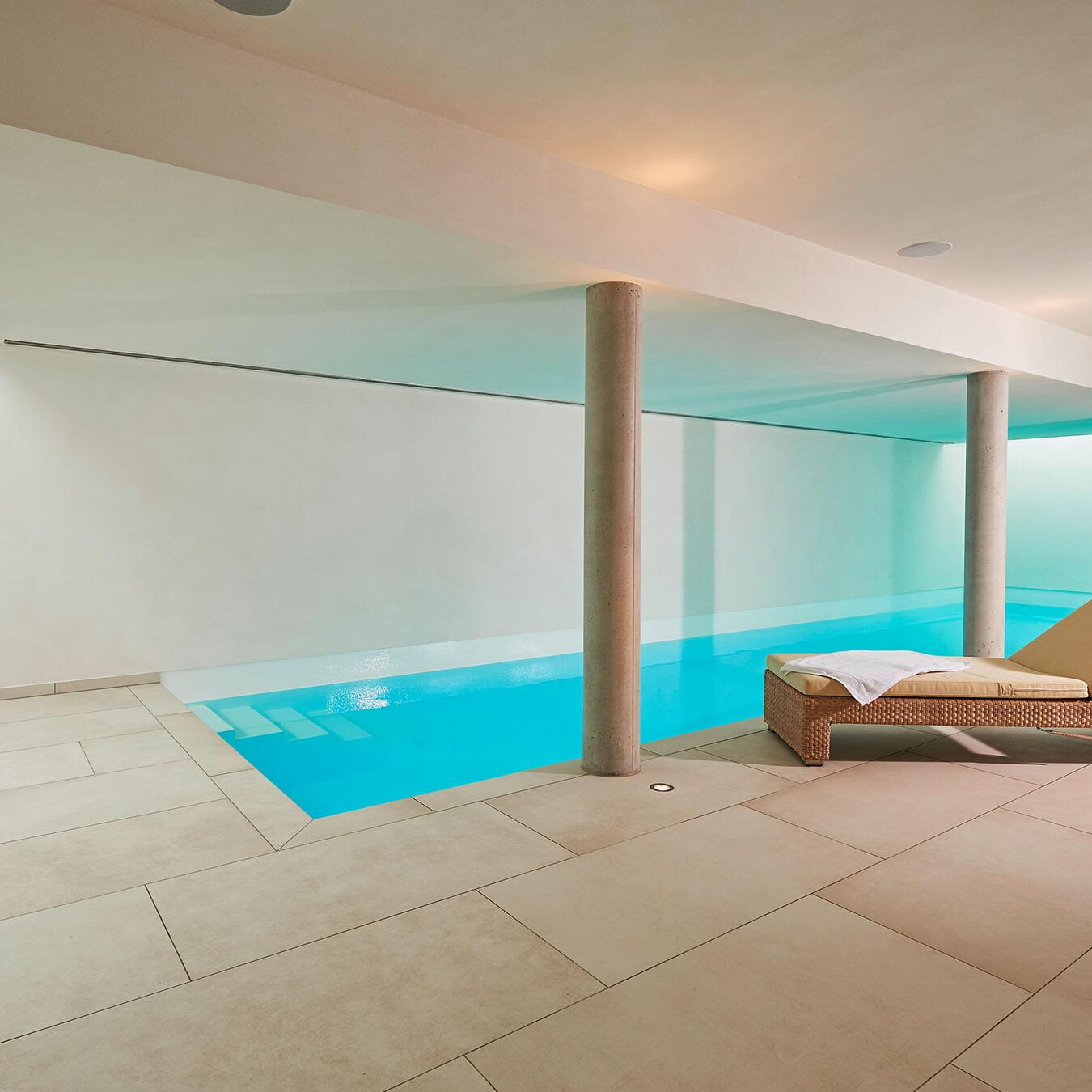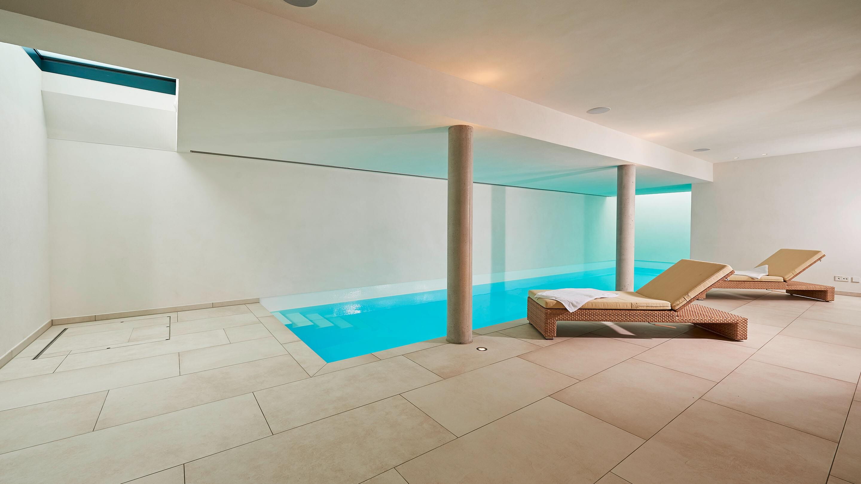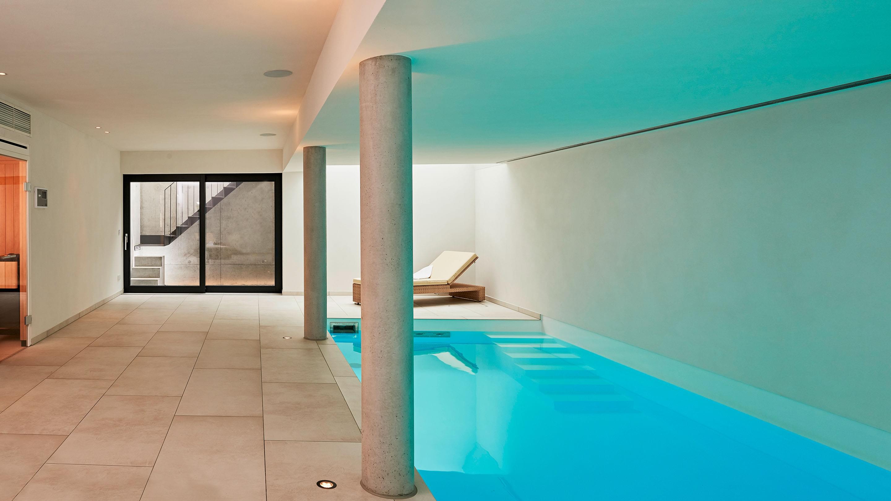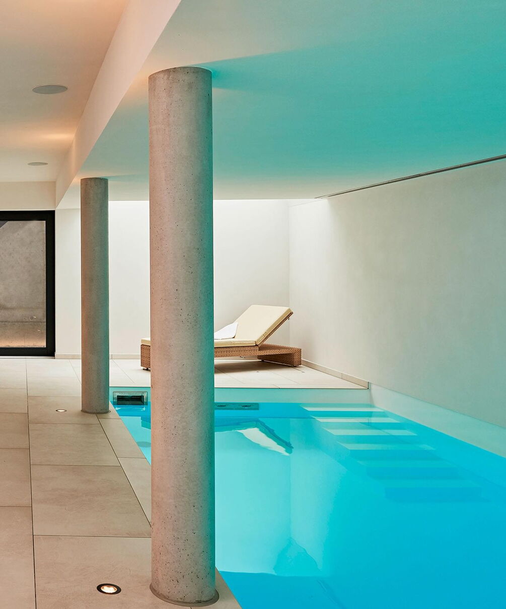 Die Terrasse ist vom Schwimm- und Wellnessbereich über eine Schiebetür auf kurzem Wege zugänglich. Im Pool-Bereich sorgen zwei großzügige stirnseitig angebrachte Oberlichter für Tageslicht sowie eine Ospa-LED-Unterwasserbeleuchtung für eine atmosphärisch-warme Beleuchtung bei Dunkelheit. Im 11,50 m langen Pool ist außerdem eine Gegenstromanlage installiert – zügiges Schwimmen ohne Wenden ist dadurch problemlos möglich. Die auf den ersten Blick schlichte Konstruktion wird von Sichtbetonsäulen getragen. Sie bestimmen die Optik und werden durch Feinsteinzeug und Putz in ihrer Wirkung betont. Das Material der Säulen wiederholt sich auch in der sechsstufigen Einstiegstreppe ins Becken, die das puristische Design des gesamten Bereichs gekonnt fortführt. Für jederzeit perfektes Wohlfühlwasser sorgt die Ospa Wasseraufbereitungsanlage bestehend aus der Schwimmbadsteuerung Ospa-BlueControl, Ospa-Superfilter mit zusätzlicher Aktivkohleschicht und Ospa-BlueClear®-Desinfektion. Über die Schwimmbadsteuerung Ospa-BlueControl IV Web können alle Wasserattraktionen und die Schwimmbadtechnik bequem und einfach per Touchscreen gesteuert werden.