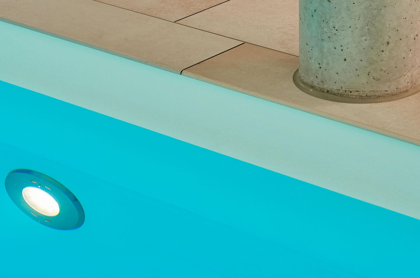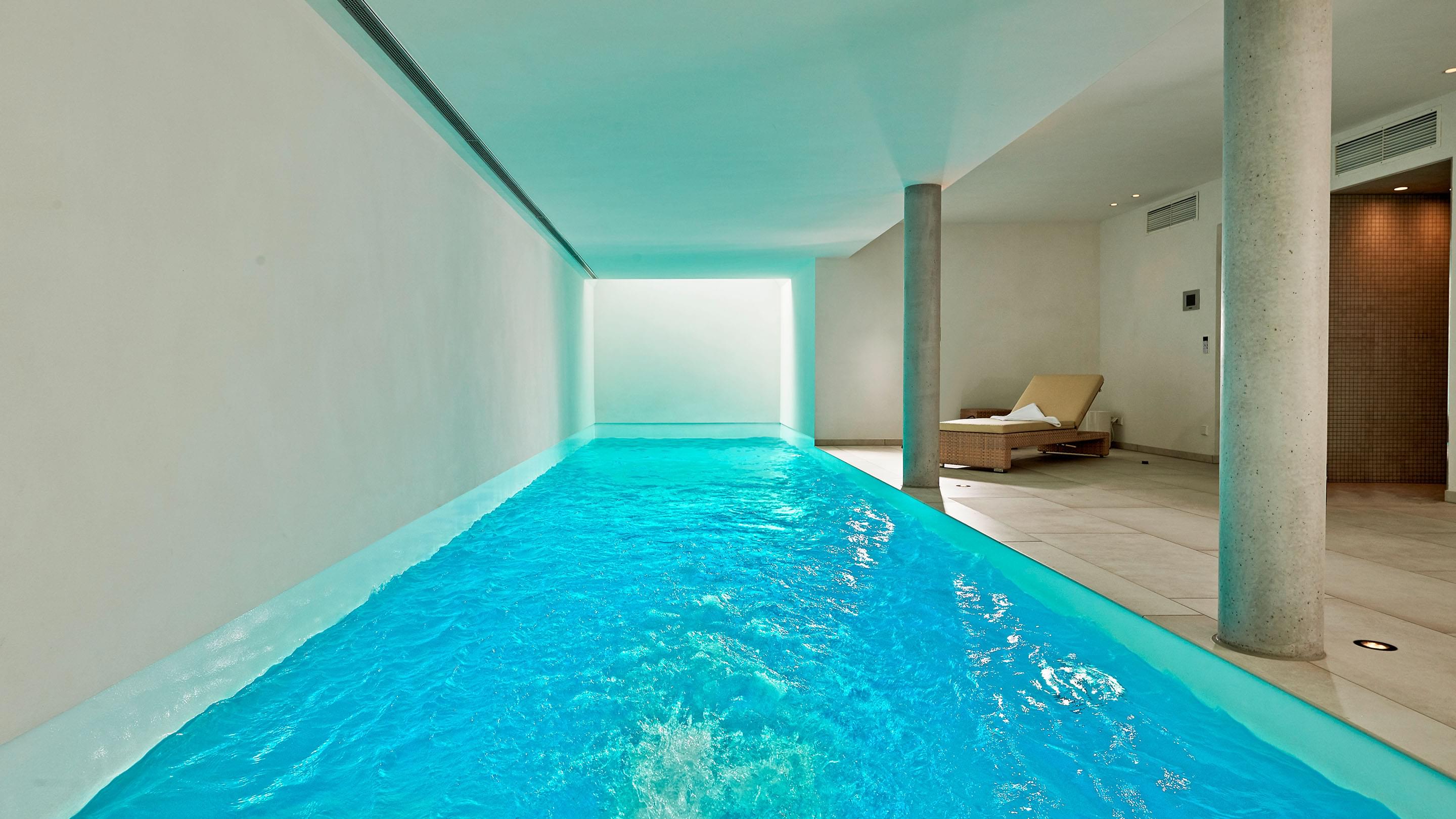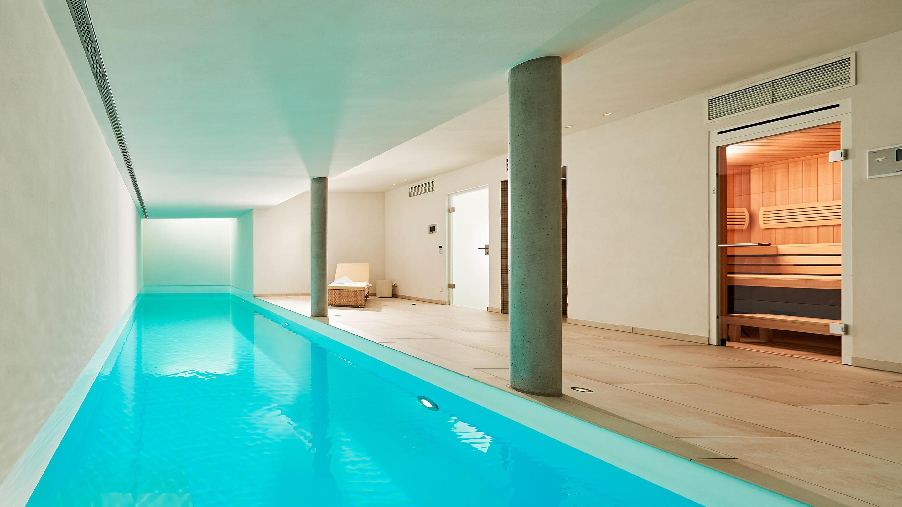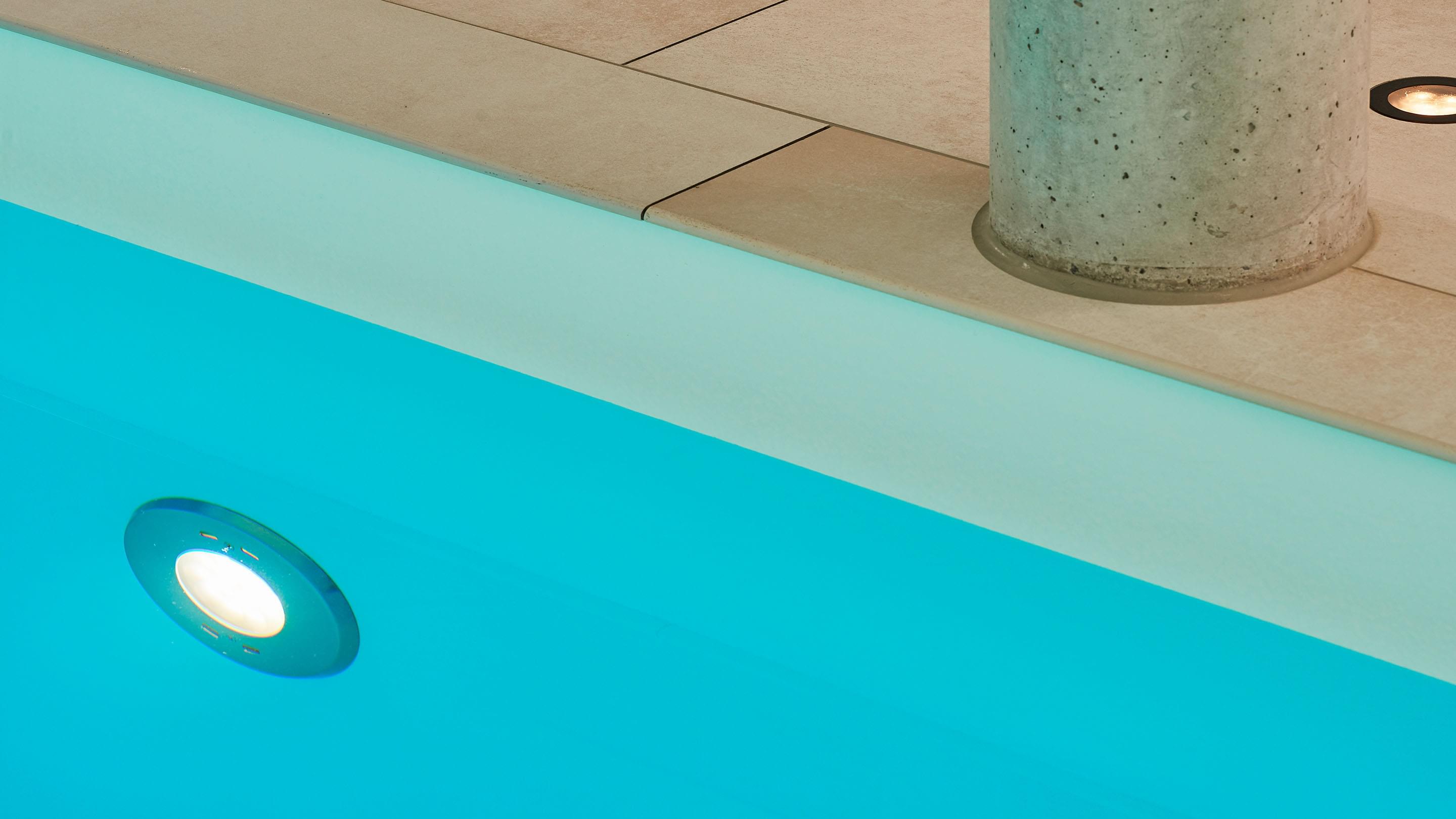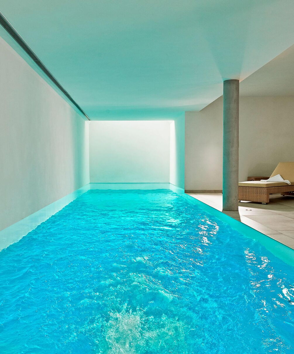 Die Terrasse ist vom Schwimm- und Wellnessbereich über eine Schiebetür auf kurzem Wege zugänglich. Im Pool-Bereich sorgen zwei großzügige stirnseitig angebrachte Oberlichter für Tageslicht sowie eine Ospa-LED-Unterwasserbeleuchtung für eine atmosphärisch-warme Beleuchtung bei Dunkelheit. Im 11,50 m langen Pool ist außerdem eine Gegenstromanlage installiert – zügiges Schwimmen ohne Wenden ist dadurch problemlos möglich. Die auf den ersten Blick schlichte Konstruktion wird von Sichtbetonsäulen getragen. Sie bestimmen die Optik und werden durch Feinsteinzeug und Putz in ihrer Wirkung betont. Das Material der Säulen wiederholt sich auch in der sechsstufigen Einstiegstreppe ins Becken, die das puristische Design des gesamten Bereichs gekonnt fortführt. Für jederzeit perfektes Wohlfühlwasser sorgt die Ospa Wasseraufbereitungsanlage bestehend aus der Schwimmbadsteuerung Ospa-BlueControl, Ospa-Superfilter mit zusätzlicher Aktivkohleschicht und Ospa-BlueClear®-Desinfektion. Über die Schwimmbadsteuerung Ospa-BlueControl IV Web können alle Wasserattraktionen und die Schwimmbadtechnik bequem und einfach per Touchscreen gesteuert werden.