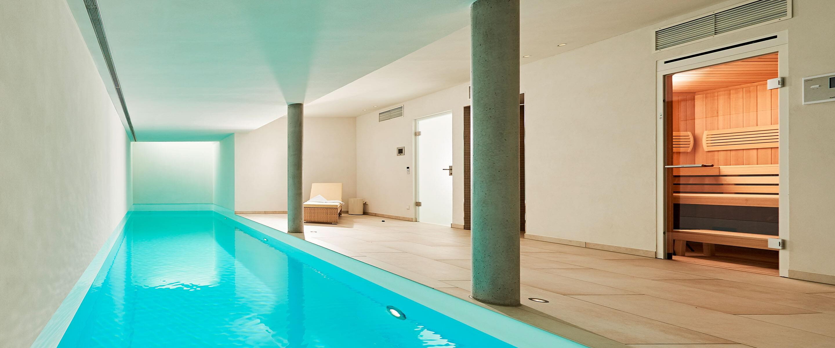 Sport, Spaß, Wellness – in der tageslichtdurchfluteten Schwimmoase im Untergeschoss ist all das möglich. Auf dem Dach des großzügigen Wellnessbereichs mit Sauna befindet sich eine Gartenterrasse fürs Sonnenbad.