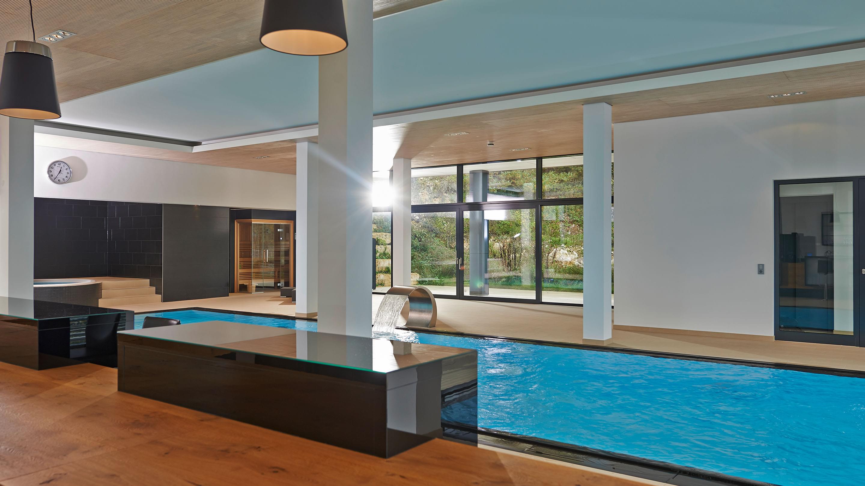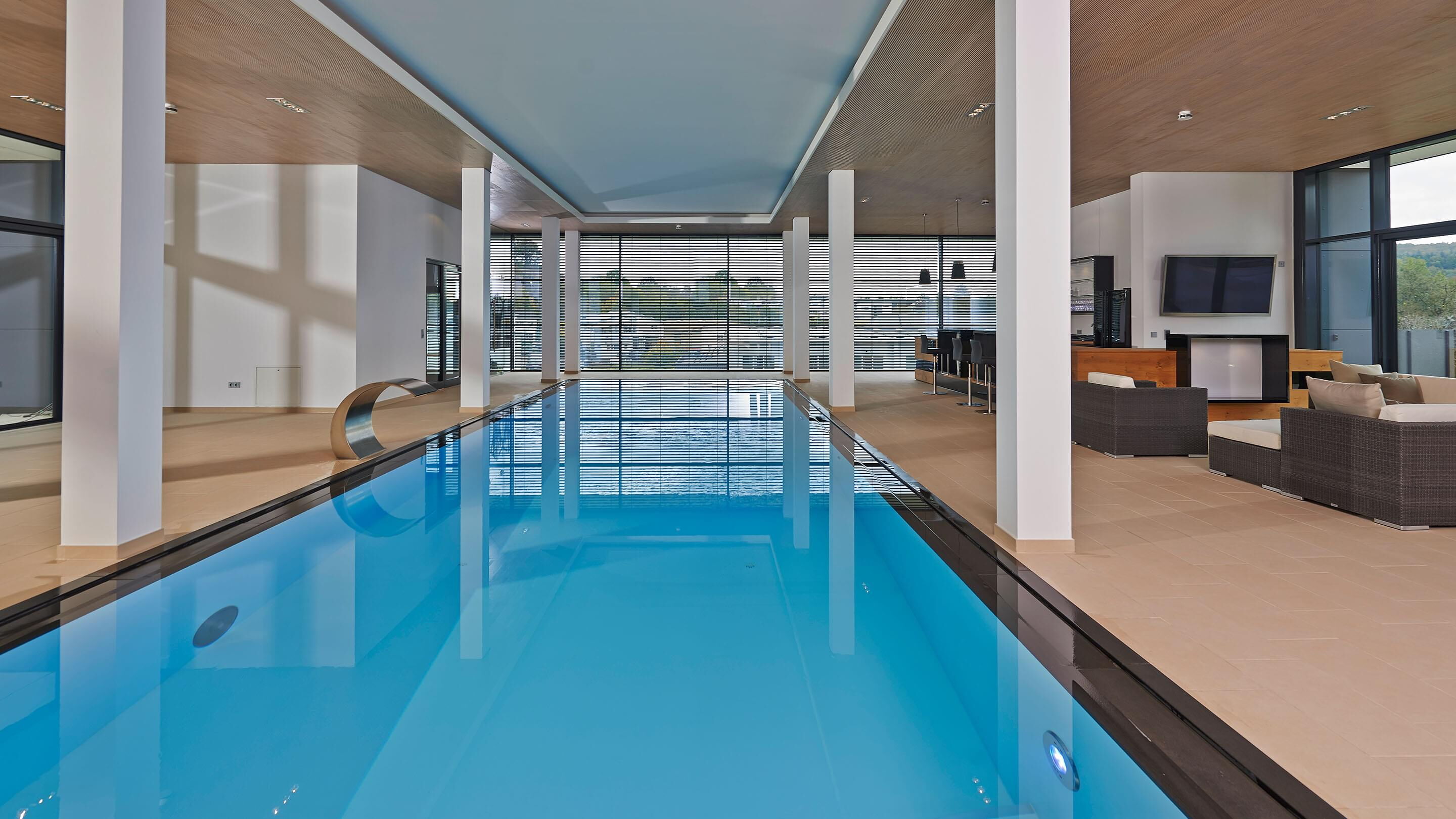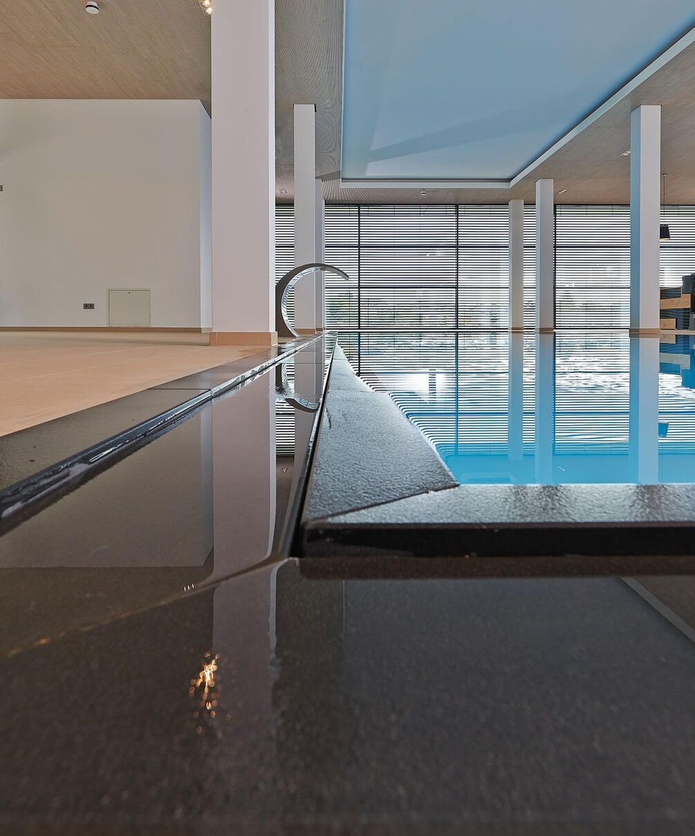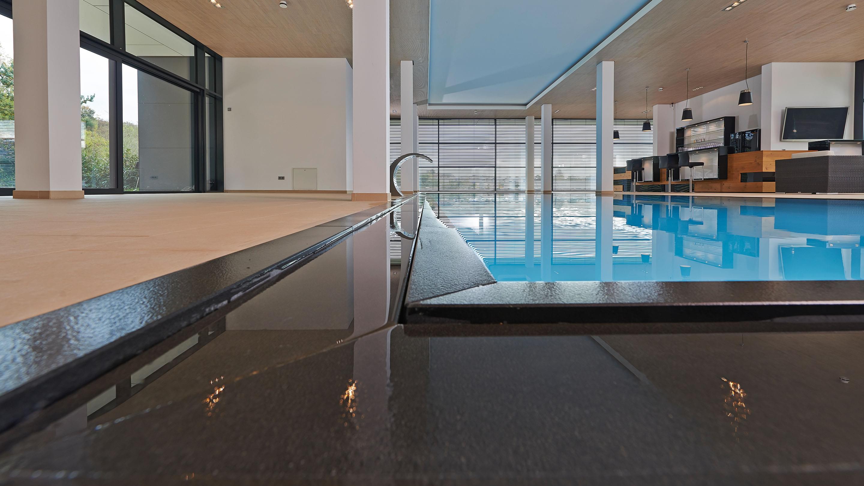 Das Ergebnis könnte beeindruckender nicht sein! Hell und geräumig präsentiert sich die Badelandschaft um das 14,5 x 4 m große Schwimmbecken mit Ospa-PowerSwim-3-Gegenstromanlage und LED-Unterwasserscheinwerfern. Große Fensterfronten sorgen für wettergeschütztes Freibad-Feeling, hochwertige Materialien wie schwarzer Naturstein schaffen exklusives Flair. Sogar eine komplett ausgerüstete Bar ist integriert.