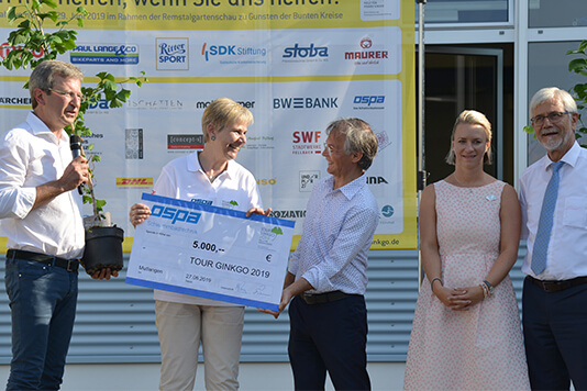 Doch nicht nur die rund 130 radelnden Teilnehmerinnen und Teilnehmer der Tour, darunter auch viele Prominente, wie der ehemalige Zehnkämpfer Guido Kratschmer, die ehemalige Weltmeisterin im Kunstradfahren Iris Kurz oder auch Schauspieler Peter Schell, machten Halt bei Ospa, auch die Initiatorin der Stiftung, die die Tour Gingko jährlich ausrichtet, Christiane Eichenhofer, Landrat des Ostalbkreises Klaus Pavel und die Mutlanger Bürgermeisterin Stephanie Eßwein waren bei der feierlichen Überreichung des Spendenschecks durch die Geschäftsführer Michael und Stefan Pauser auf dem Ospa-Firmengelände anwesend.