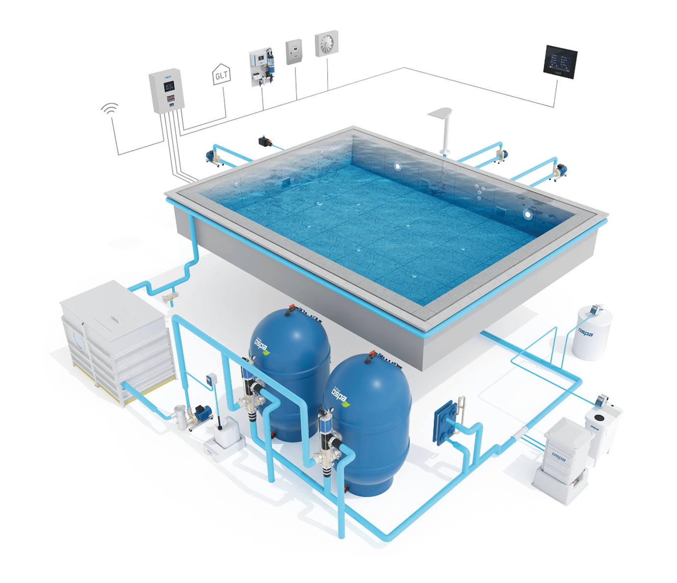 Die Wasseraufbereitungsanlagen von Ospa arbeiten energieeffizient und Ressourcen schonend. Bedarfsabhängige Steuerung reduziert den Energieverbrauch, wenn die Anlage nicht benötigt wird. Zusätzlich können durch Wärmerückgewinnung Energien aus dem Whirlpool-Betrieb für das Heizen des Pools verwendet werden.