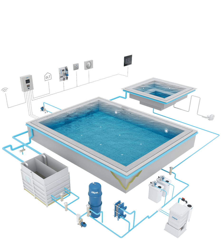 Ein besonders exklusives Bade- und Erholungserlebnis bietet die Schwimmbad-Whirlpool-Kombination von Ospa. Hier werden Schwimmbad und Whirlpool mit einer gemeinsamen Wasseraufbereitungsanlage, bestehend aus Komponenten wie Poolfilter und Poolheizung, betrieben. Kompromisse bei der Wasserqualität sind dabei tabu.