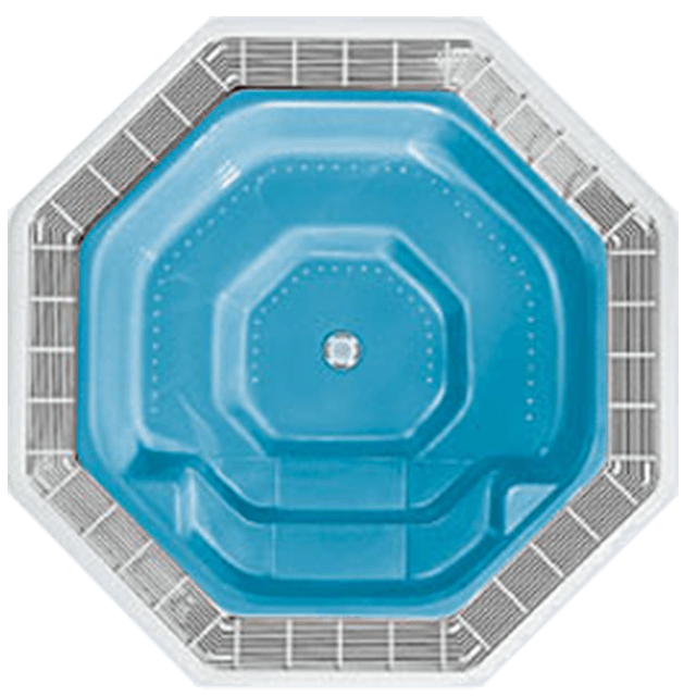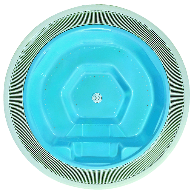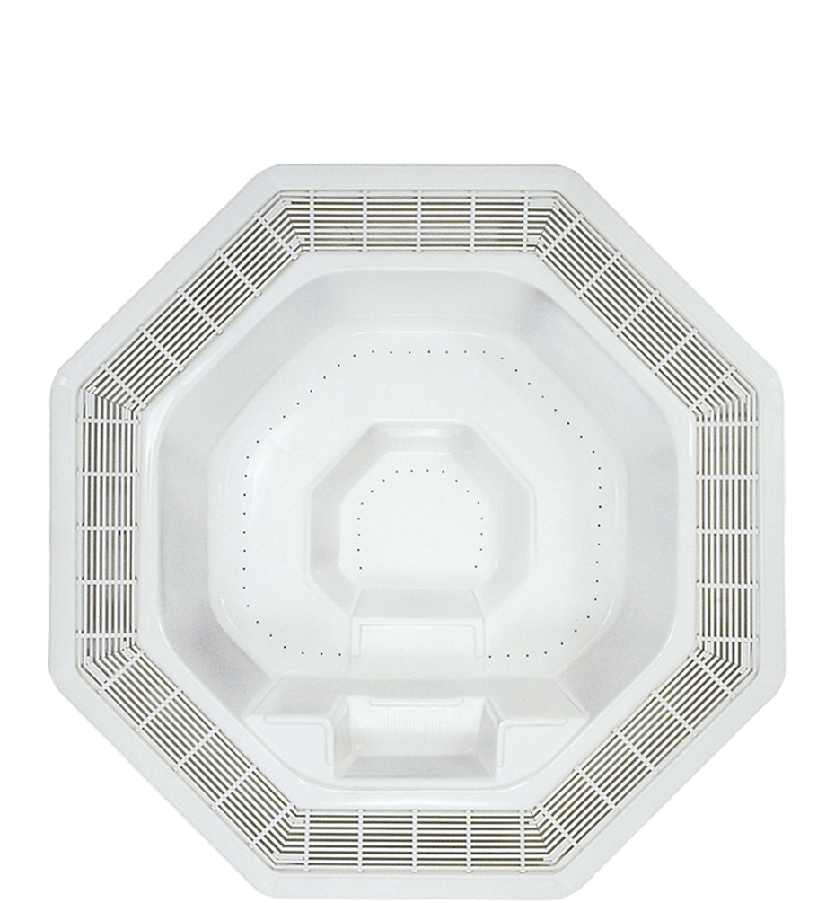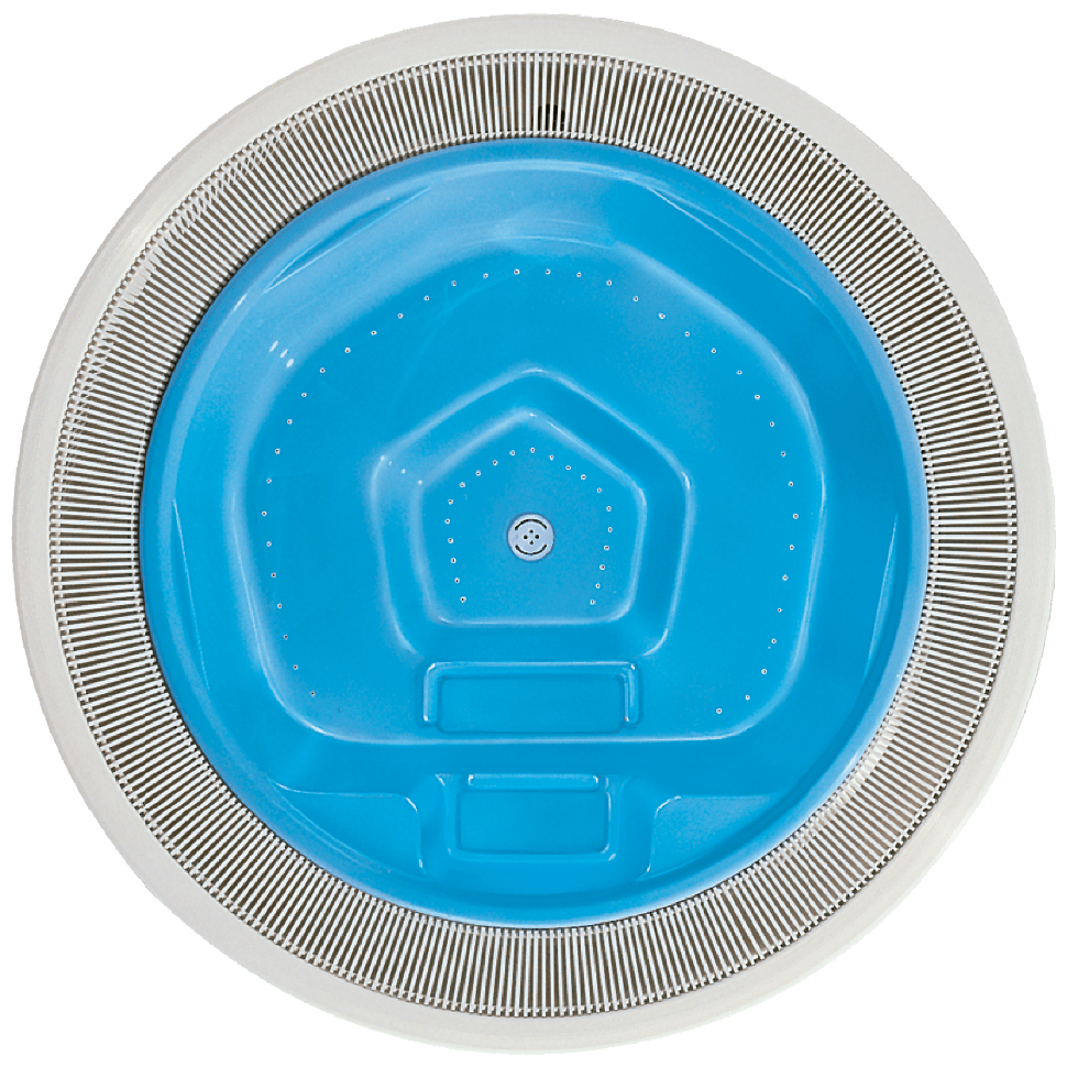 Einbaufertige Becken mit umlaufender Sitzbank für 4 bis 6 Personen. Oberfläche aus warmwasser- und chemikalienfestem Acryl, mit ca. 5 mm Glasfaser/Polyester verstärkt, mit ca. 15 mm Polyurethanschaum isoliert und mit angebauter Überlaufrinne aus Polyester in Reinweiß RAL 901. Eingebautes Luftkanalsystem und Totalentleerung für Becken und Luftkanäle. Rinnenroste und Rinnenabläufe DN 100. Eingebautes Trägergestell mit justierbaren Füßen.